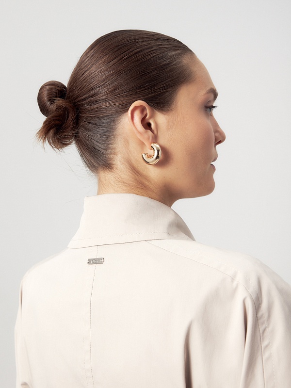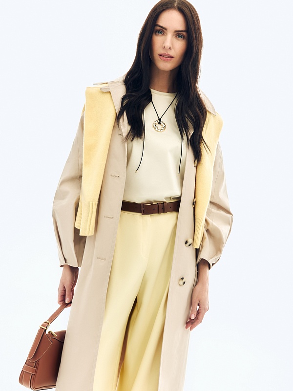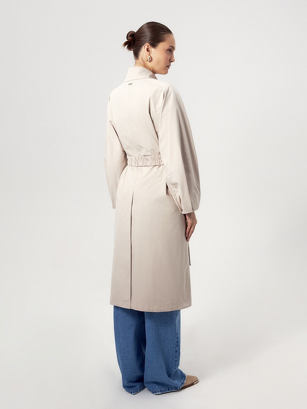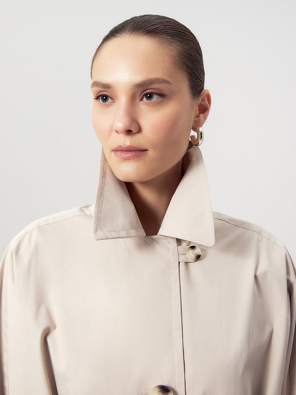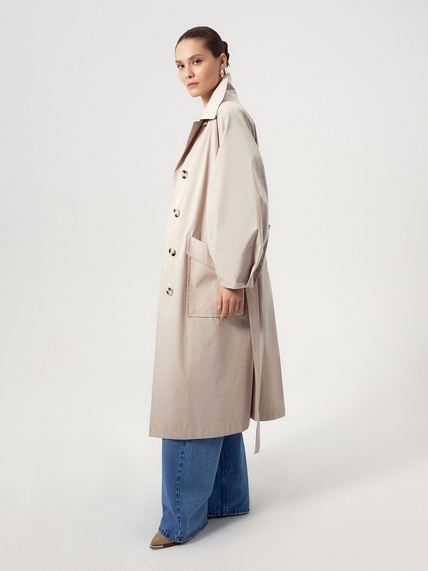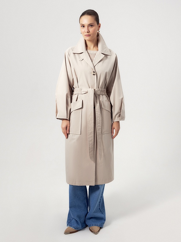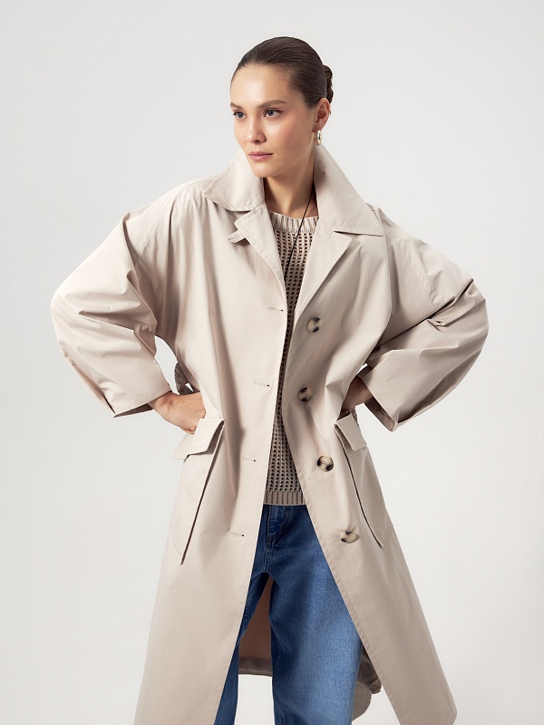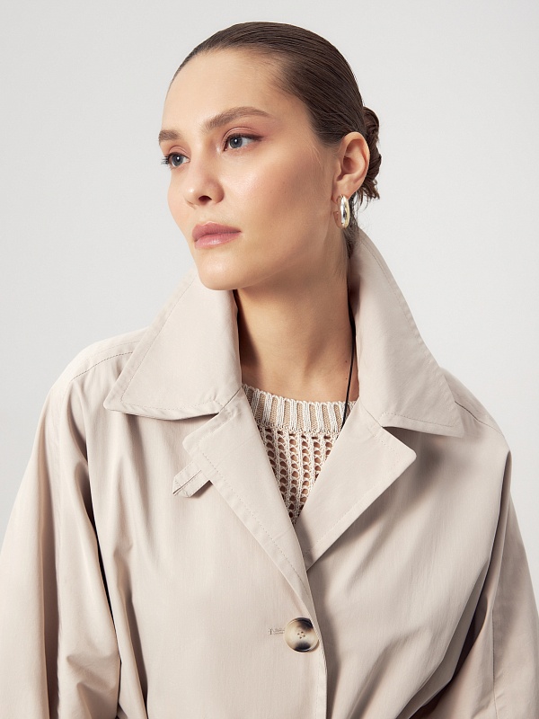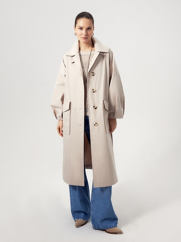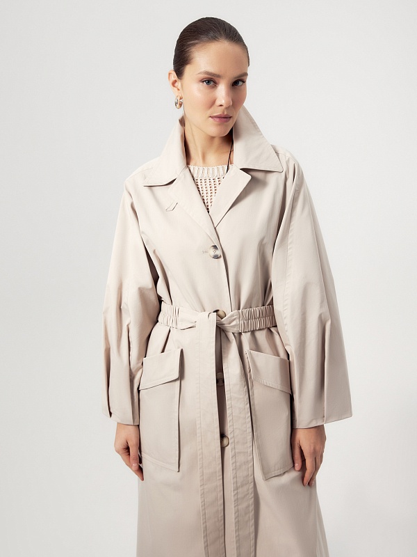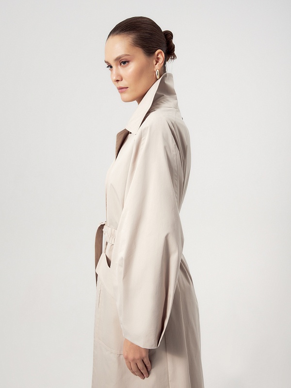 Плащ женский прямого силуэта из плащевой ткани светлого цвета "слоновая кость". Воротник стояче-отложной с лацканом (английский), застёжка на крупные пуговицы. Рукав комфортный фантазийной формы, визуально напоминающий реглан-погон, с манжетом по низу и с двумя складками на уровне швов рукава. Два накладных кармана с отложными клапанами на уровне бедер, в среднем шве спинки высокая шлица для удобства шага. Плащ на подкладке, внутри мы использовали геометрический яркий принт и отделку репсовой лентой. В комплект к изделию входит обтачной пояс на резинке из основной ткани. Плащ изготовлен из высококачественной хлопковой плащевой ткани с водоотталкивающим покрытием, надёжно защищающим от влаги и осадков.