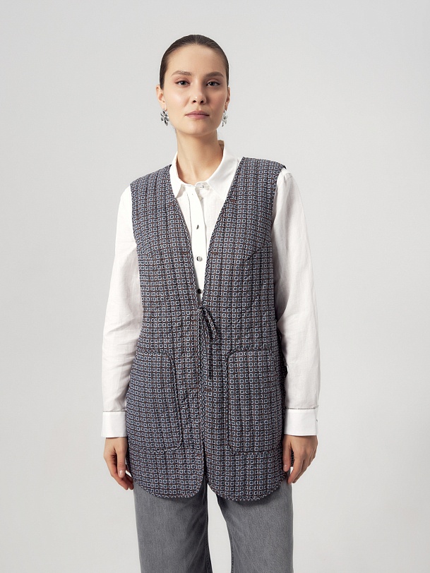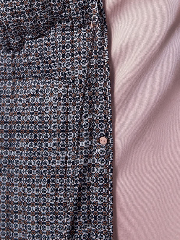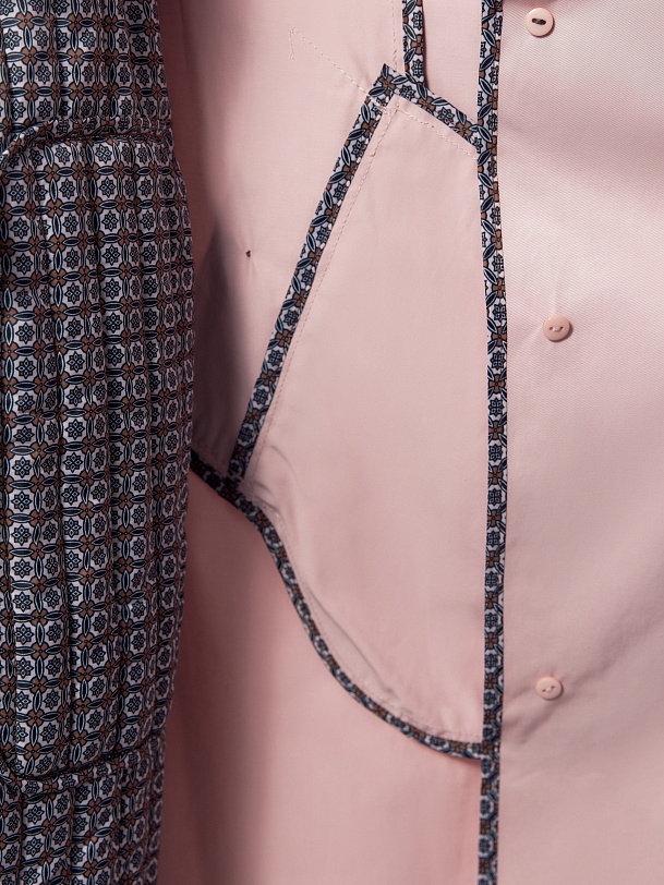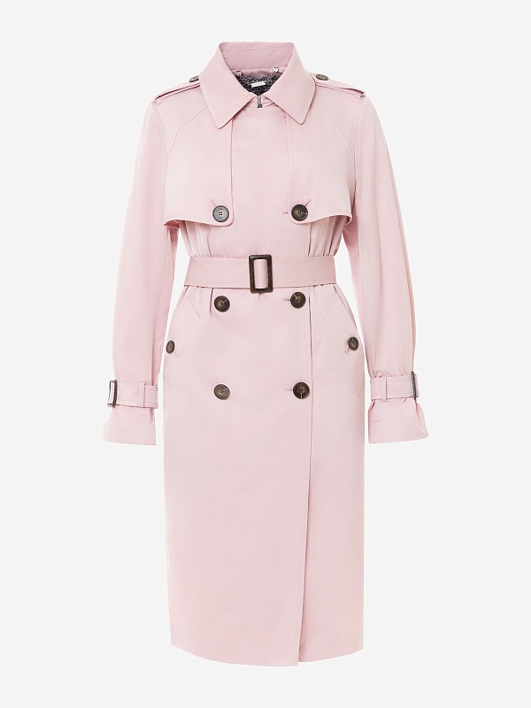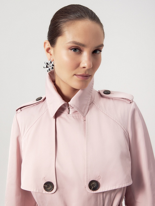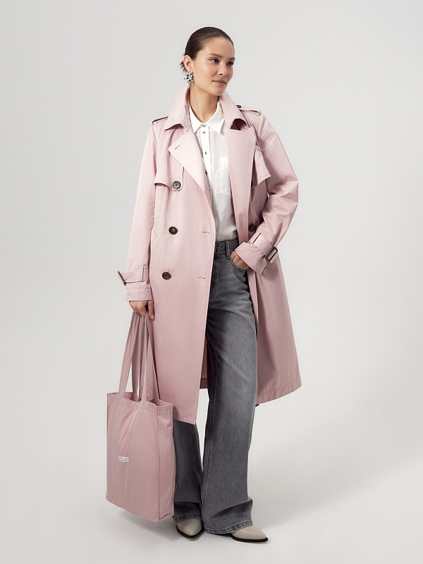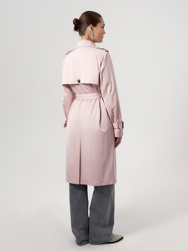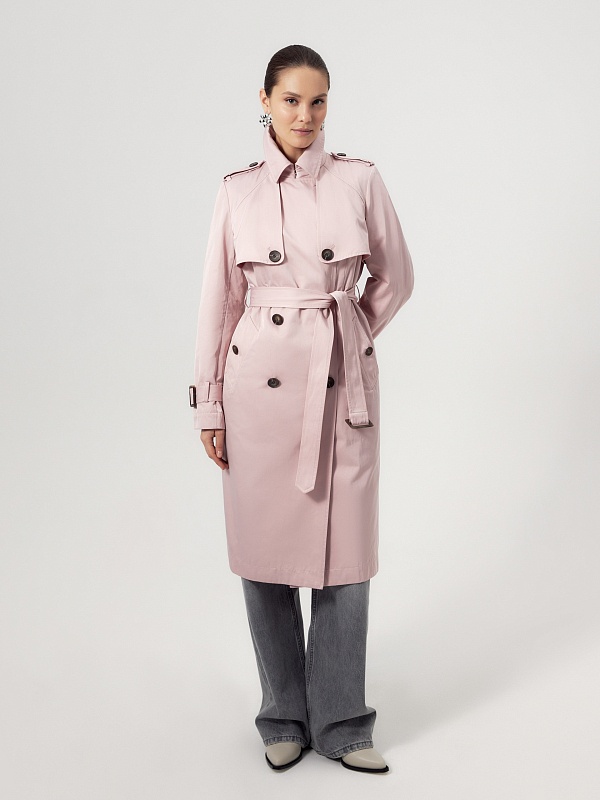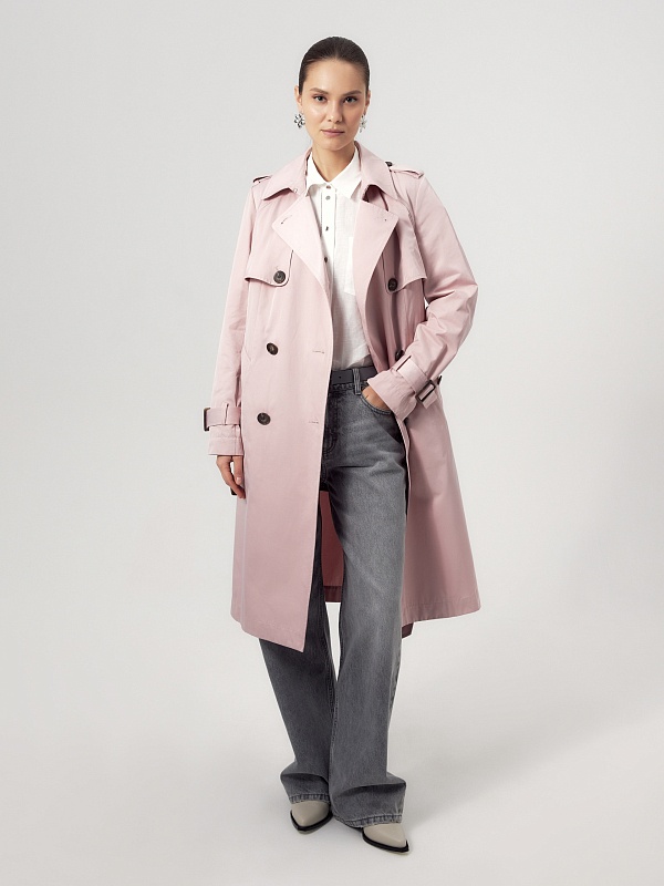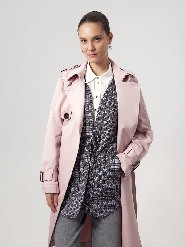 Двубортный классический плащ прямого силуэта в весеннем розовом оттенке. Длина плаща чуть ниже колена, рукав втачной, а английский воротник при застегивании на верхнюю пуговицу и крючок трансформируется в отложной и надёжно защищает от ветра. По переду и спинке декоративная отлетная кокетка, которая фиксируется на крупную пуговицу. Застёжка на крупные стильные пуговицы. По бокам расположены глубокие карманы с листочками, по низу рукава функциональные паты для регулировки объёма, а на плечах погоны из основной ткани. Плащ без подкладки. Модель дополнена съёмной подстежкой на тонком утеплителе из яркой подкладочной ткани с геометрическим принтом. Подстёжка-жилет имеет два вместительных накладных кармана и застёжку на шнур, её можно носить как самостоятельное изделие, дополнив образ с футболкой и джинсами или летним платьем. Плащ изготовлен из высококачественной хлопковой плащевой ткани с водоотталкивающим покрытием, надёжно защищающим от влаги и осадков.