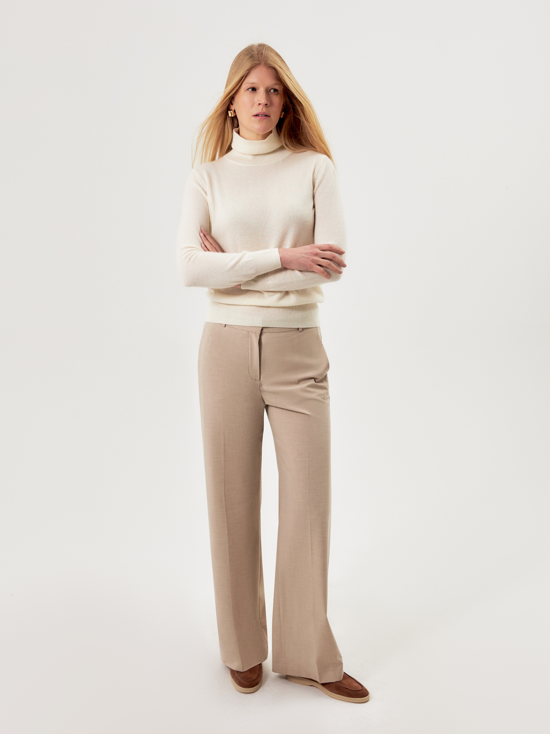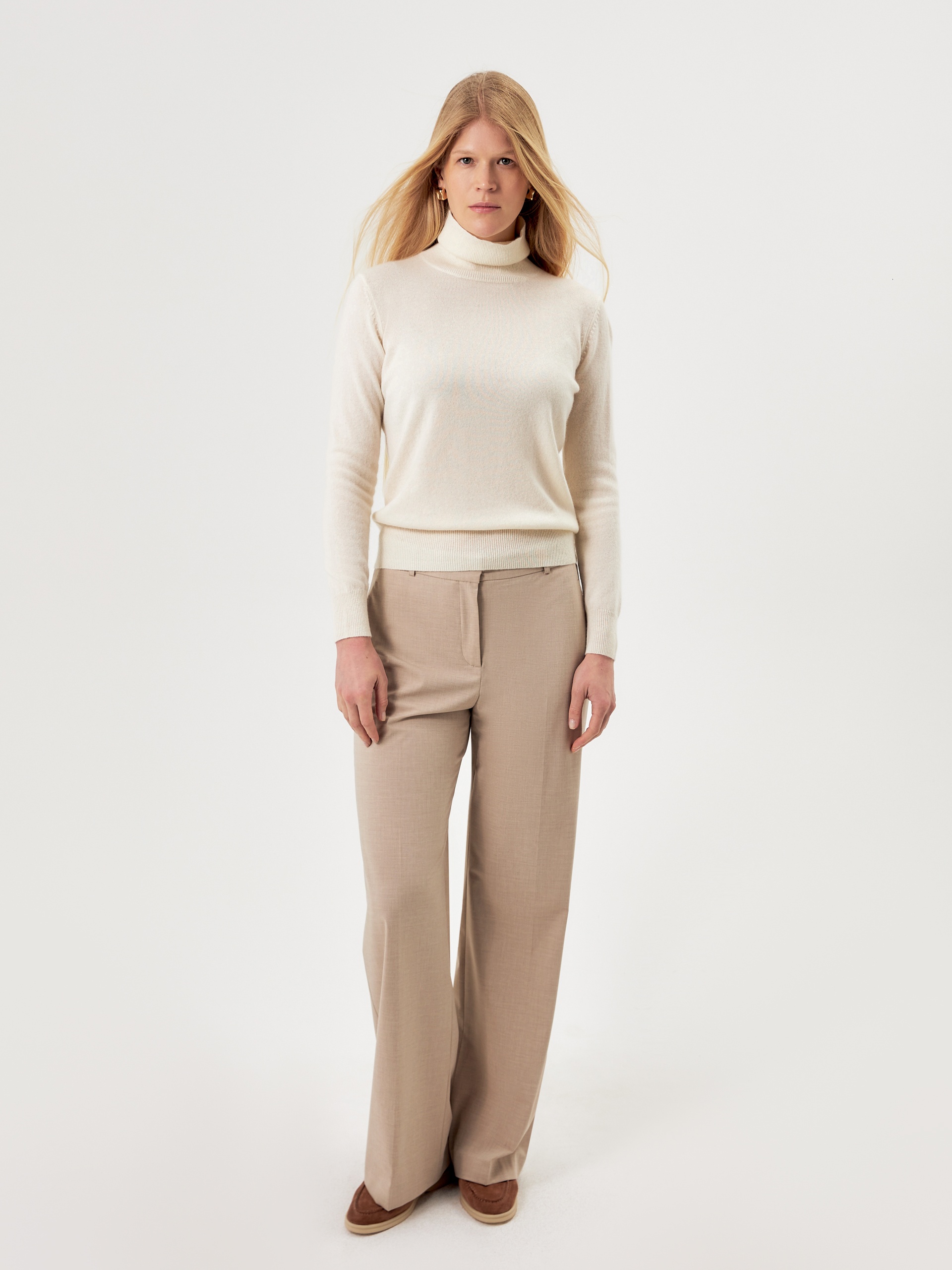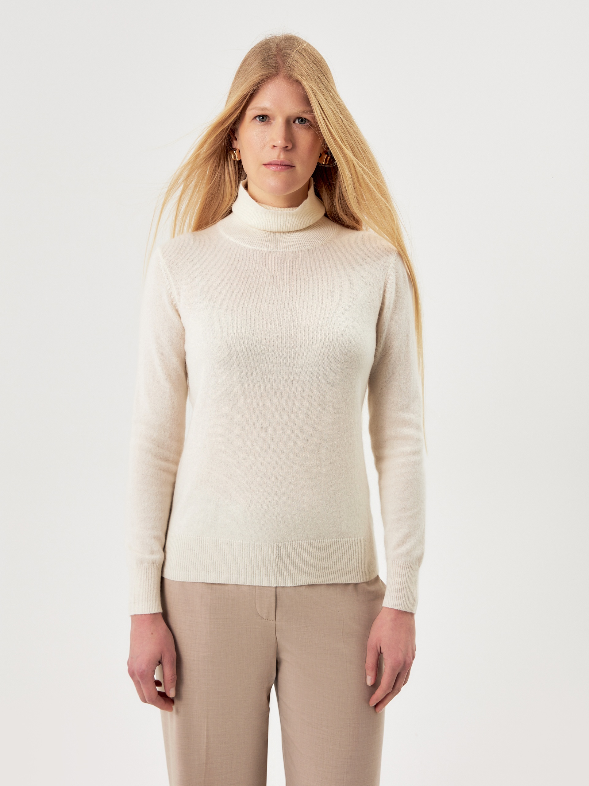Уютный кашемировый свитер с высоким воротником-стойкой и классическим втачным рукавом.