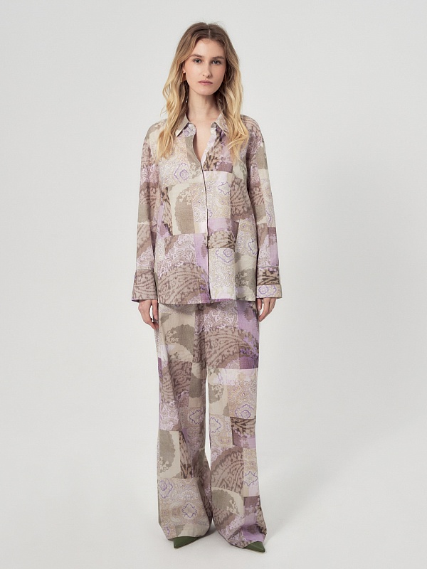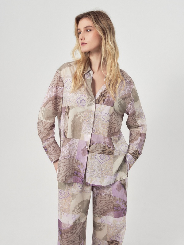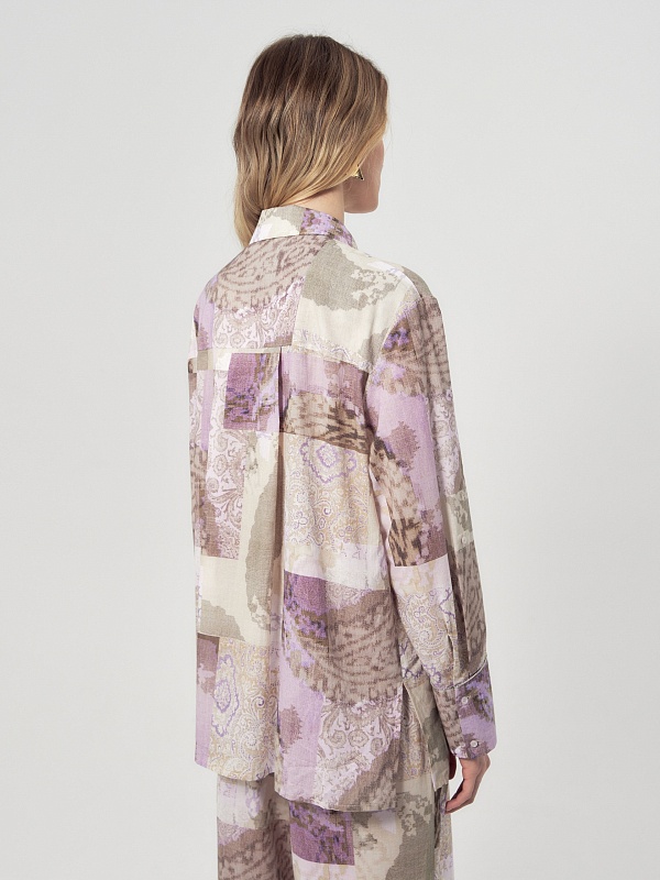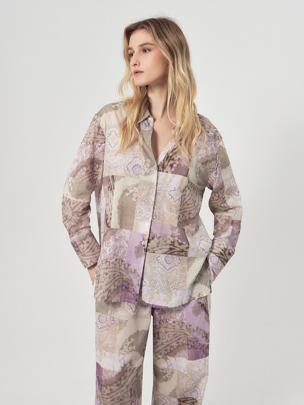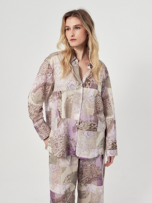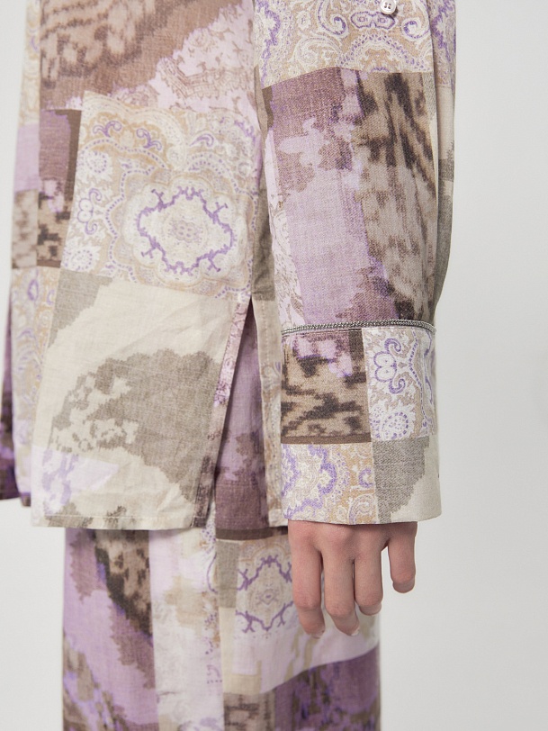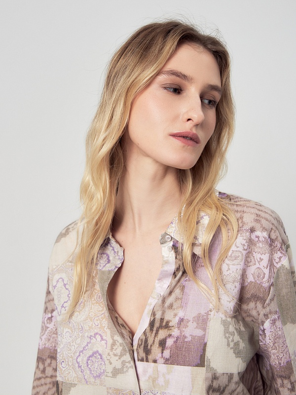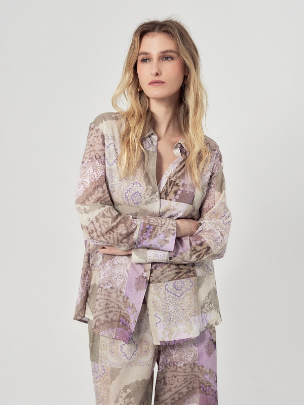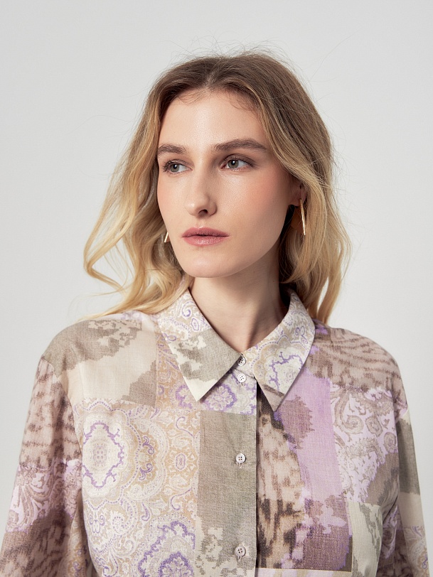 Свободная блуза из тонкой хлопковой ткани с этническим принтом в технике пэчворк. С классическим отложным воротником и пуговицами по переду. Рукав со спущенной линией плеча на классическом манжете, есть хлястик для регулировки длины. По бокам по низу изделия высокие разрезы. Романтичная блуза вольется в ваш весенний и летний гардероб.