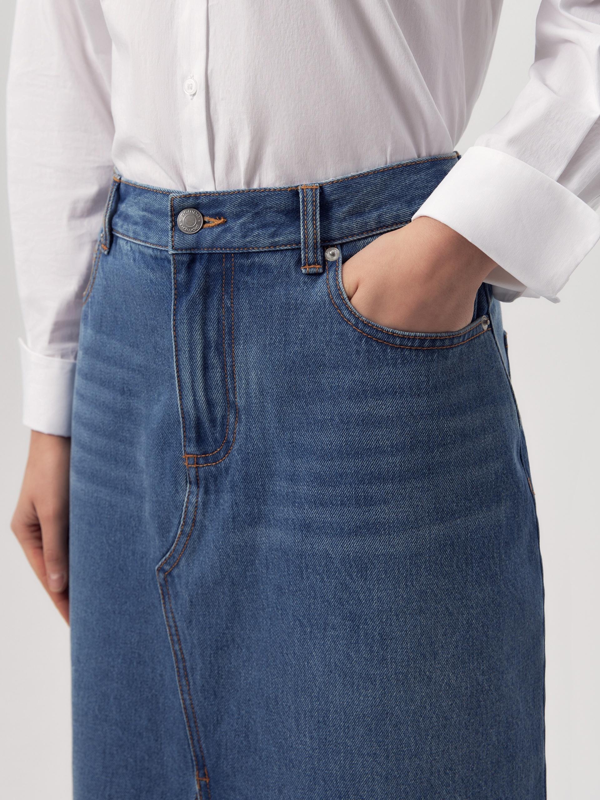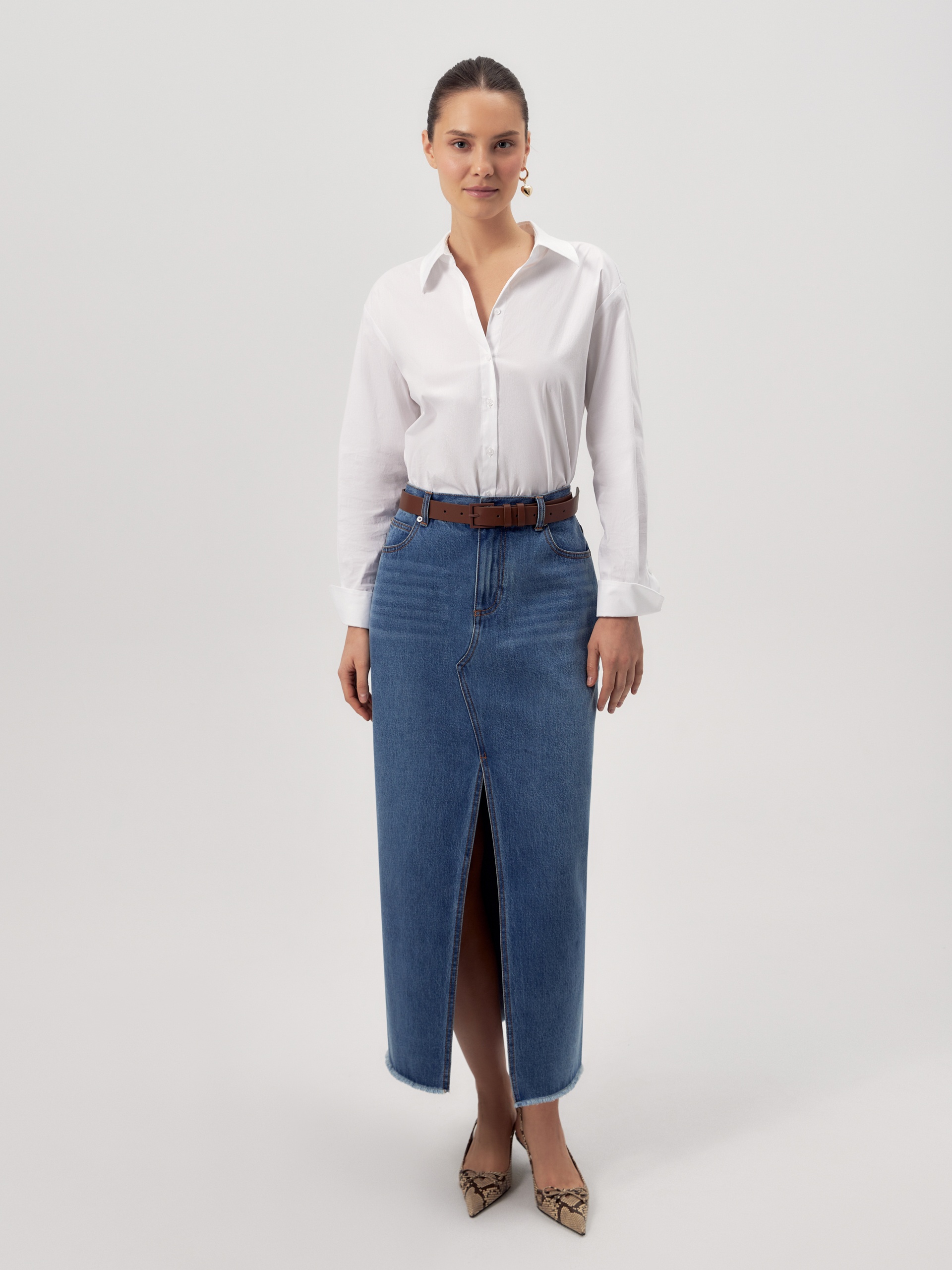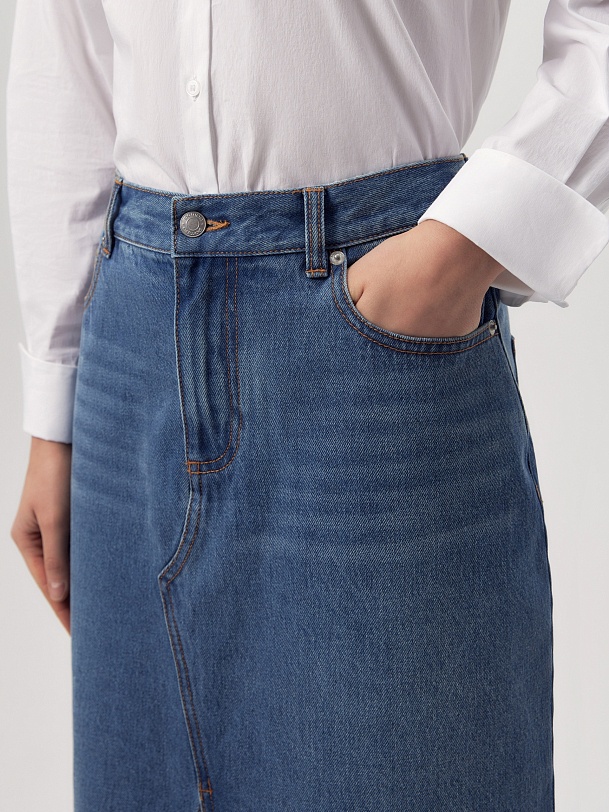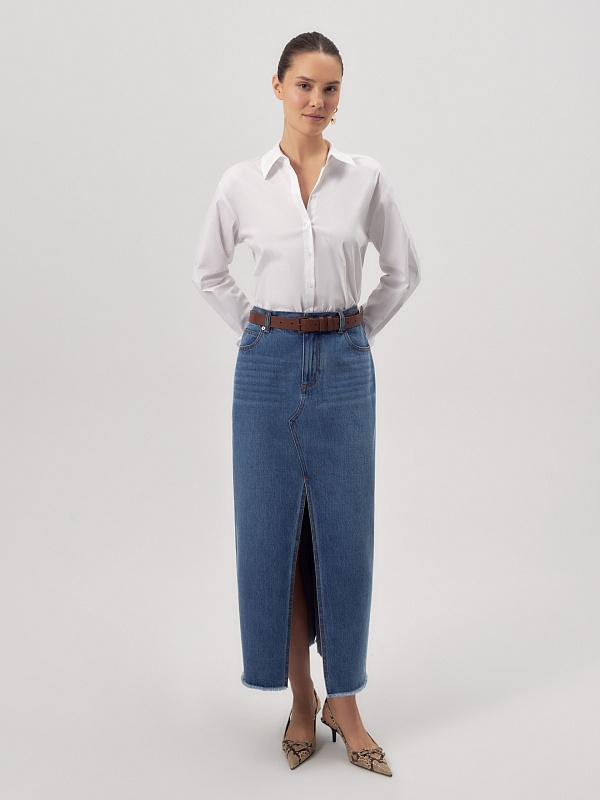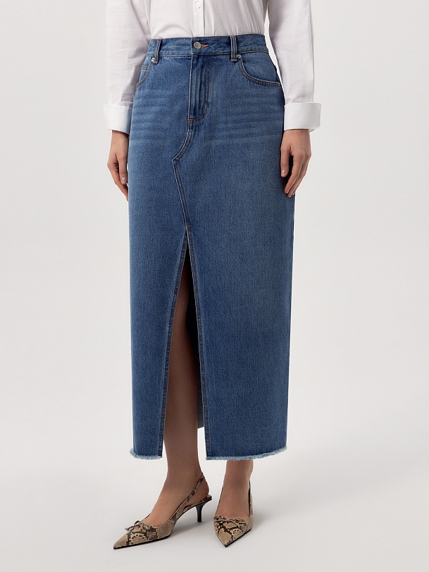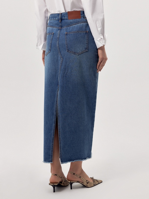 Прямая джинсовая юбка немного расклешенная к низу длиной миди. Юбка с разрезами по центральному шву переда и спинки.