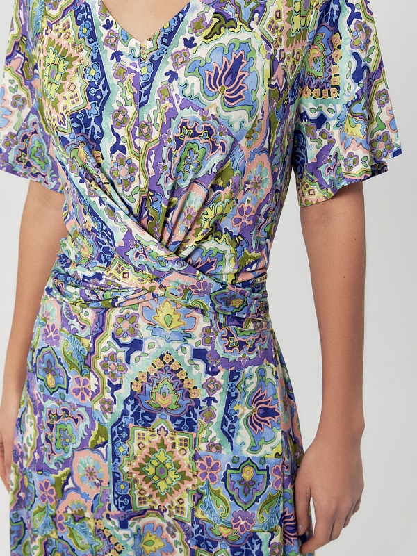 5Хорошее платье. Ткань мягкая, невесомая, очень приятная на ощупь. Цвета яркие, но в меру. В платье удобно, нигде не тянет и не мешает. Отличный вариант на лето.
