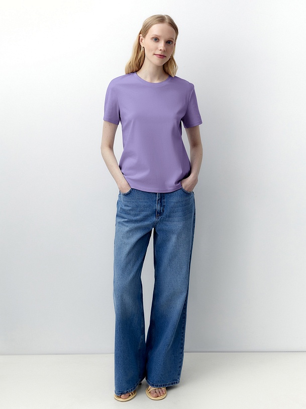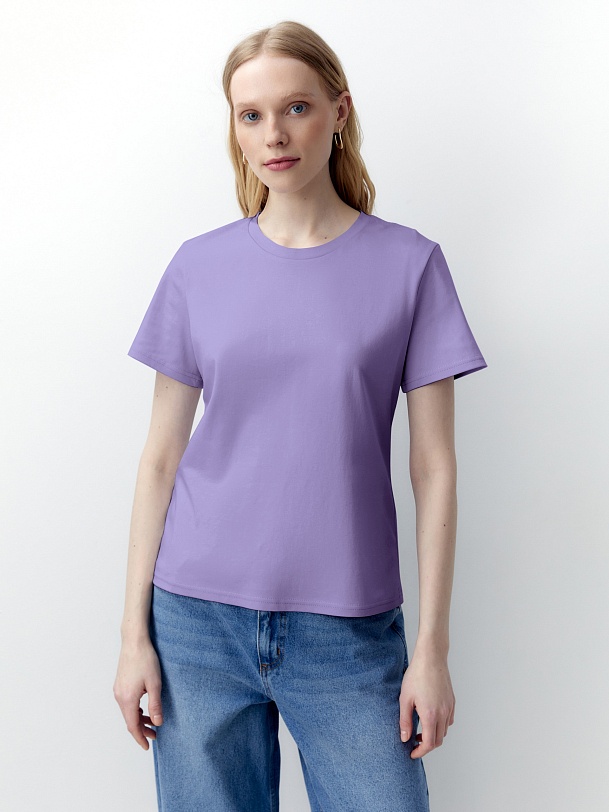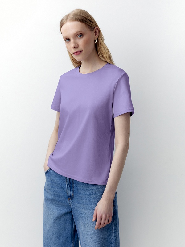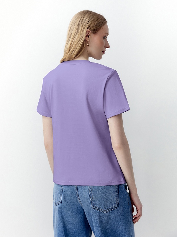 Футболка прямого силуэта нежно фиолетового цвета будет прекрасно сочетаться как с денимными изделиями, так и с классическими ансамблями. Мерсеризированный хлопок имеет шелковистый блеск и не деформируется после стирок, практически не мнется и не выцветает со временем.