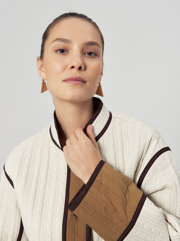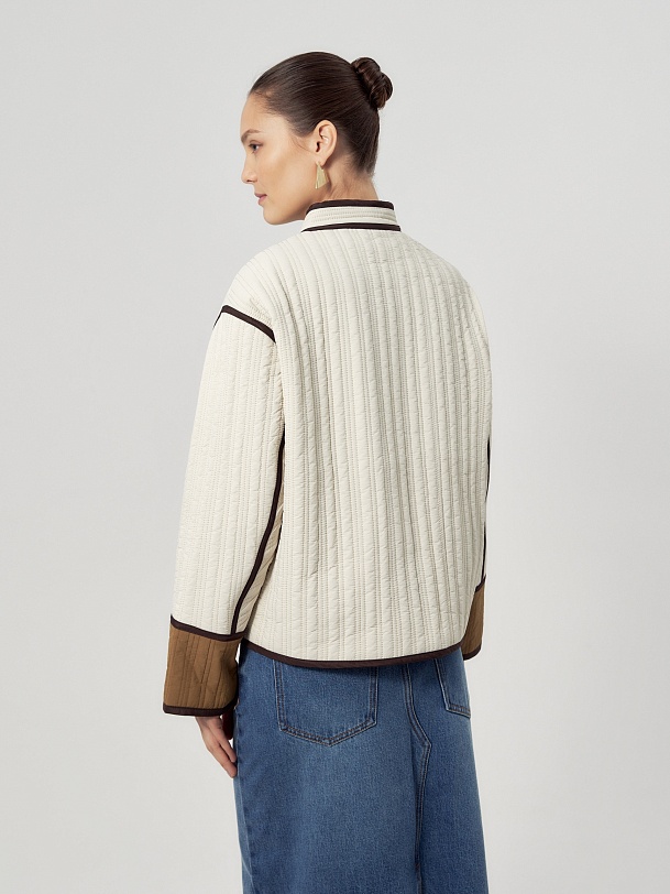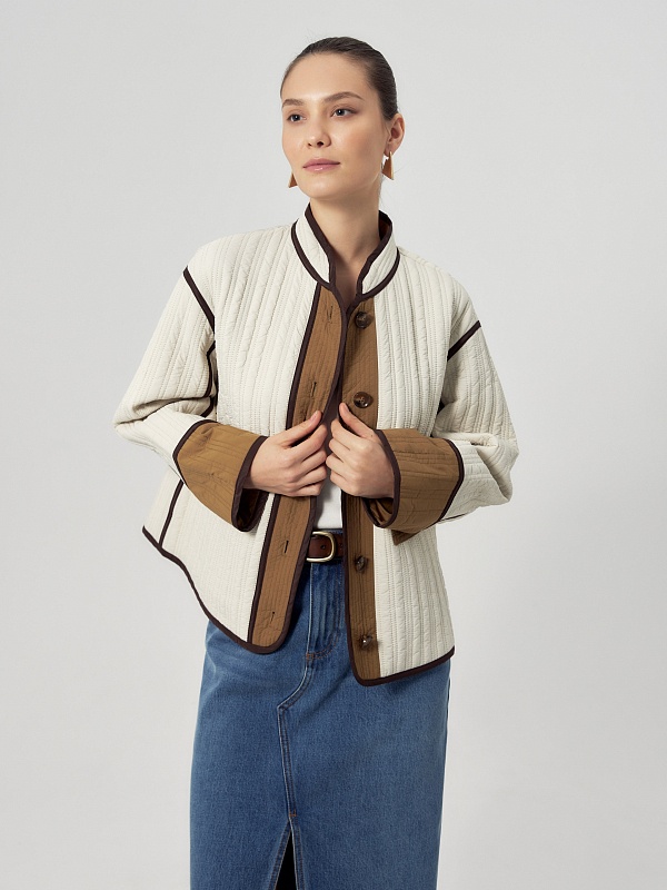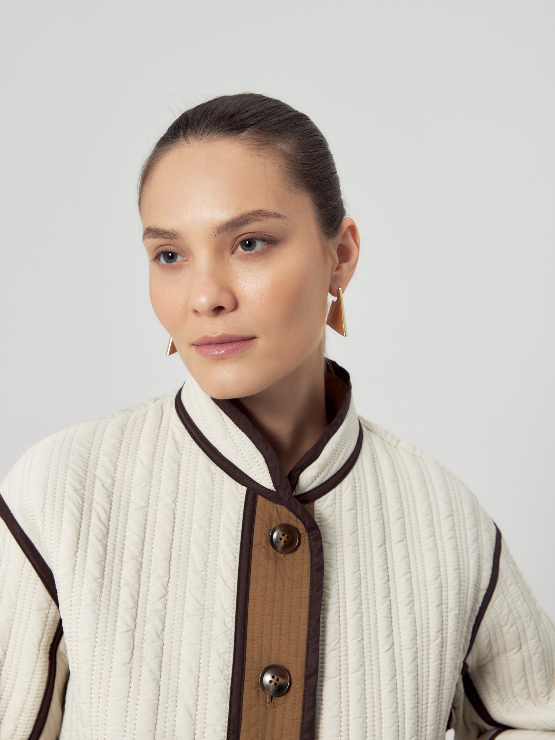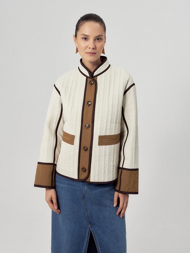 Прямой однобортный стеганный жакет молочного цвета с контрастными деталями и окантовкой коричневого цвета. Воротник-стойка, с пуговицами по борту и спущенной линией плеча. На полочке прорезные карманы-листочки. Жакет полностью на подкладке.