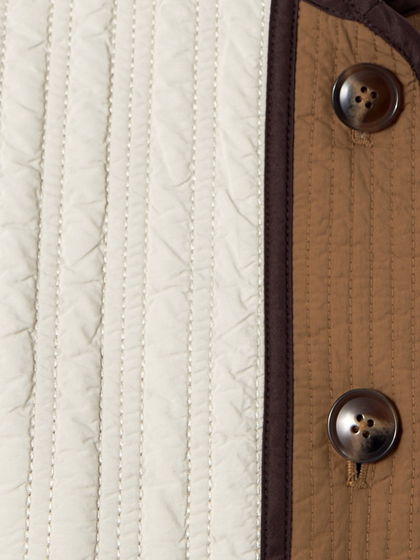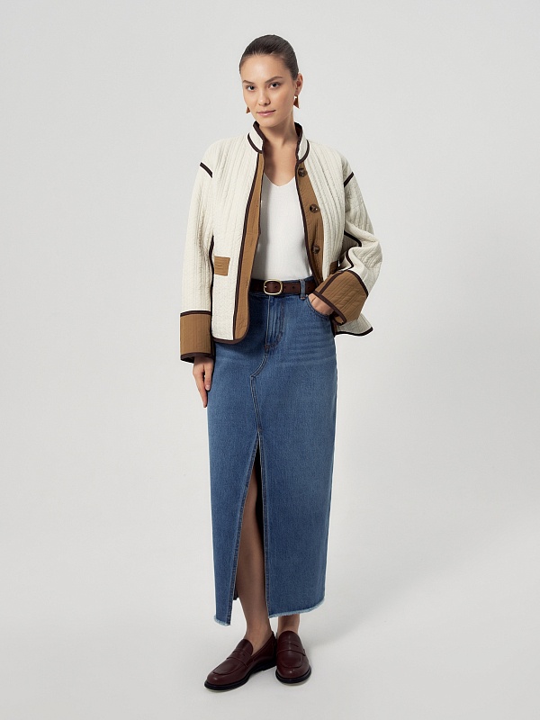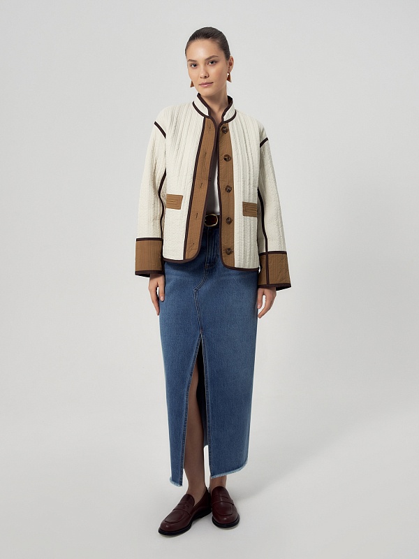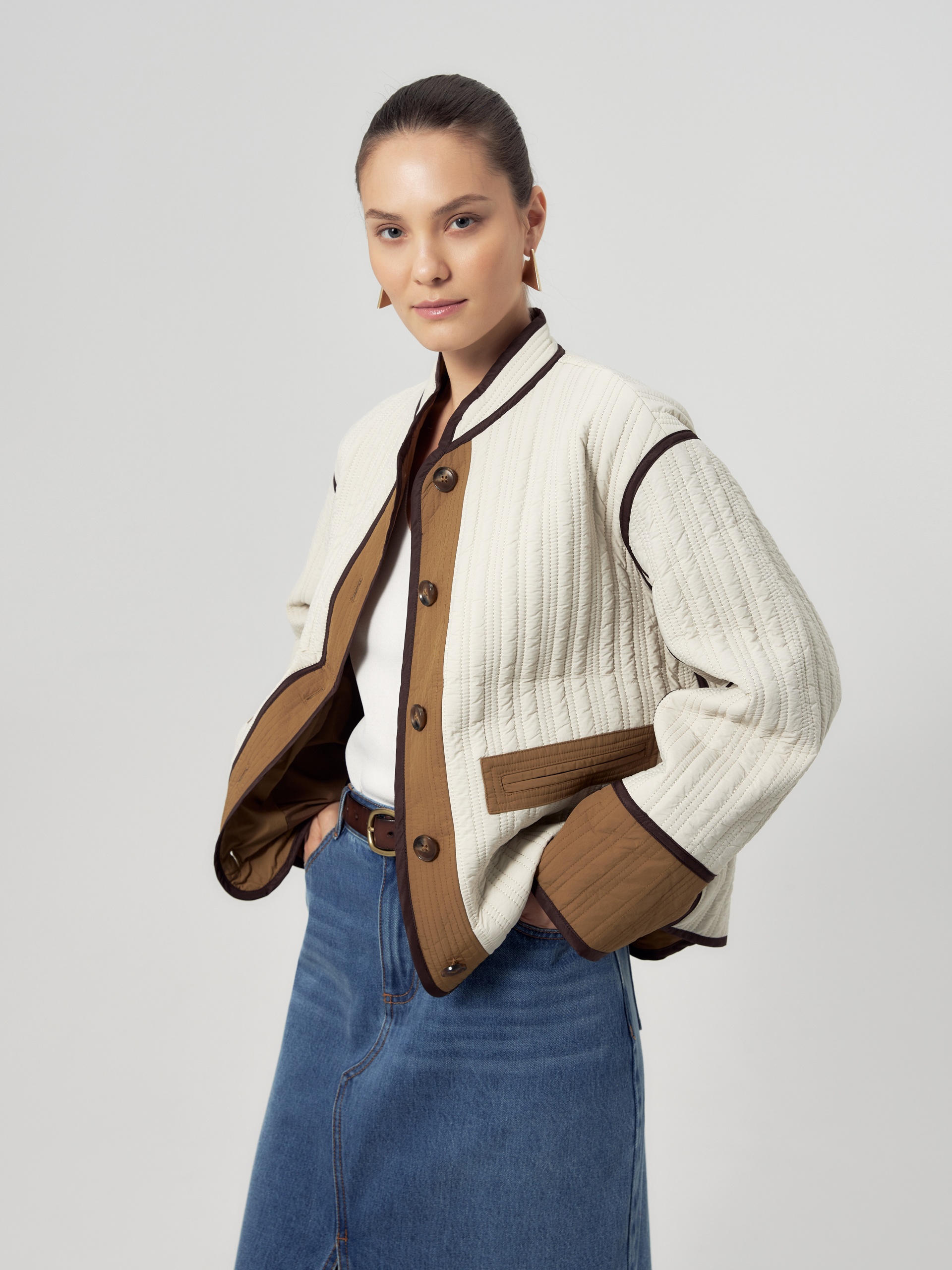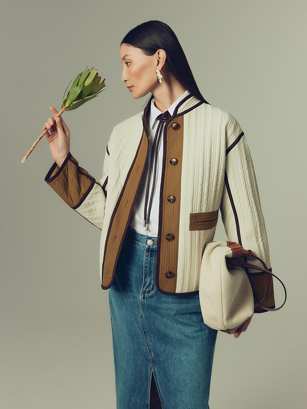 Прямой однобортный стеганный жакет молочного цвета с контрастными деталями и окантовкой коричневого цвета. Воротник-стойка, с пуговицами по борту и спущенной линией плеча. На полочке прорезные карманы-листочки. Жакет полностью на подкладке.