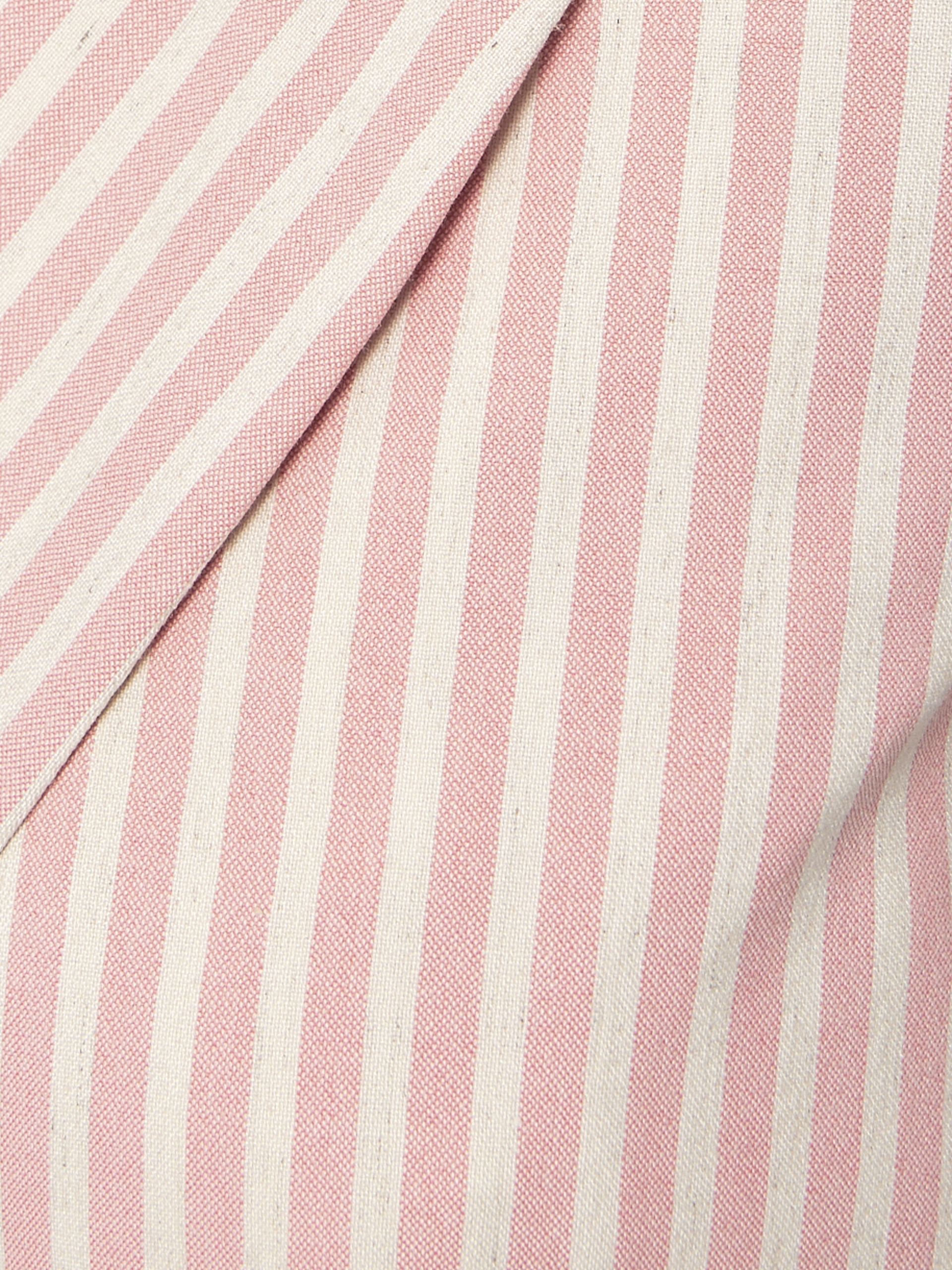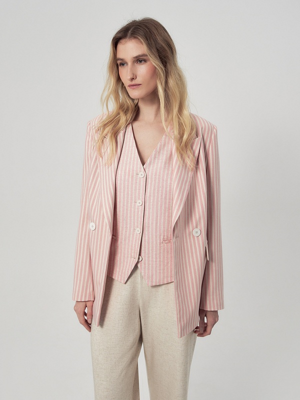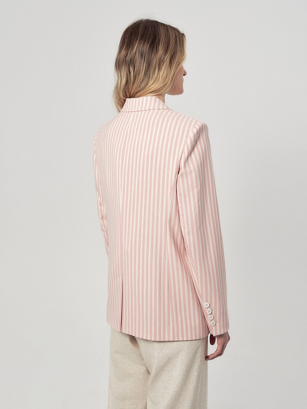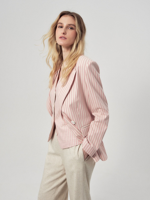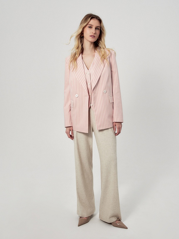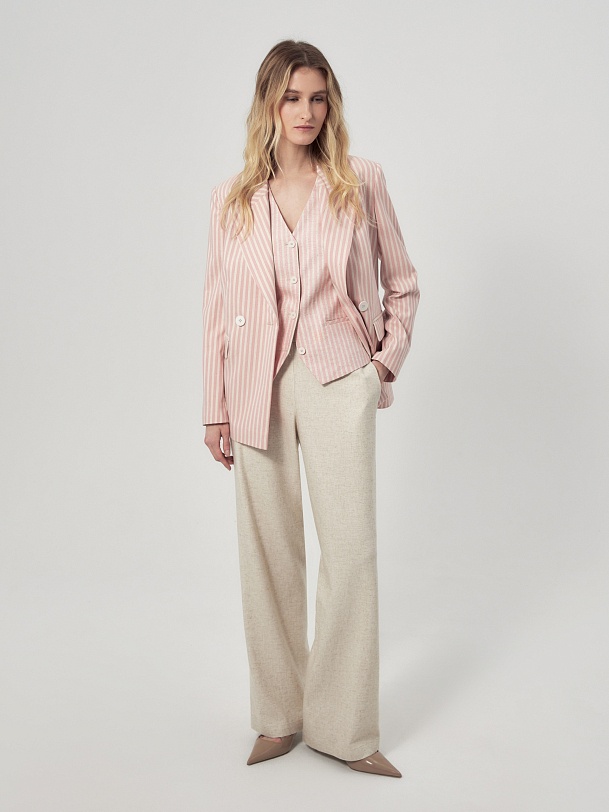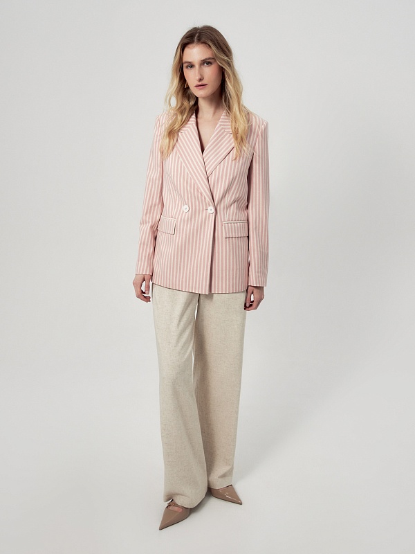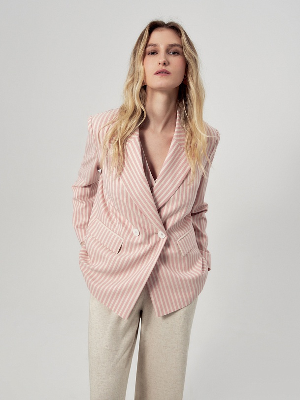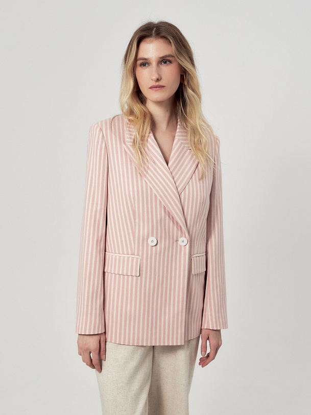 Классический прямой двубортный жакет из костюмной вискозной ткани в светло бежевом цвете с широкой розовой полоской. С прорезными карманами и клапанами. Жакет полностью на подкладке. Хорошо сочетается с юбкой из одной ткани и брюками светло бежевого цвета.