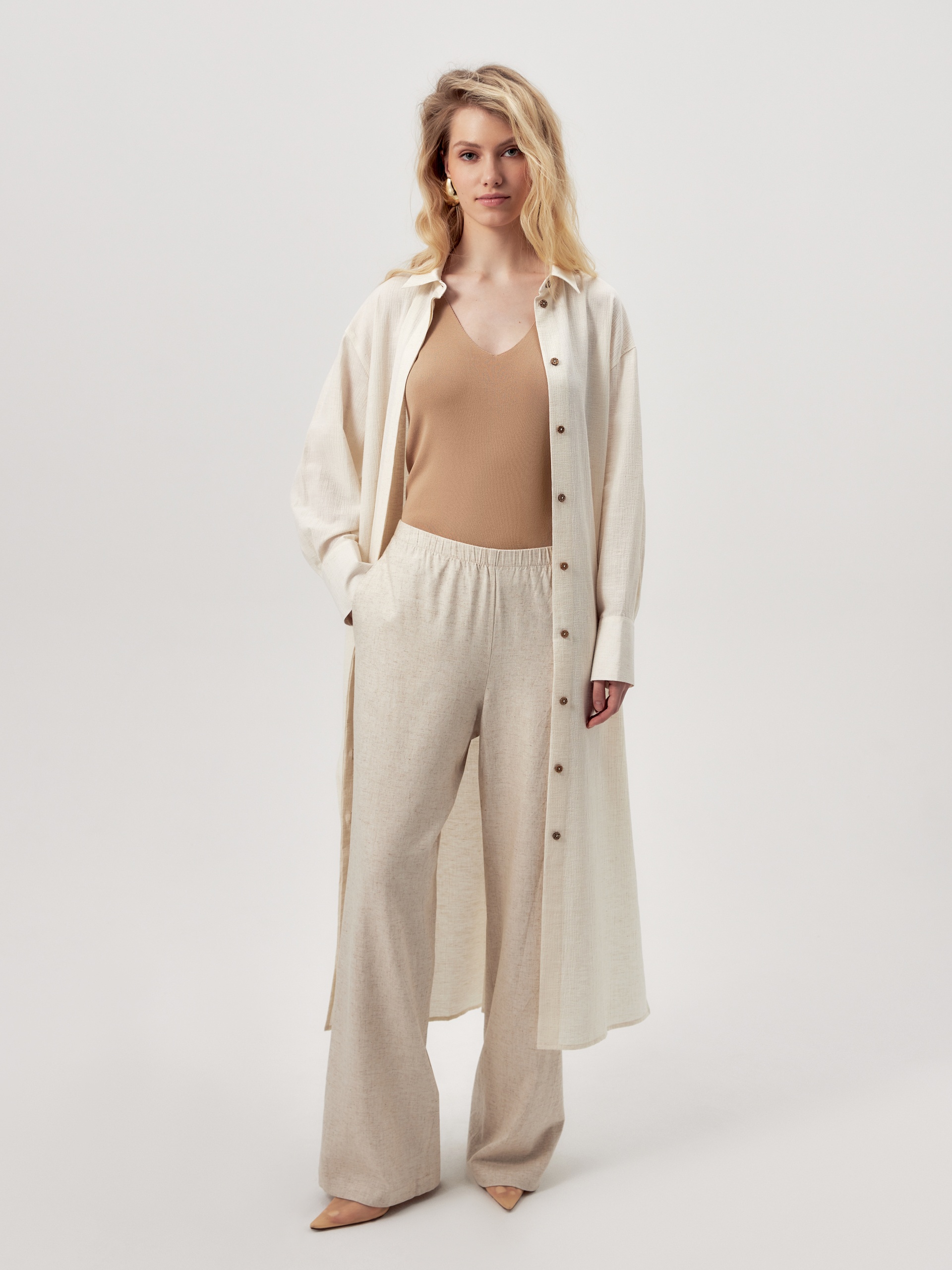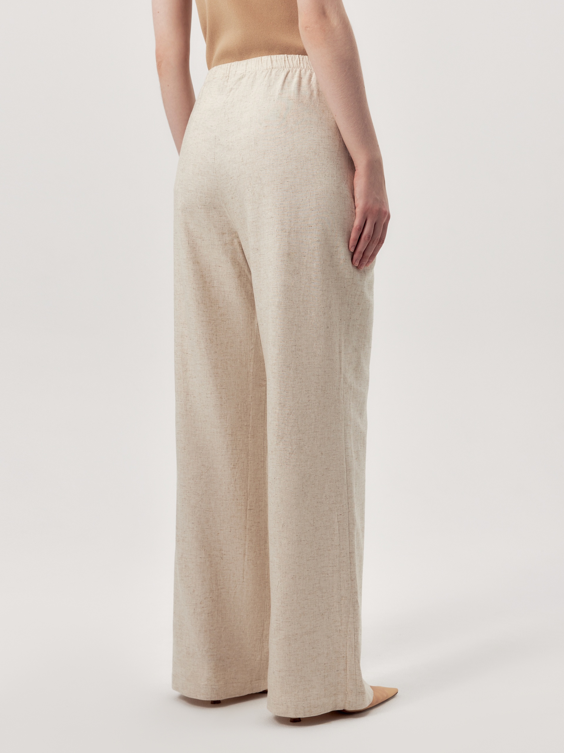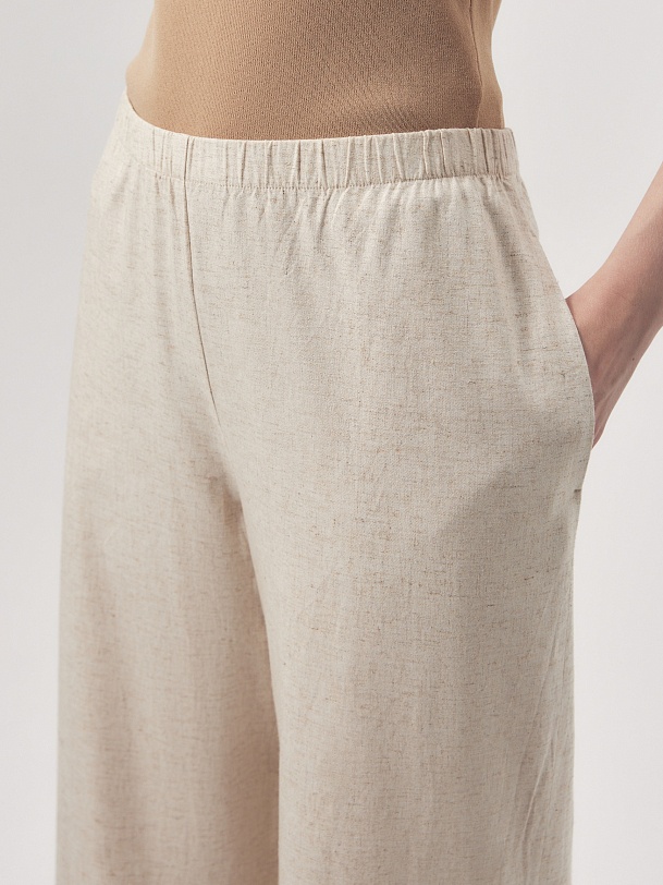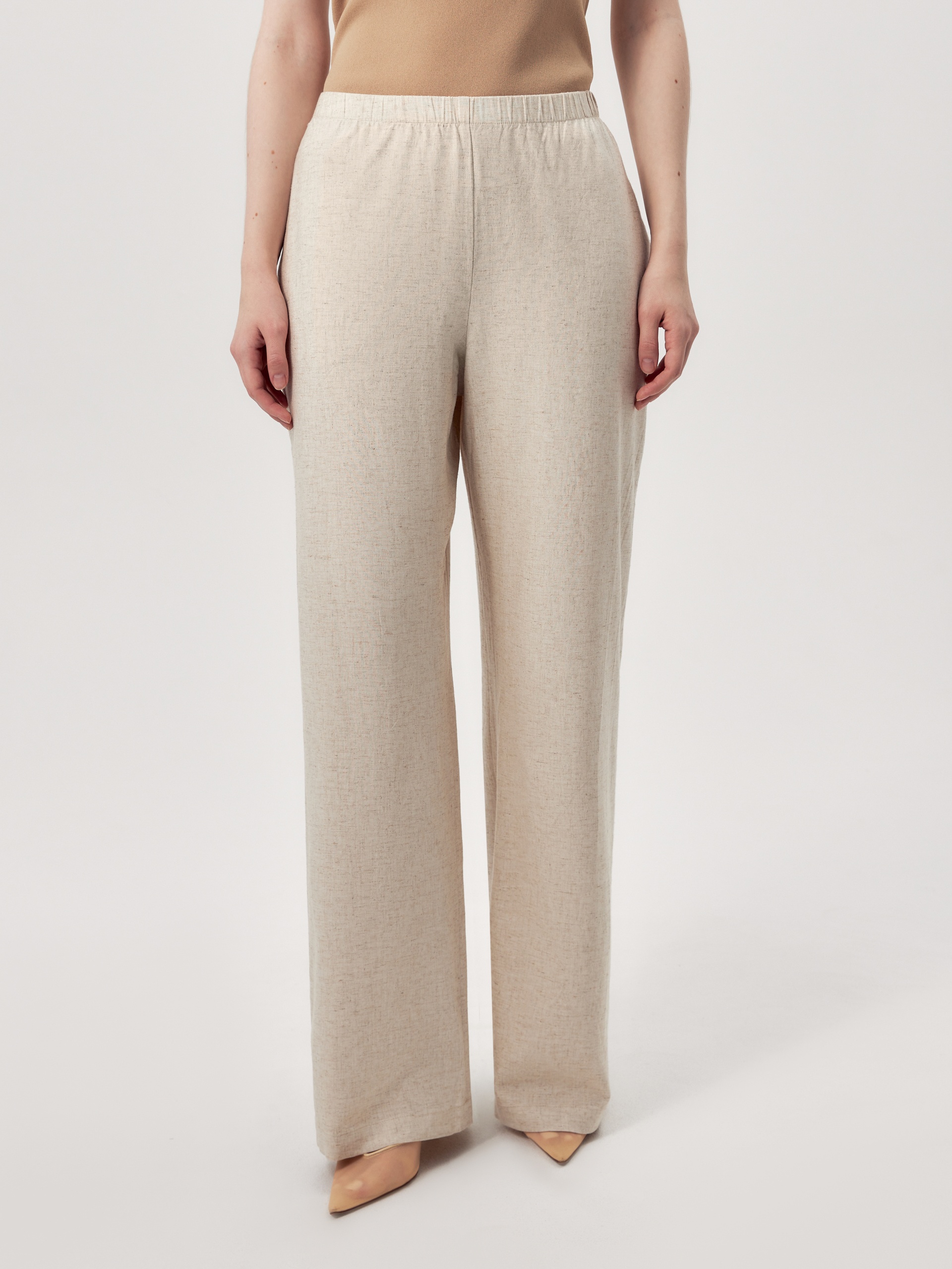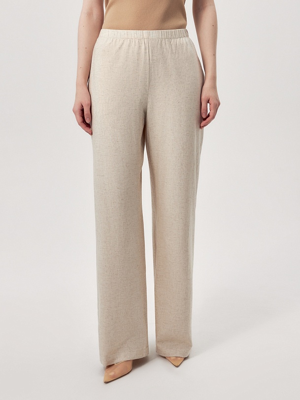 Прямые брюки из костюмной ткани с вискозой и льном светло бежевого цвета. Пояс на резинке позволяет чувствовать себя комфортно и расслабленно. Брюки с карманами в боковых швах.