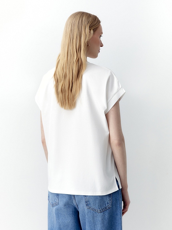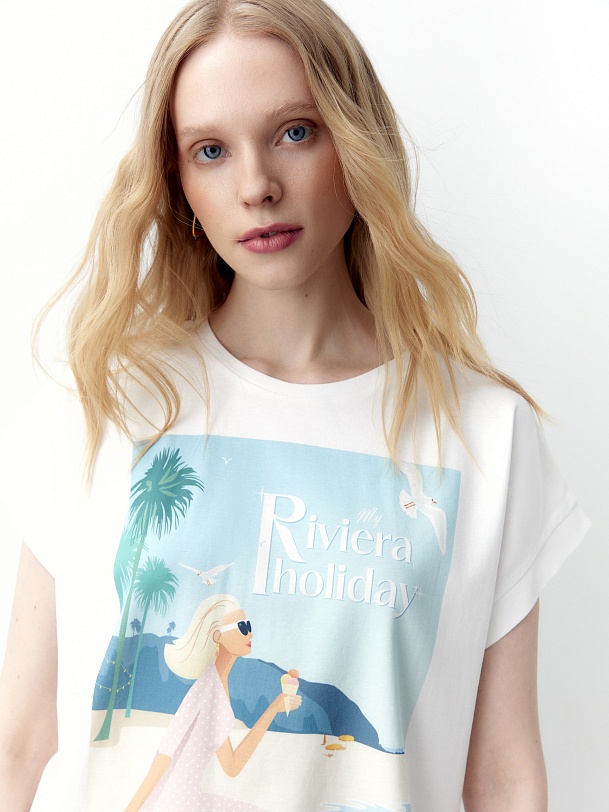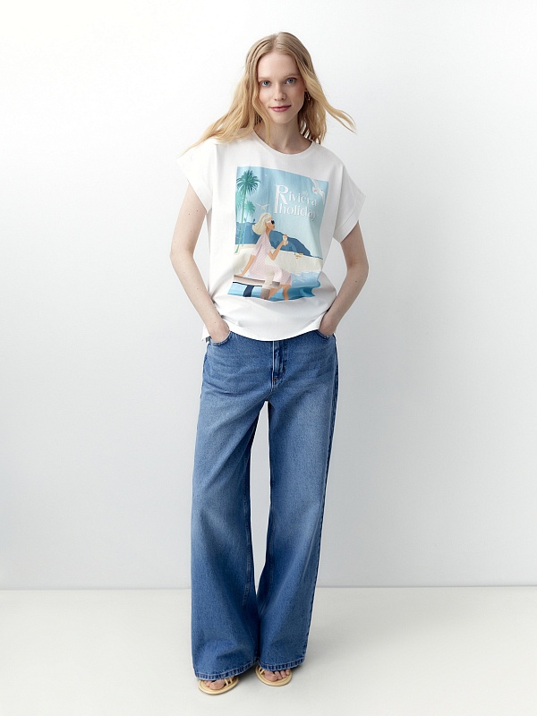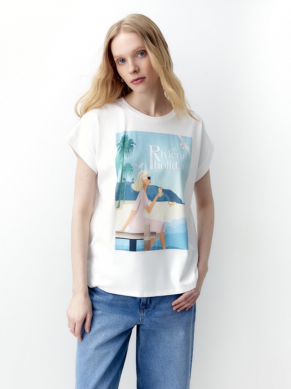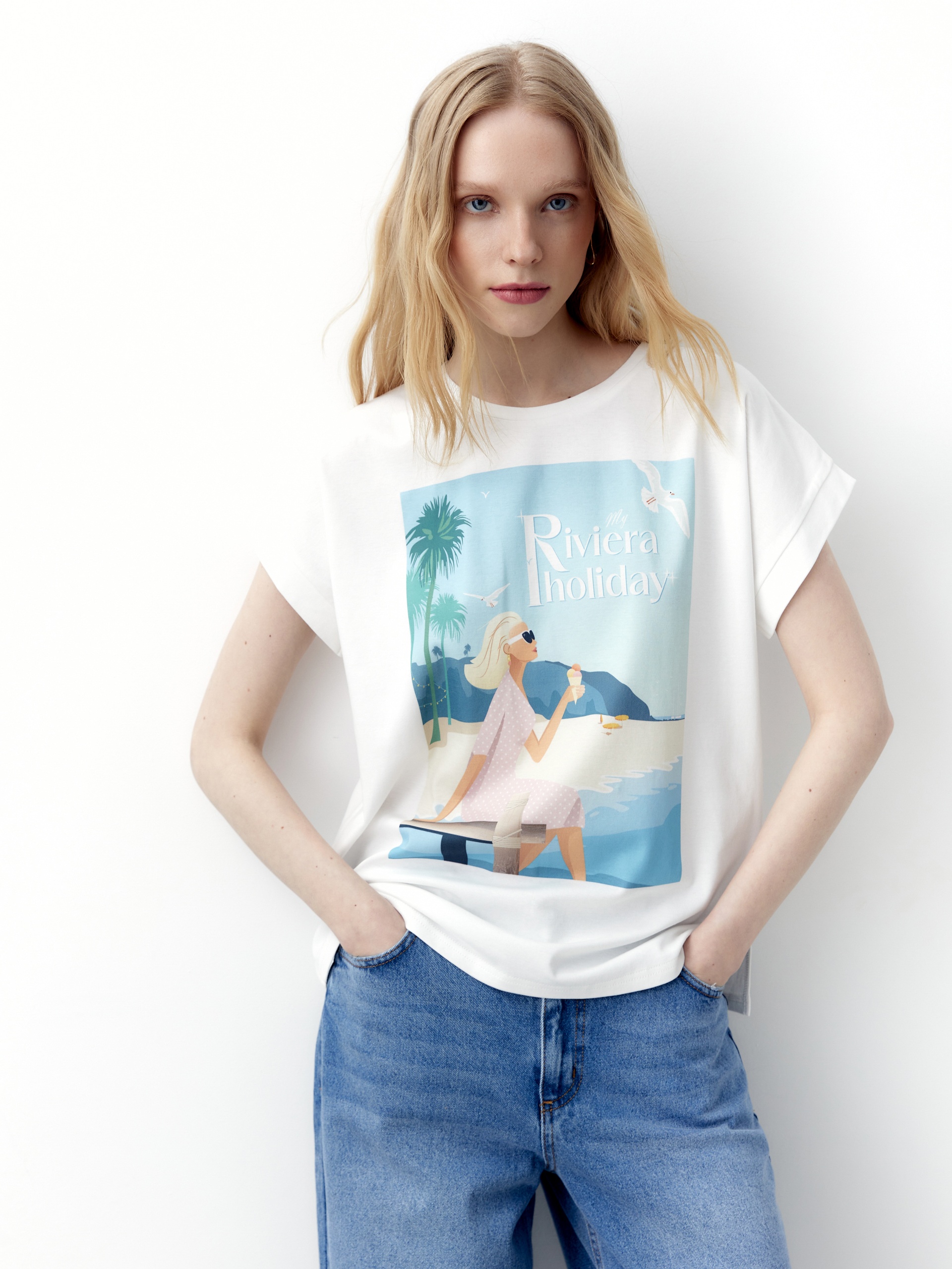 Футболка с принтом на полочке, выполненным на водной основе из премиального мерсеризированного хлопка.