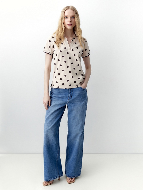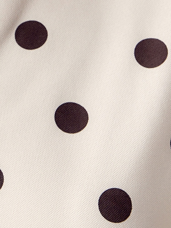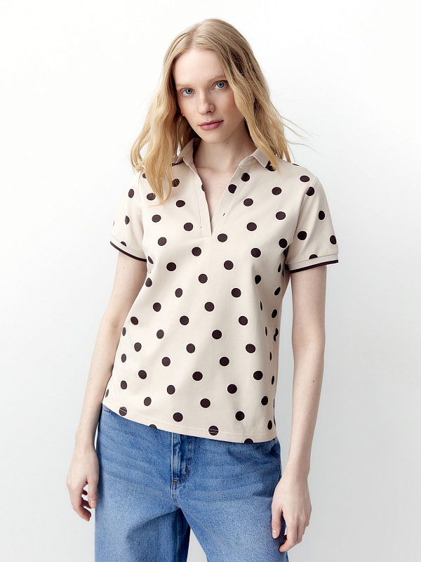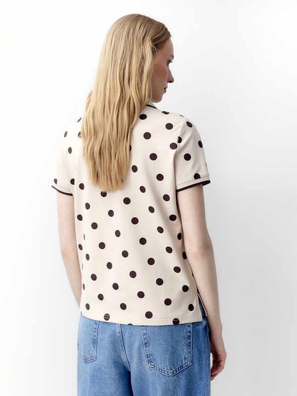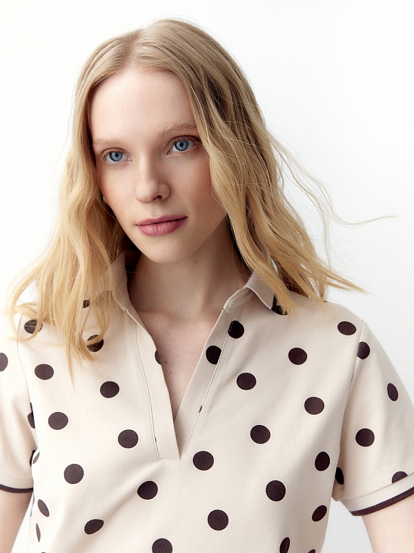 Прямая рубашка - поло выполнена из хлопковой пряжи в нежно бежевом цвете с коричневым горохом.