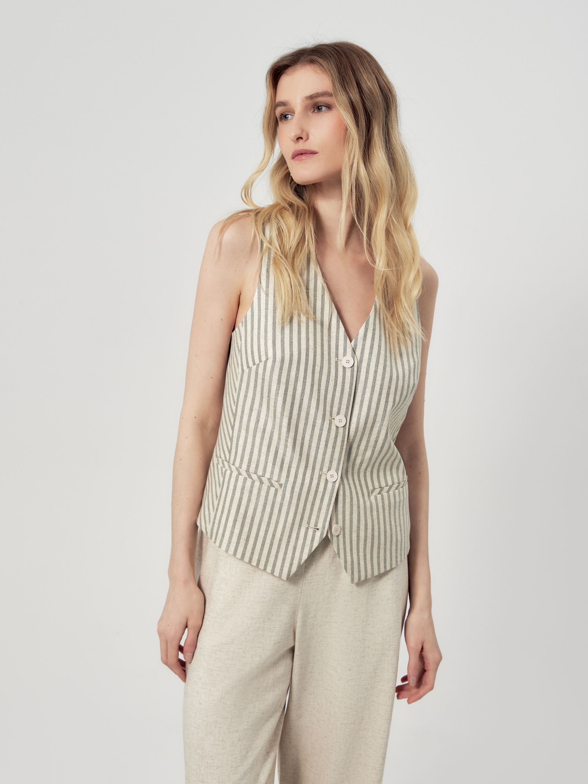 Прямой чуть приталенный жилет из костюмной ткани с добавлением вискозы и льна в светло бежевом цвете с широкой серо-зеленой полоской. Жилет с V-образным вырезом на пуговицах и декоративным элементом на спинке. В жилете имеются прорезные карманы с листочками. Идеально впишется в офисный образ с жакетом и брюками из этой же ткани. Стиль smart casual.