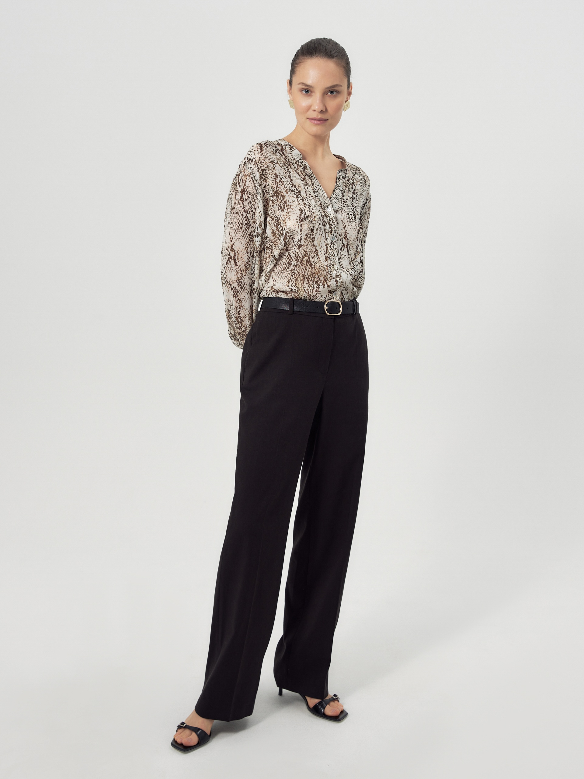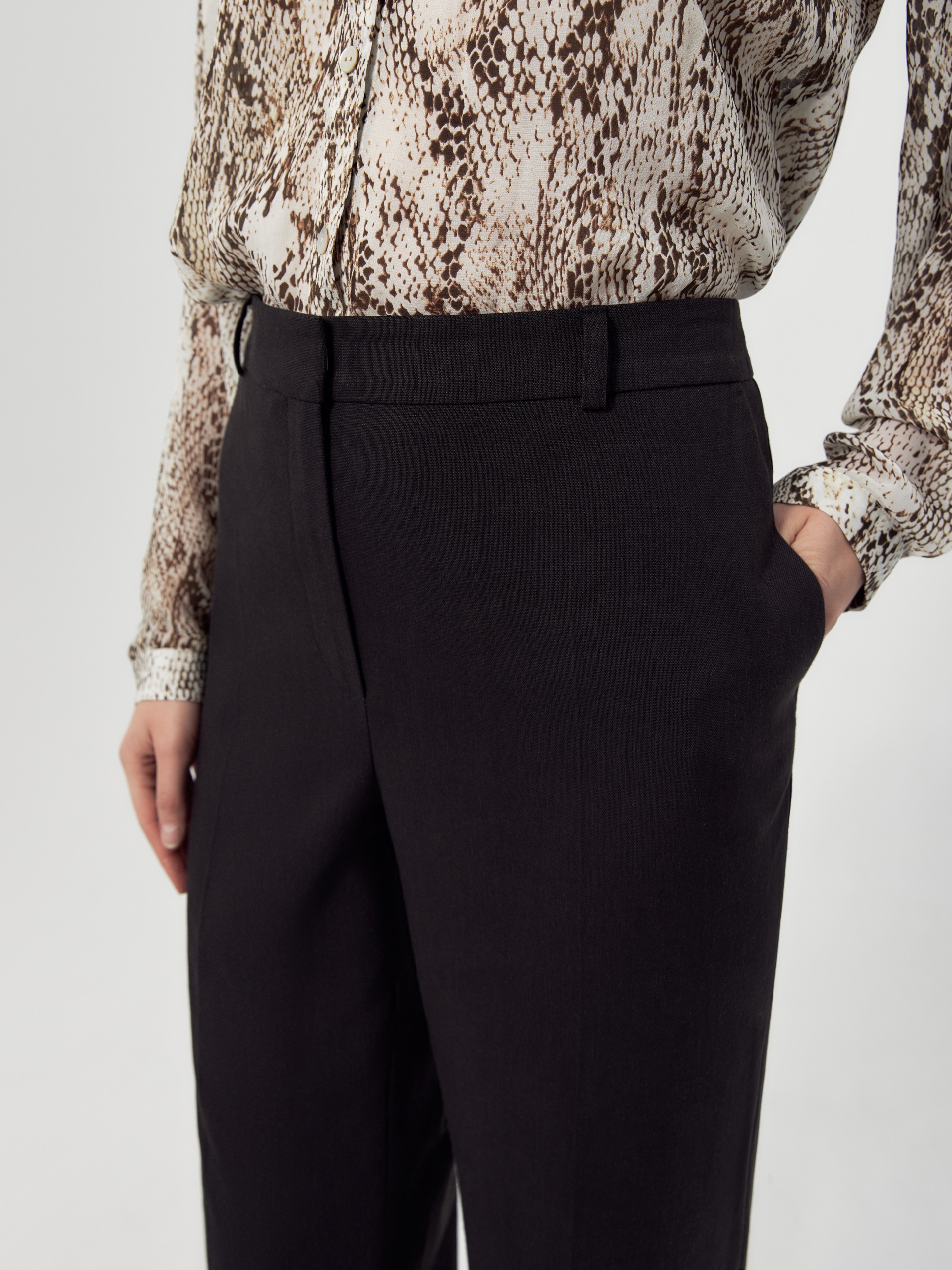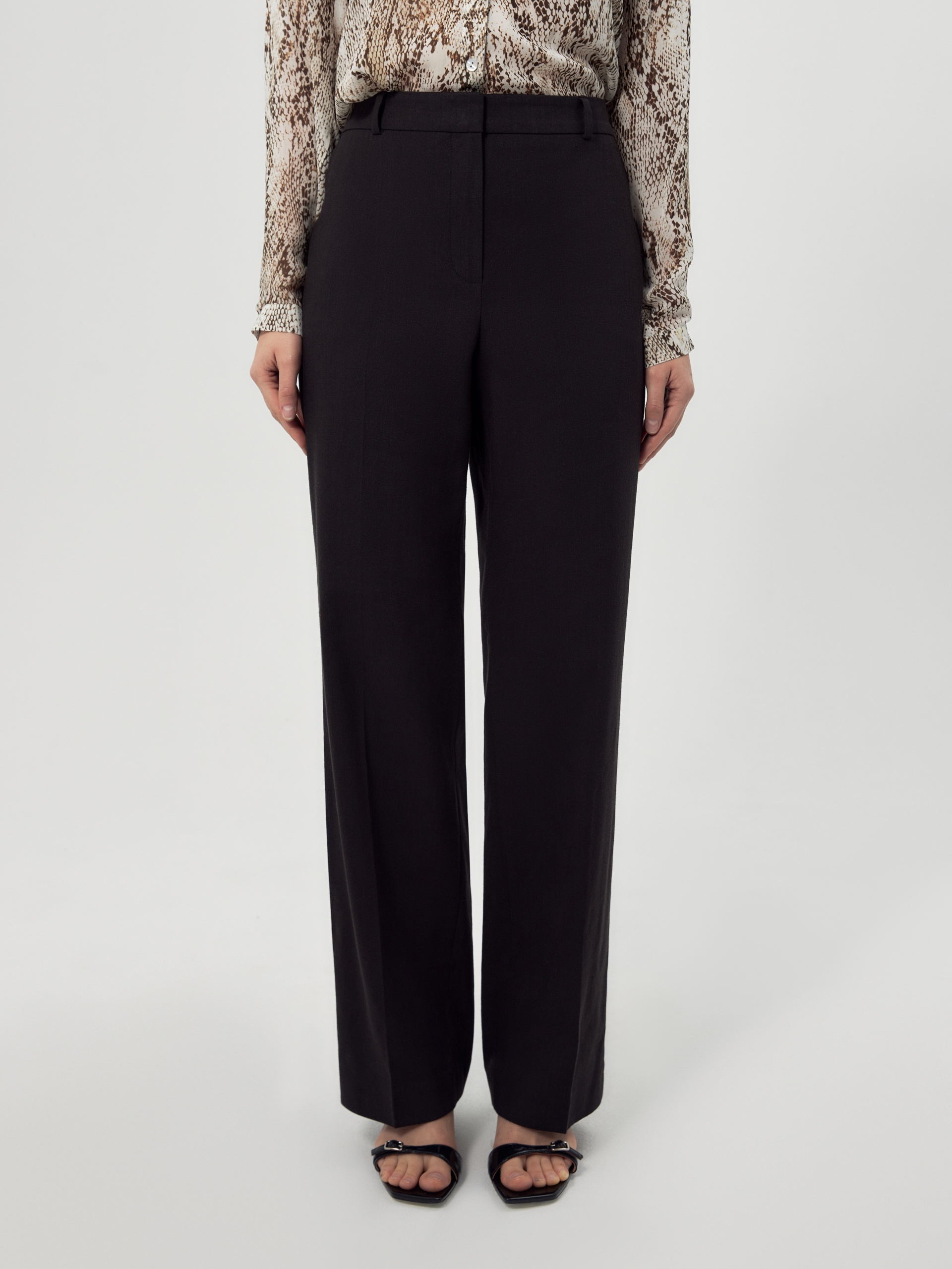 Элегантные брюки прямого силуэта со стрелками на притачном поясе. Застежка спереди на молнию. Карманы в боковых швах.