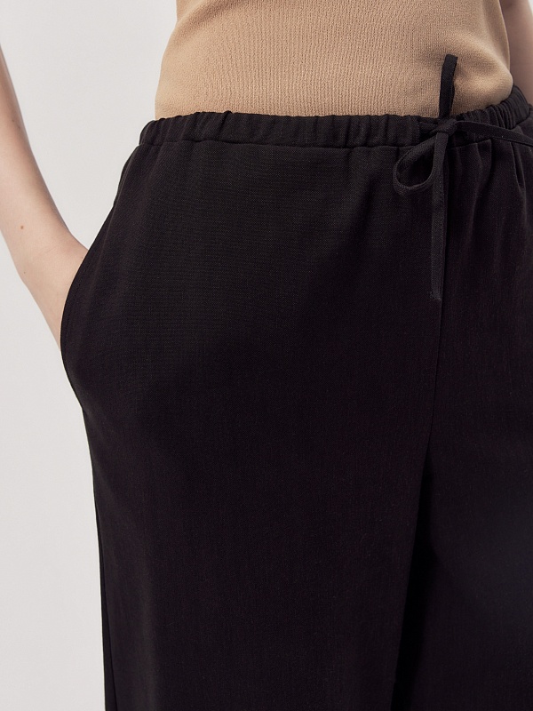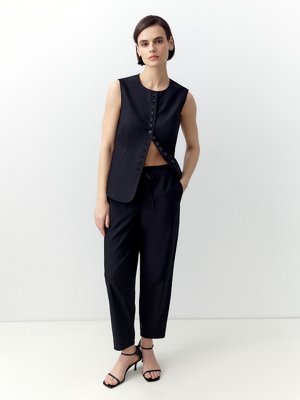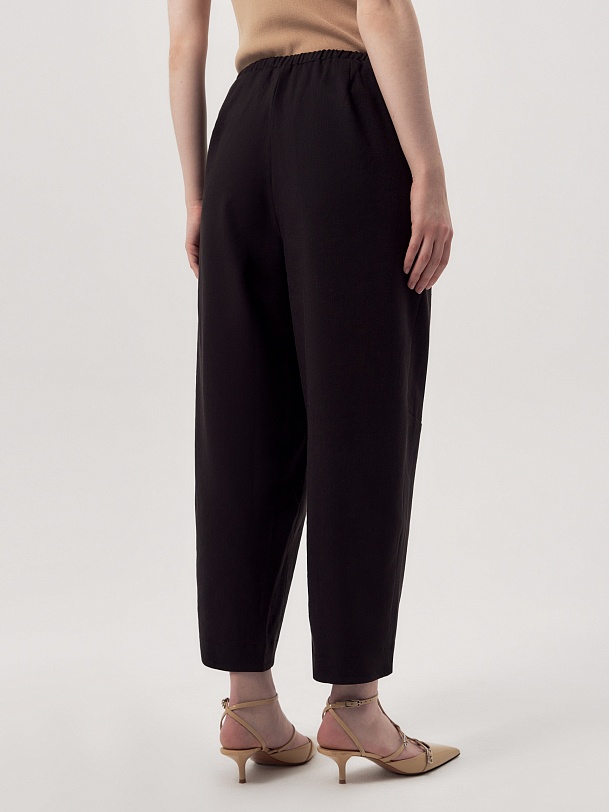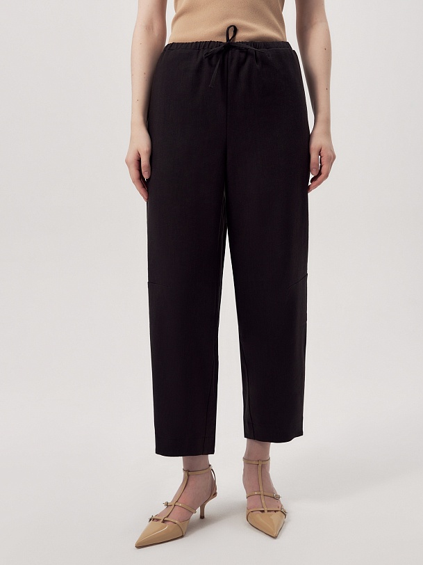 Зауженные книзу брюки-бананы на кулиске с вытачками на коленях для создания характерного силуэта. Выполнены из смесового льняного материала черного цвета. Прекрасно сочетаются с прилегающим удлиненным жилетом.