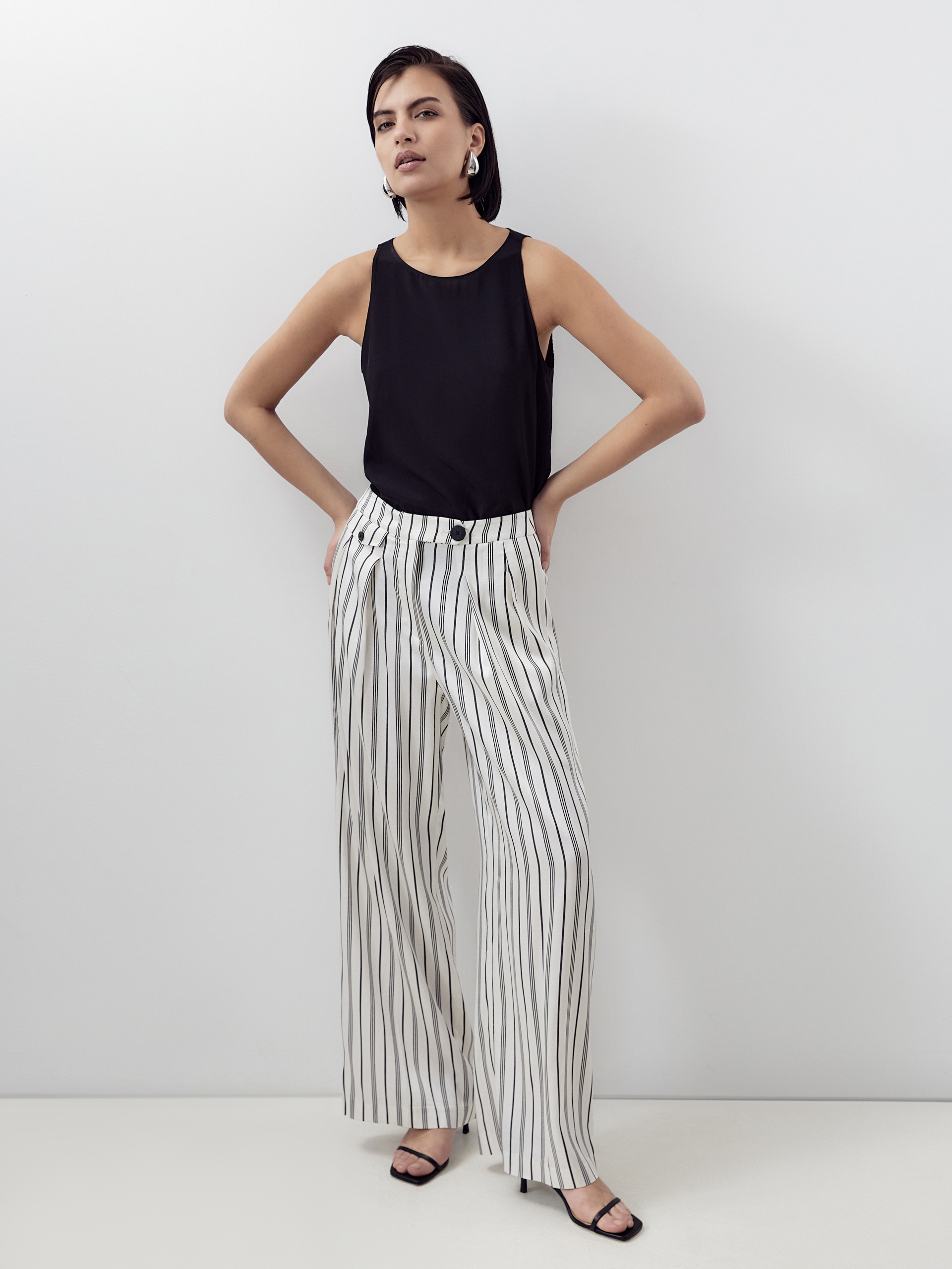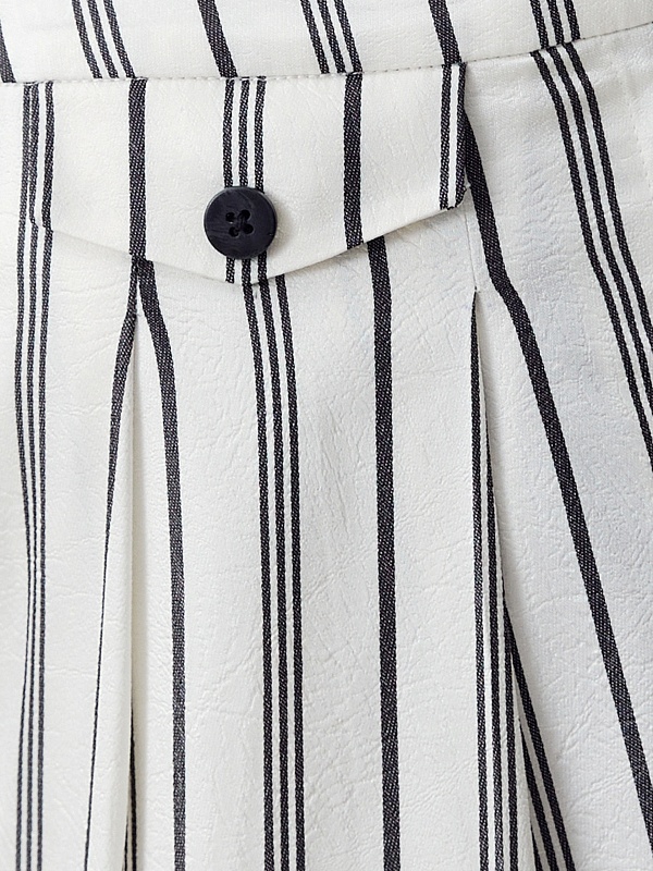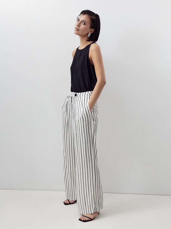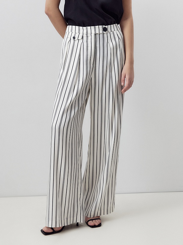 Широкие брюки на подкройном поясе со складками и маленьким клапаном с пуговицей имитирующее часовой карман. Брюки выполнены из вискозной смесовой ткани с разно форматной черно-белой полоской.