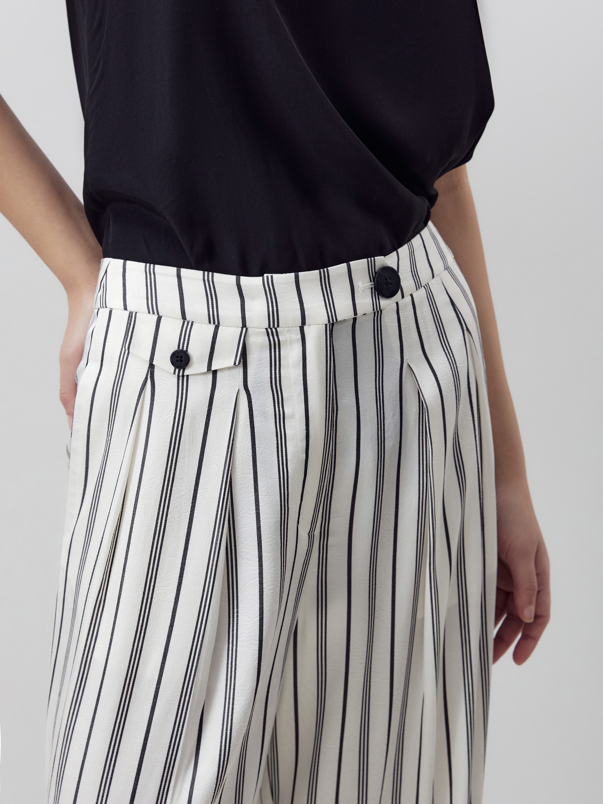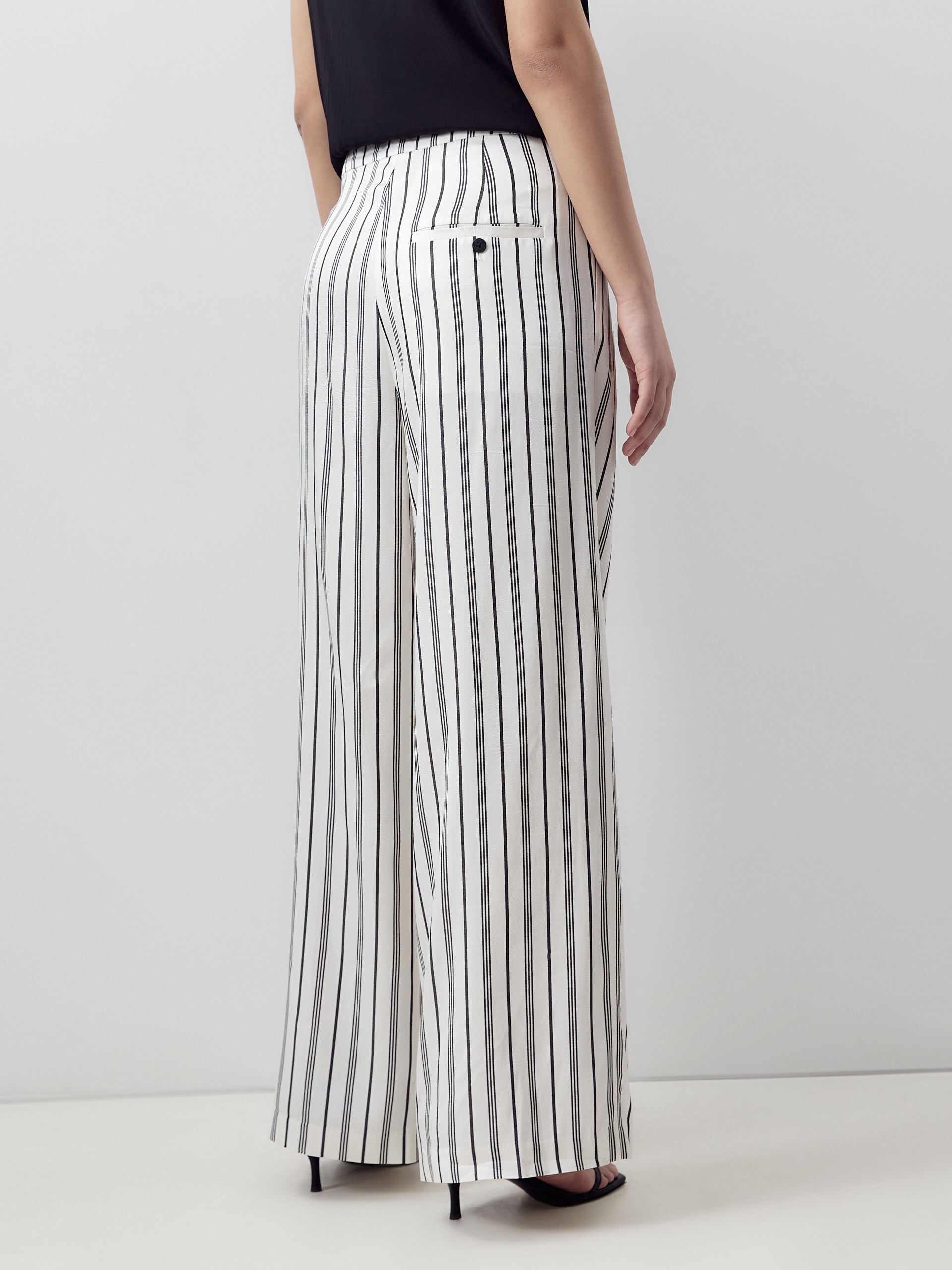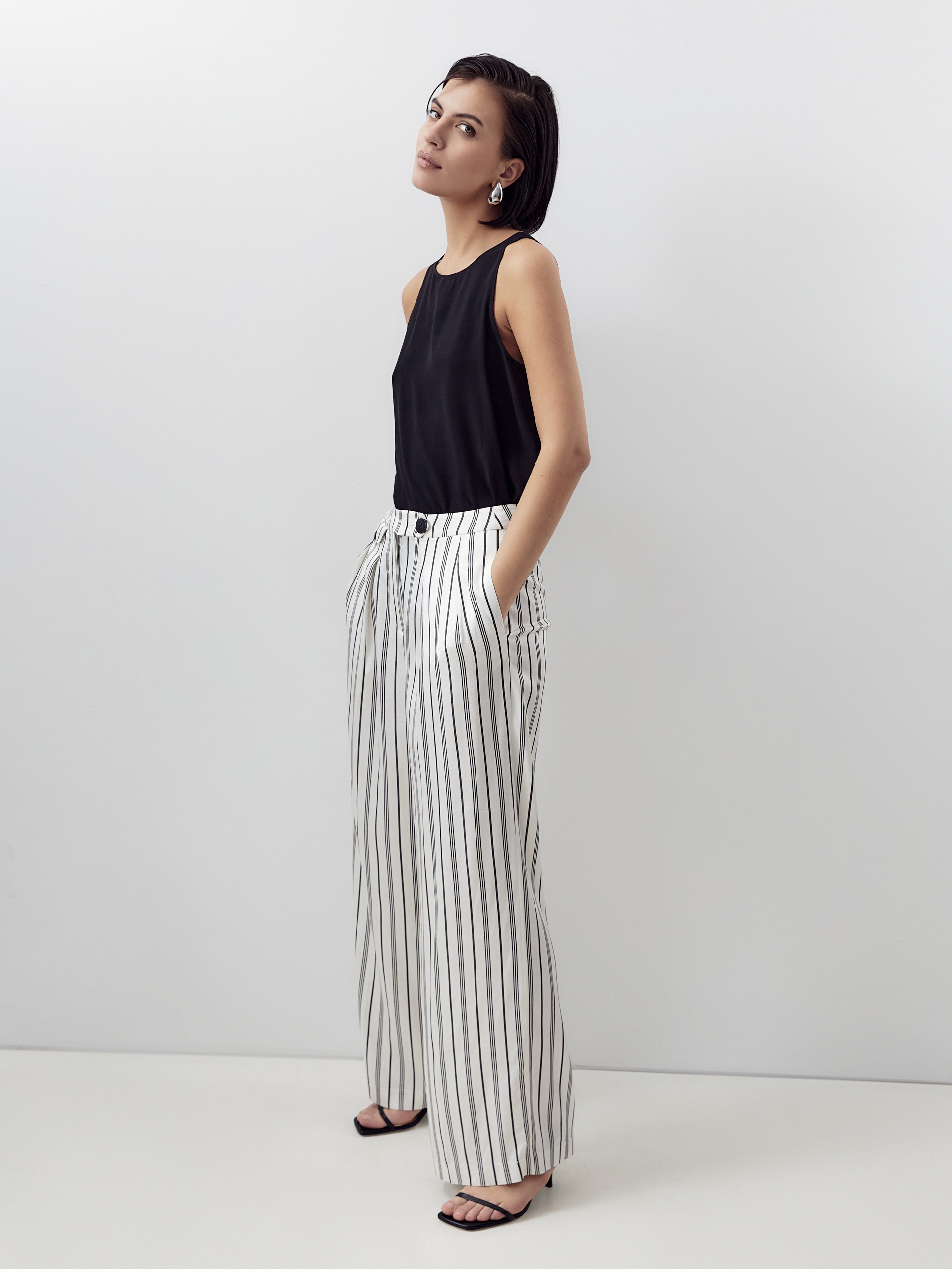 Широкие брюки на подкройном поясе со складками и маленьким клапаном с пуговицей имитирующее часовой карман. Брюки выполнены из вискозной смесовой ткани с разно форматной черно-белой полоской.