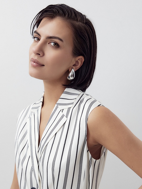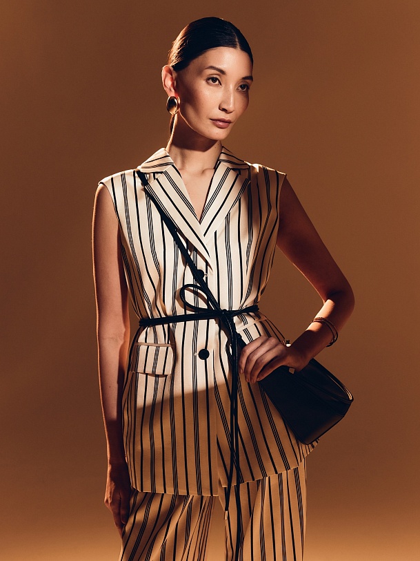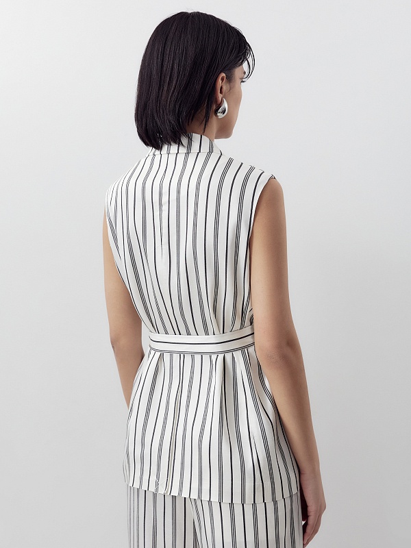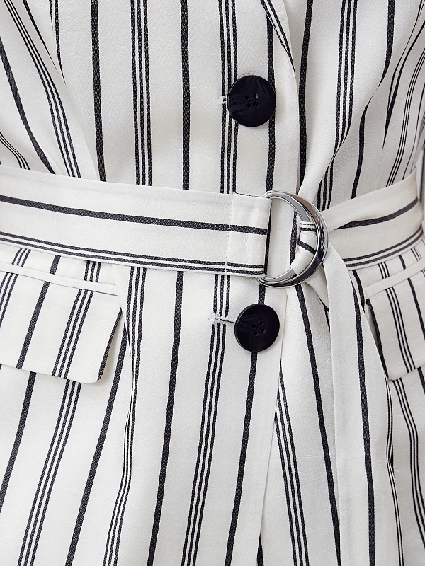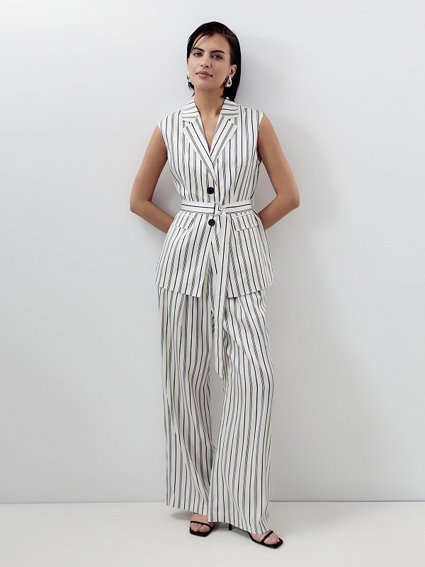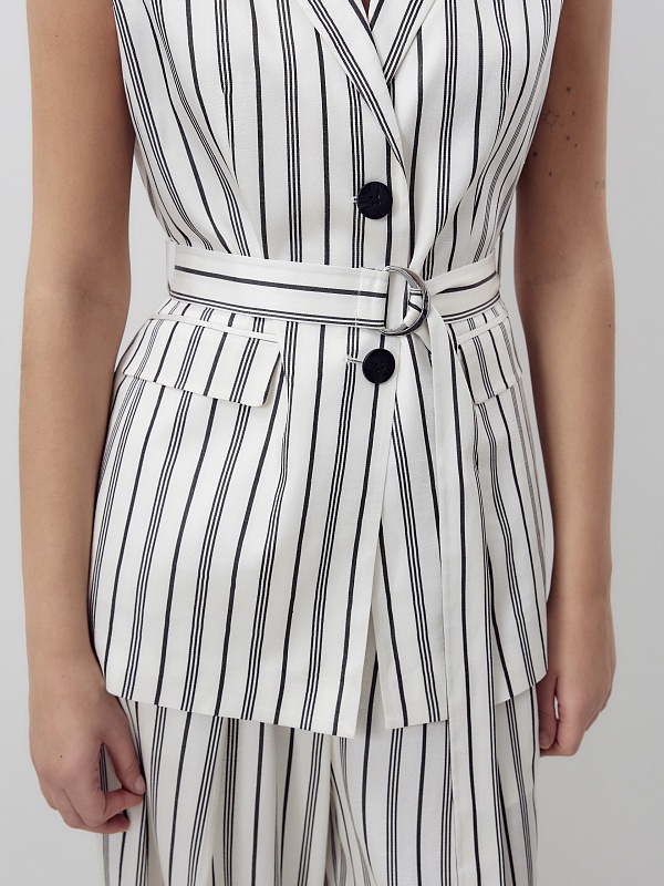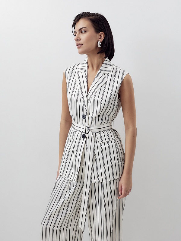 Прямой удлинённый жилет с английским воротником и V-образным вырезом, на двух пуговицах. На полочке прорезные карманы с клапанами. В комплект входит пояс из основной ткани с полукольцами. Создаст стильный весенний образ с брюками из одной ткани.