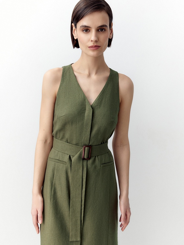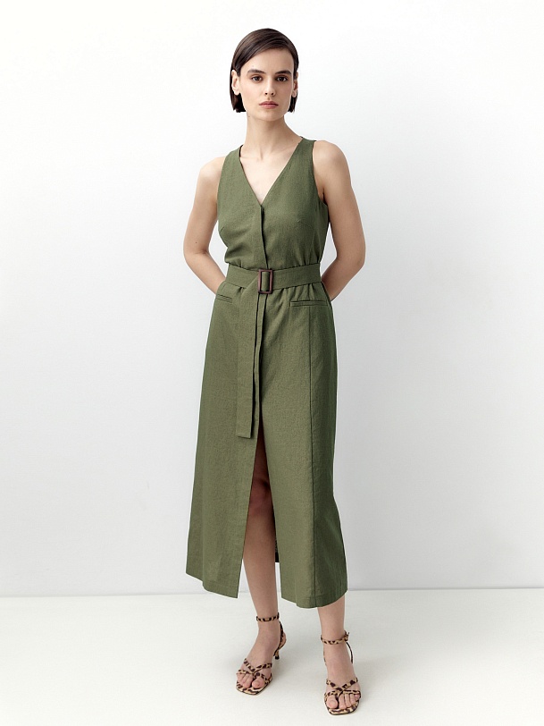Полуприлегающие платье с V-образным вырезом и на зауженных лямках. Платье выполнено в стиле сафари. На полочке рельефы и прорезные карманы листочки. Платье миди с потайной планкой и пуговицами. В комплект входит пояс из основной ткани с пряжкой.