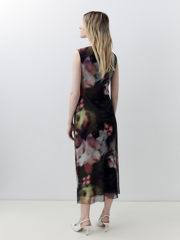 Прилегающие платье из принтованной трикотажной сетки с цветочным принтом, горловина круглая, на талии сборка. Платье на подкладке и расклешенное немного к низу.