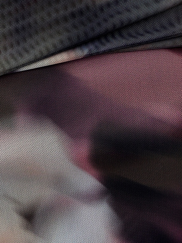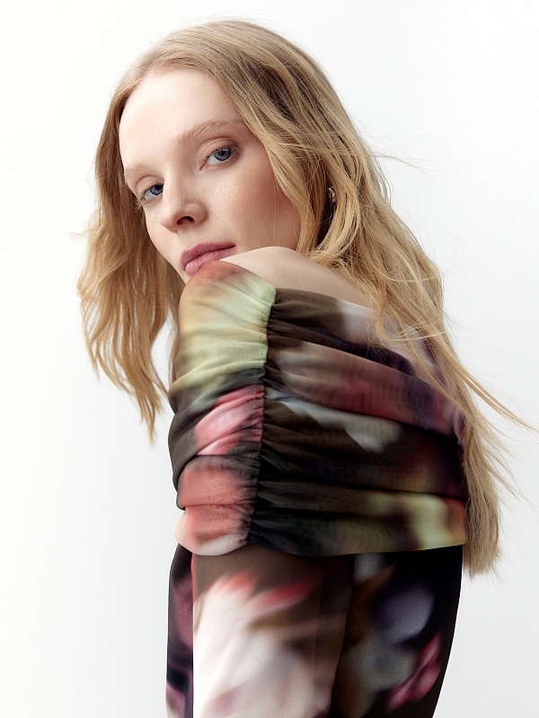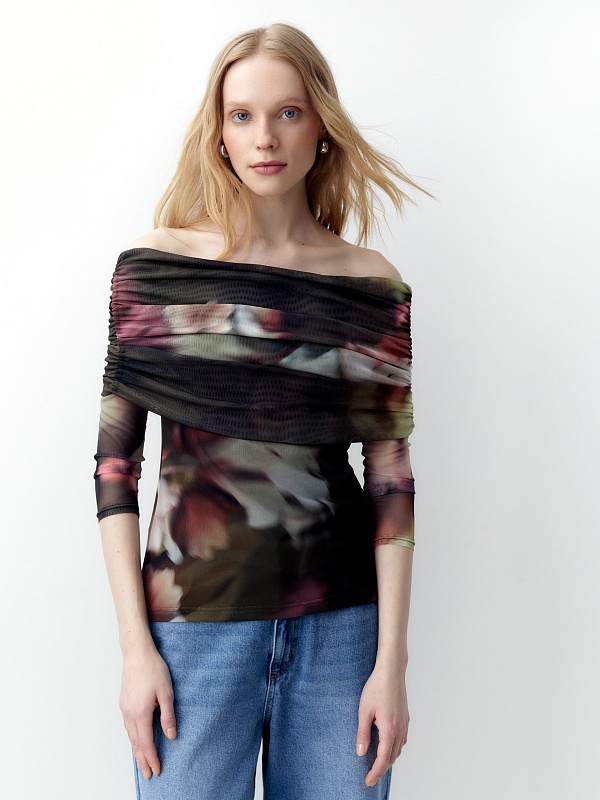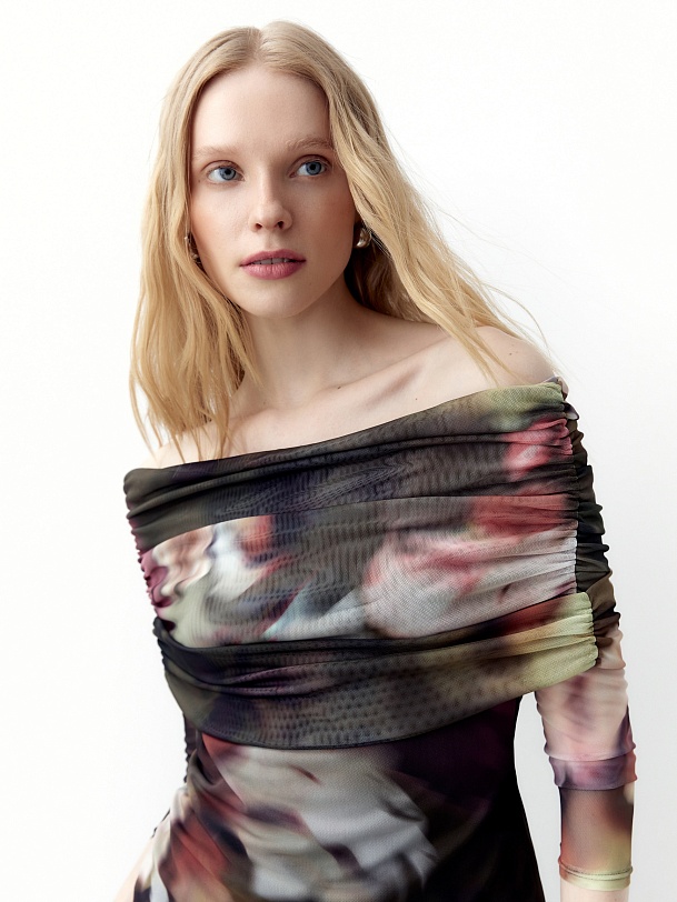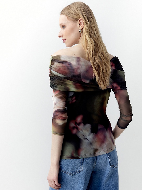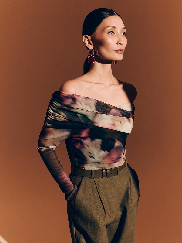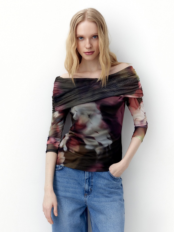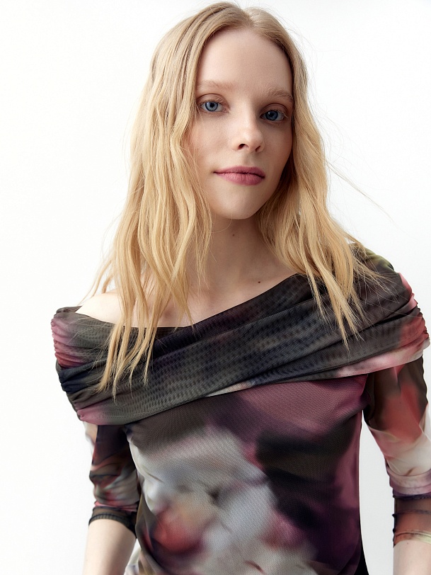 Женственная блуза из принтованной сетки с подкладкой, длинным рукавом и отложным прямым вырезом для формирования складок по плечам и груди.