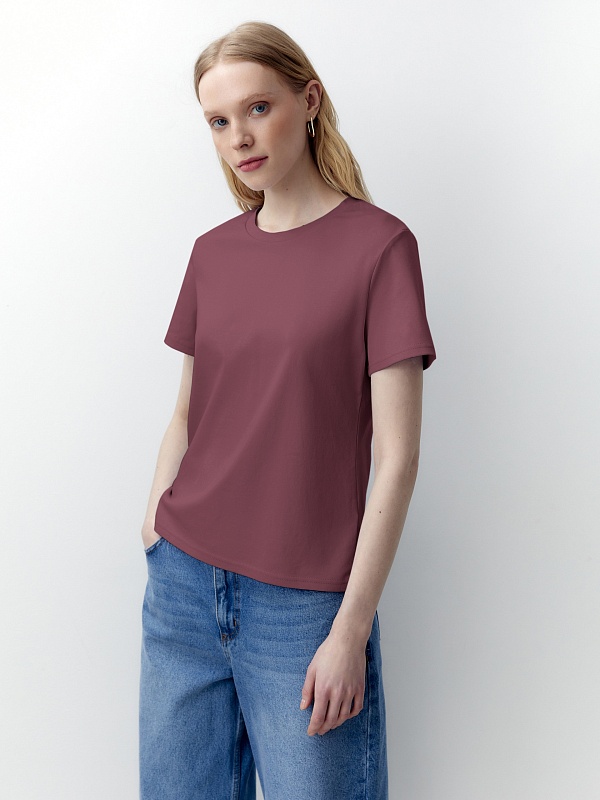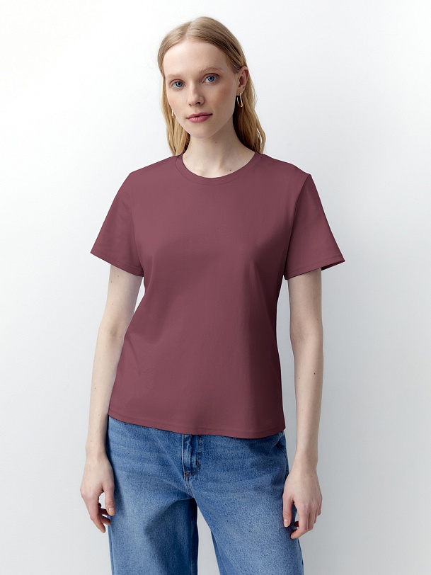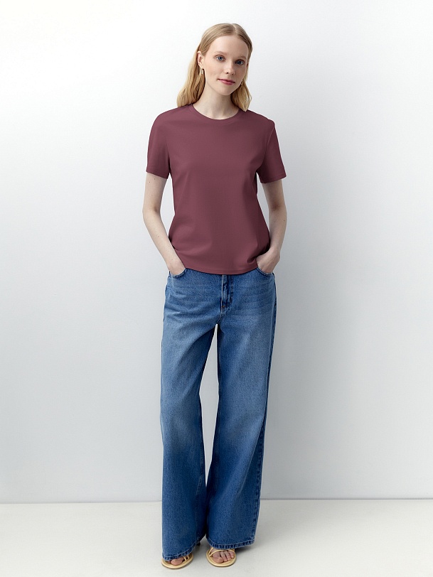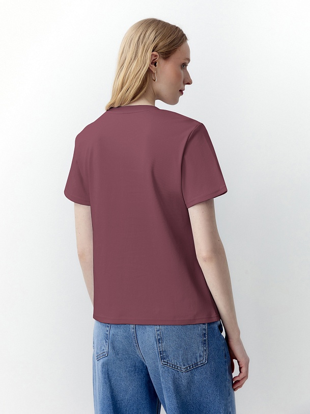 Футболка прямого силуэта бордового цвета будет прекрасно сочетаться как с денимными изделиями, так и с классическими ансамблями. Мерсеризированный хлопок имеет шелковистый блеск и не деформируется после стирок, практически не мнется и не выцветает со временем.
