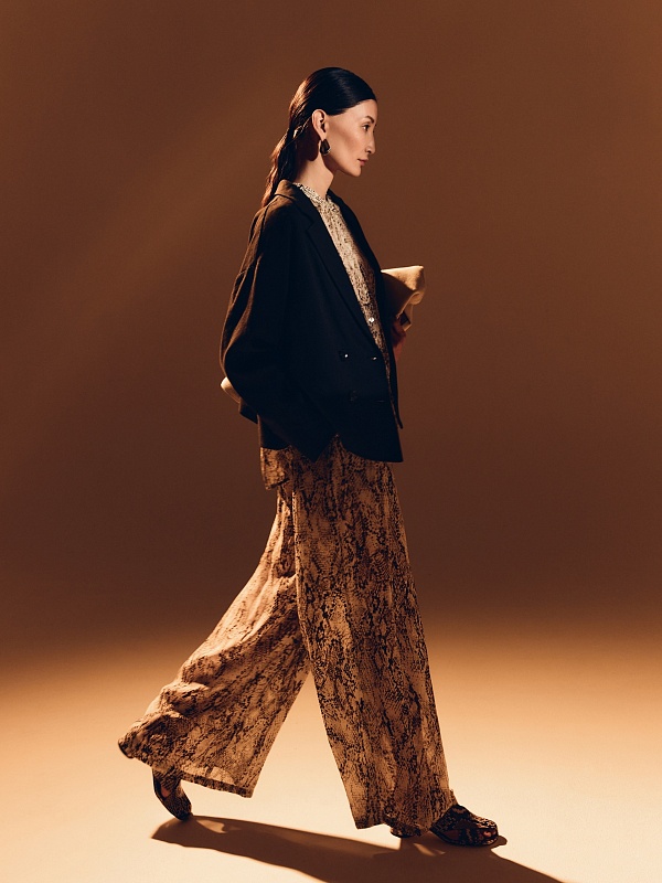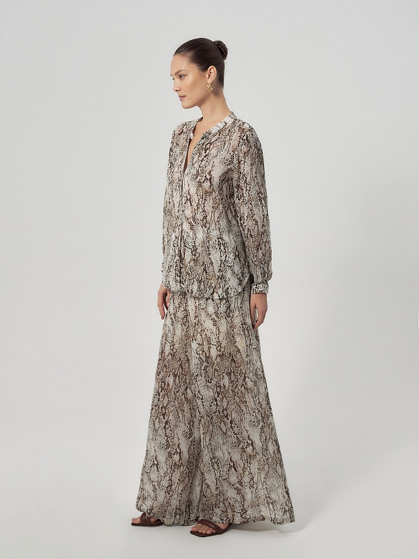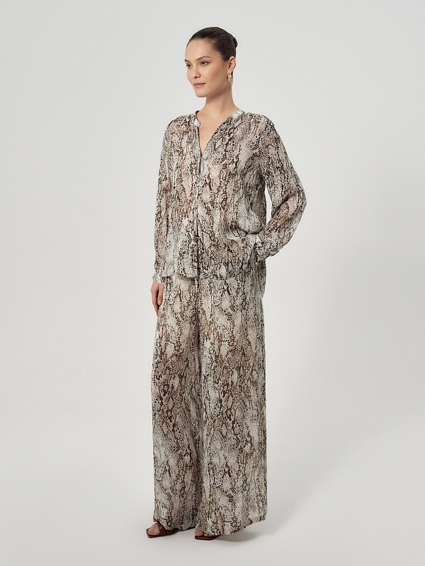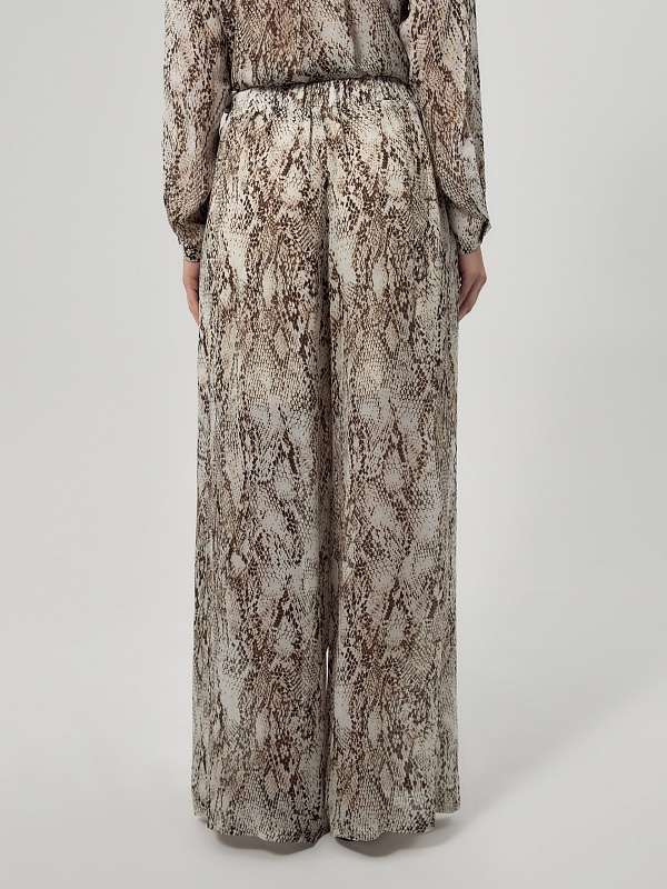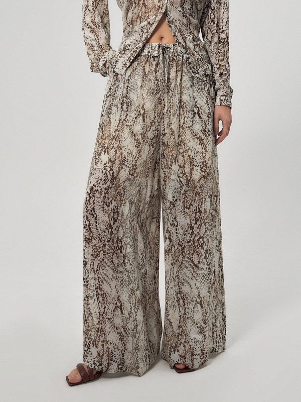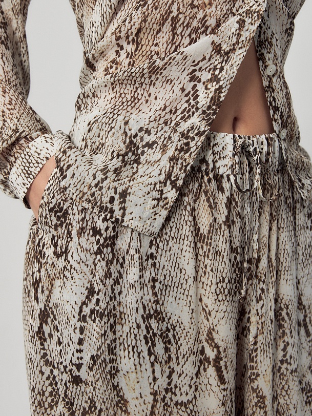 Свободные широкие брюки из тонкой вискозной ткани со змеиным принтом на резинке с завязками из основной ткани. Брюки с подкладкой в виде шорт.