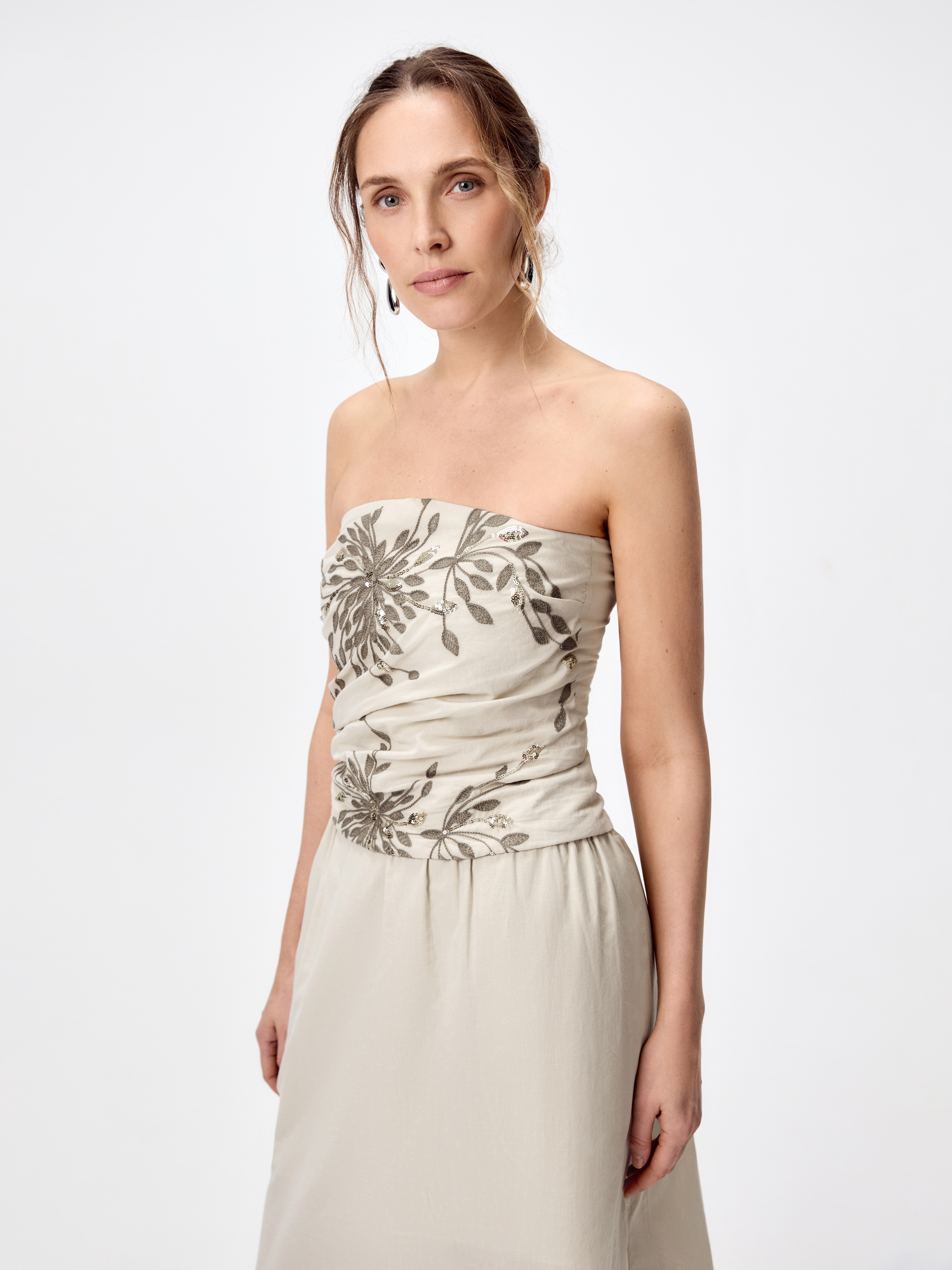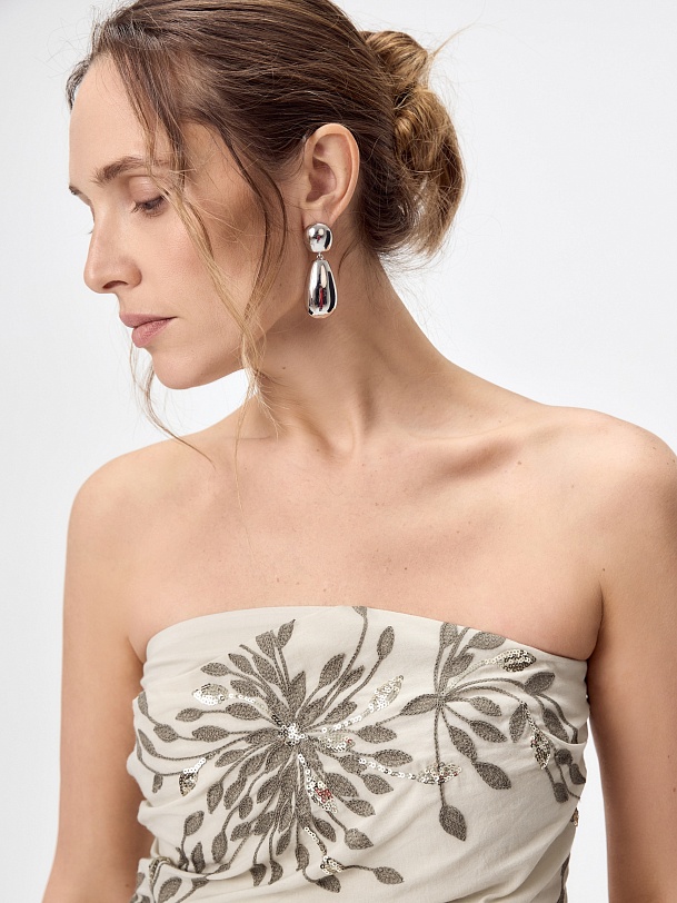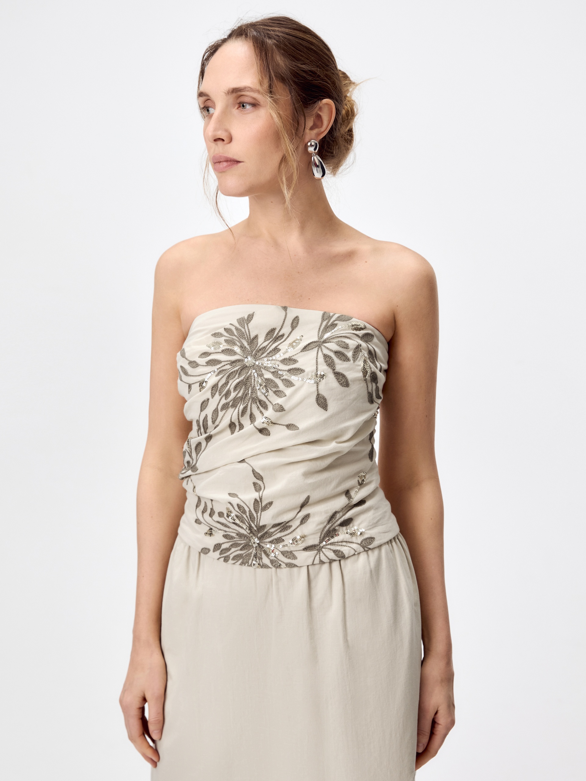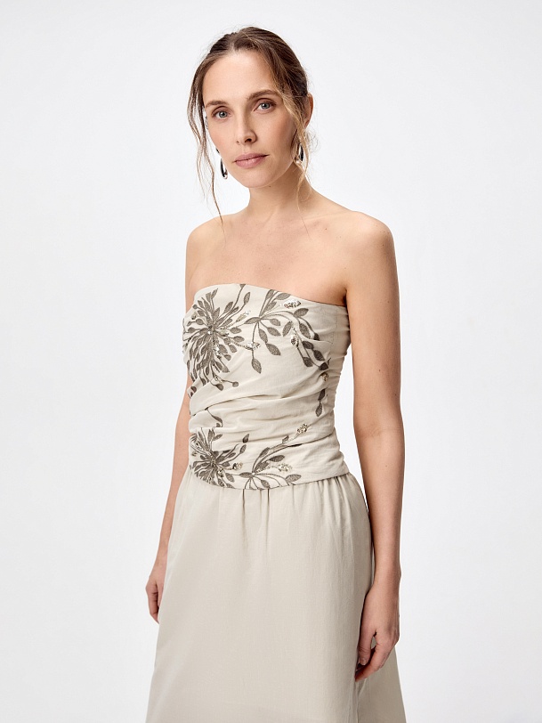 Двойной топ со складками и вышивкой пайетками, в боковом шве потайная молния на спинке резинка-жилка для лучшей посадке.