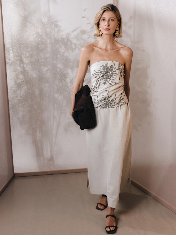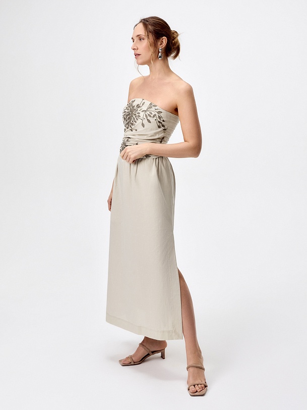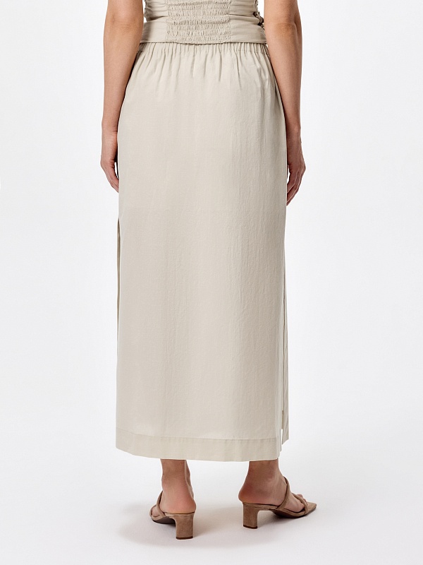 Юбка трапеция макси из хлопковой ткани бежевого цвета на резинке. По бокам высокие разрезы, есть карманы во швах. Низ с широкой подгибкой. Эта юбка станет идеальным выбором для летнего образа, сочетая в себе комфорт и стиль.