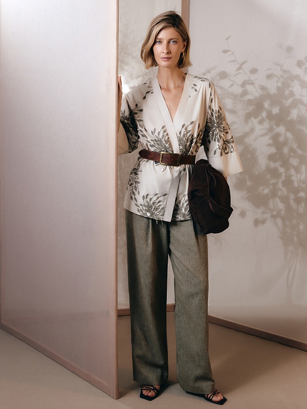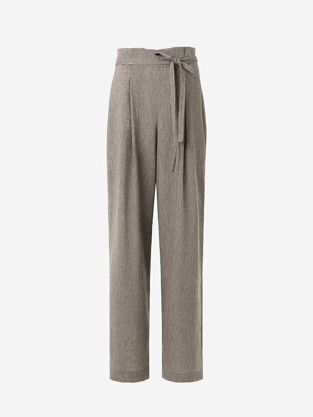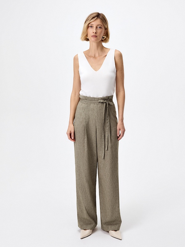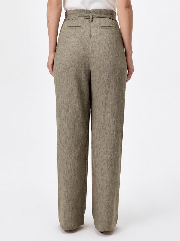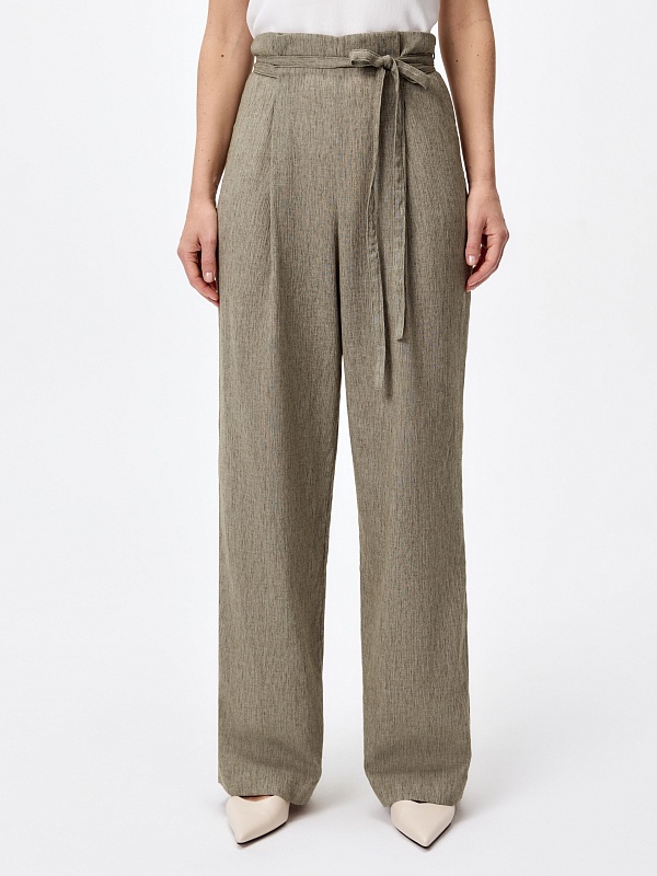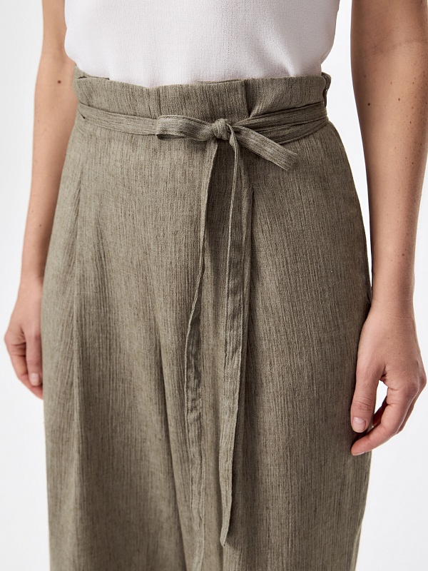 Широкие брюки со складками и длинными завязками из хлопковой плательной ткани с добавлением льна. На спинке есть шлевка и прорезные карманы листочки.