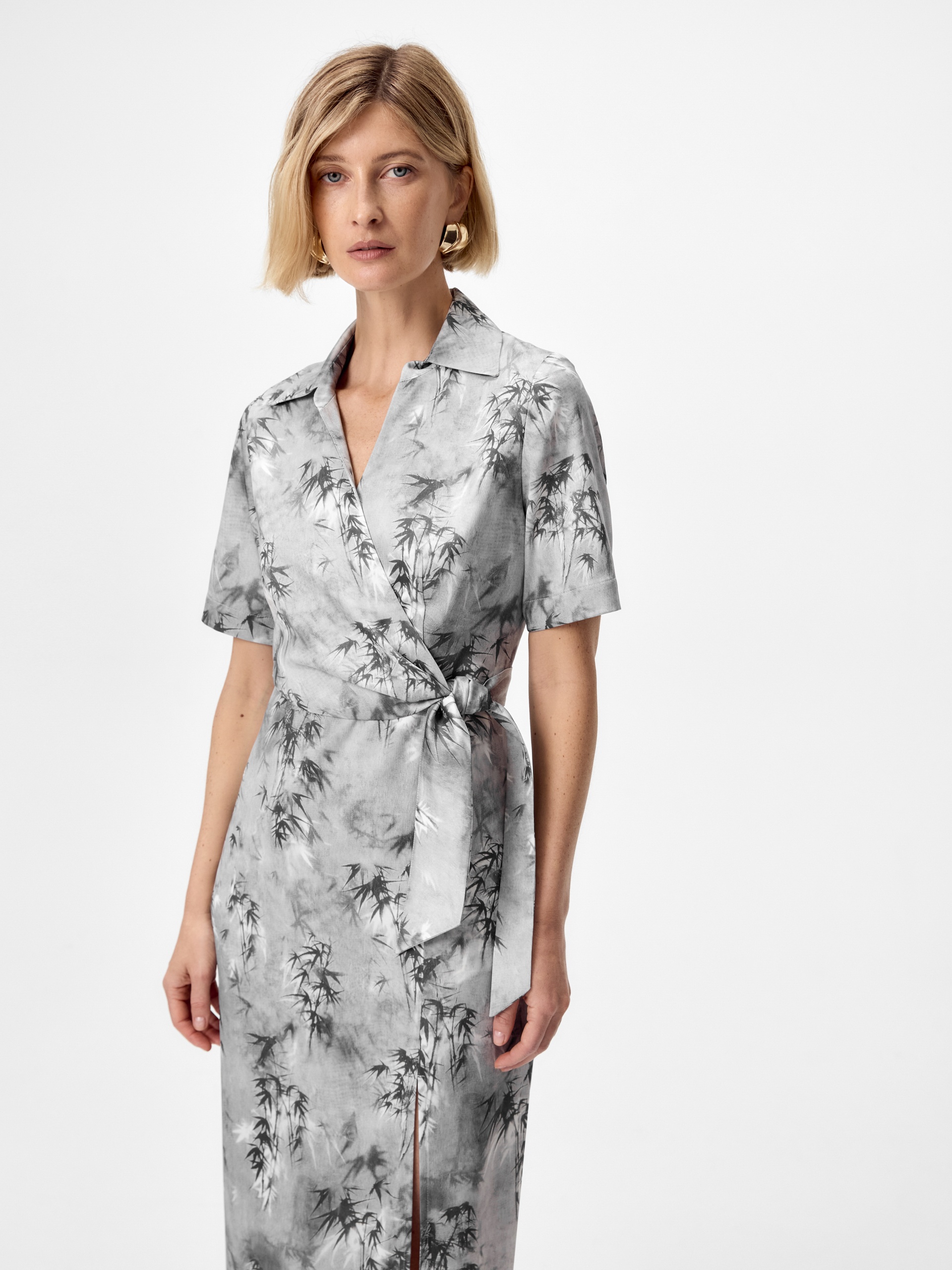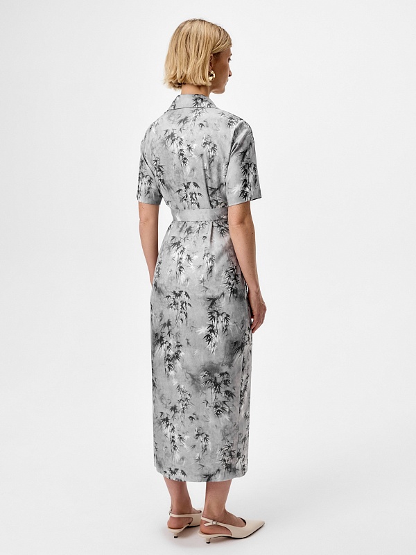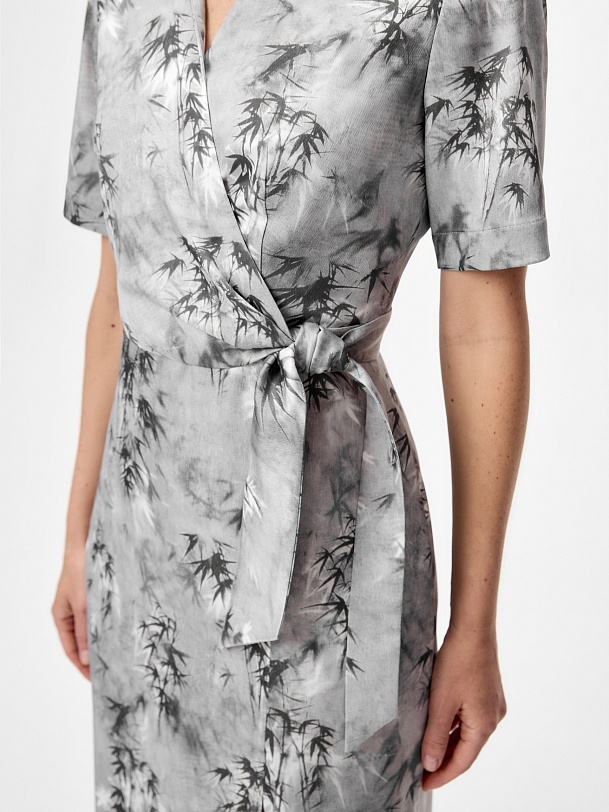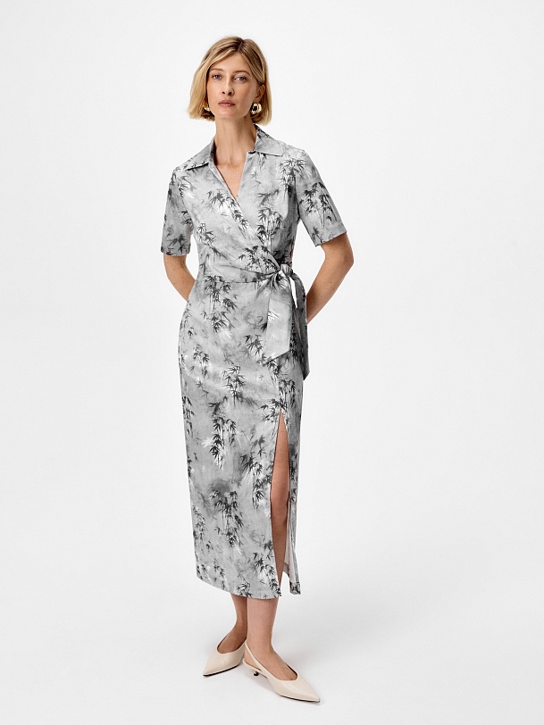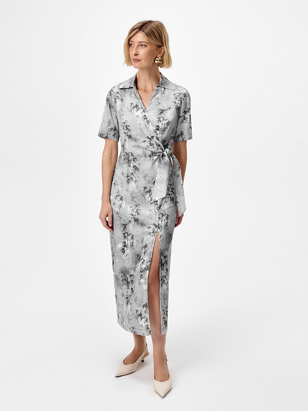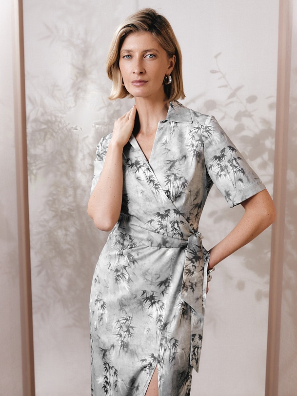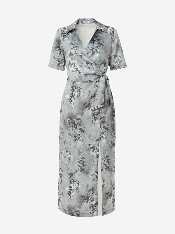 Платье из тенселя (80%) с деликатным глянцевым блеском и изысканным принтом «Бамбук» — утончённая интерпретация природных мотивов в современном премиум-гардеробе. Лиф с элегантной имитацией запаха подчеркивает линию декольте, а высокий разрез на юбке добавляет благородной чувственности.