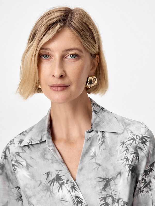 Ткань на основе тенселя — легкого, гипоаллергенного материала — дарит ощущение прохлады и подходит для чувствительной кожи. Принт «бамбук» отсылает к естественным формам, создавая тонкую связь между урбанистическим стилем и природным вдохновением.