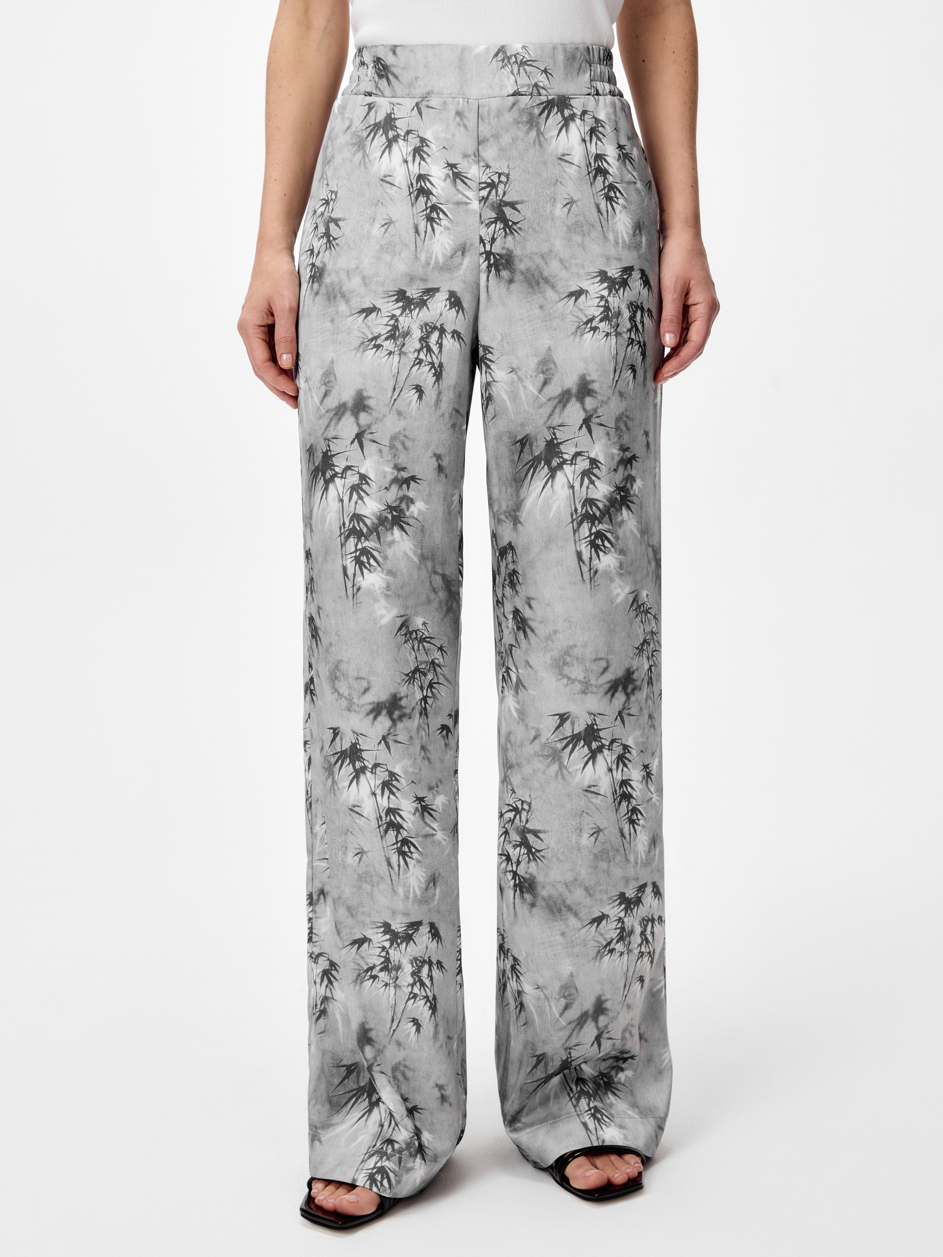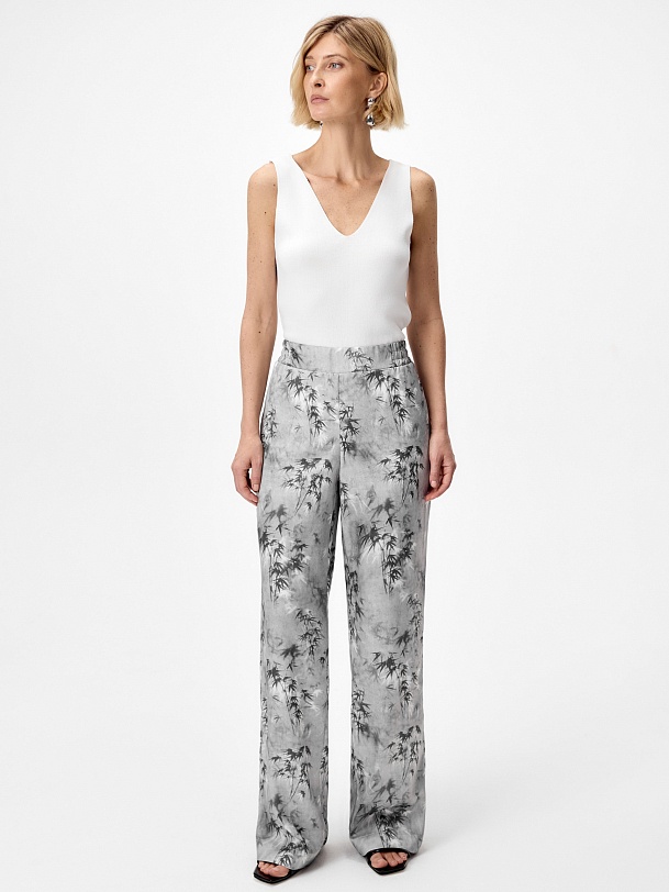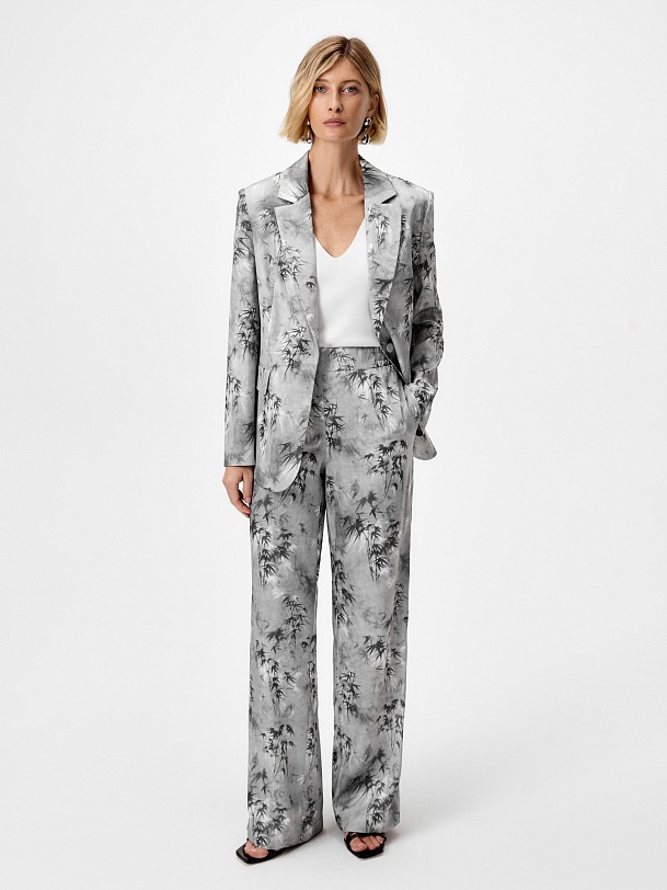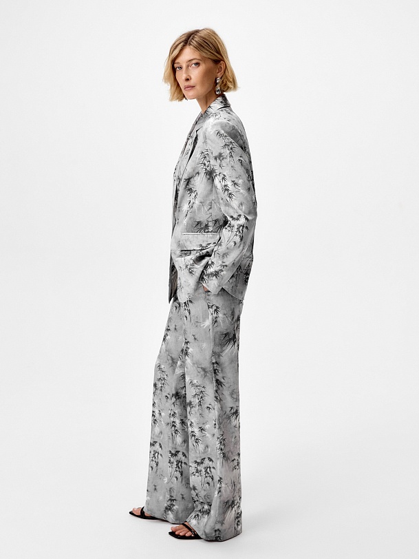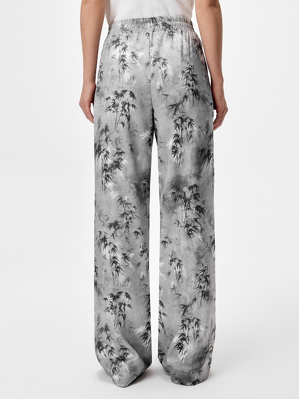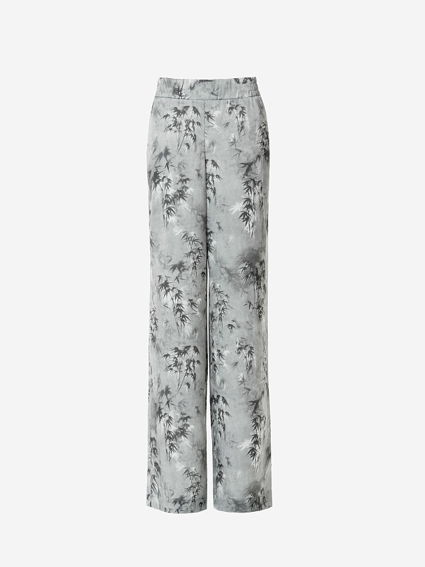 Прямые брюки из атласной ткани в благородном растительном притне на резинке. Карманы в боковых швах. В сочетании с жакетом из той же ткани составит идеальный пижамный комплект.