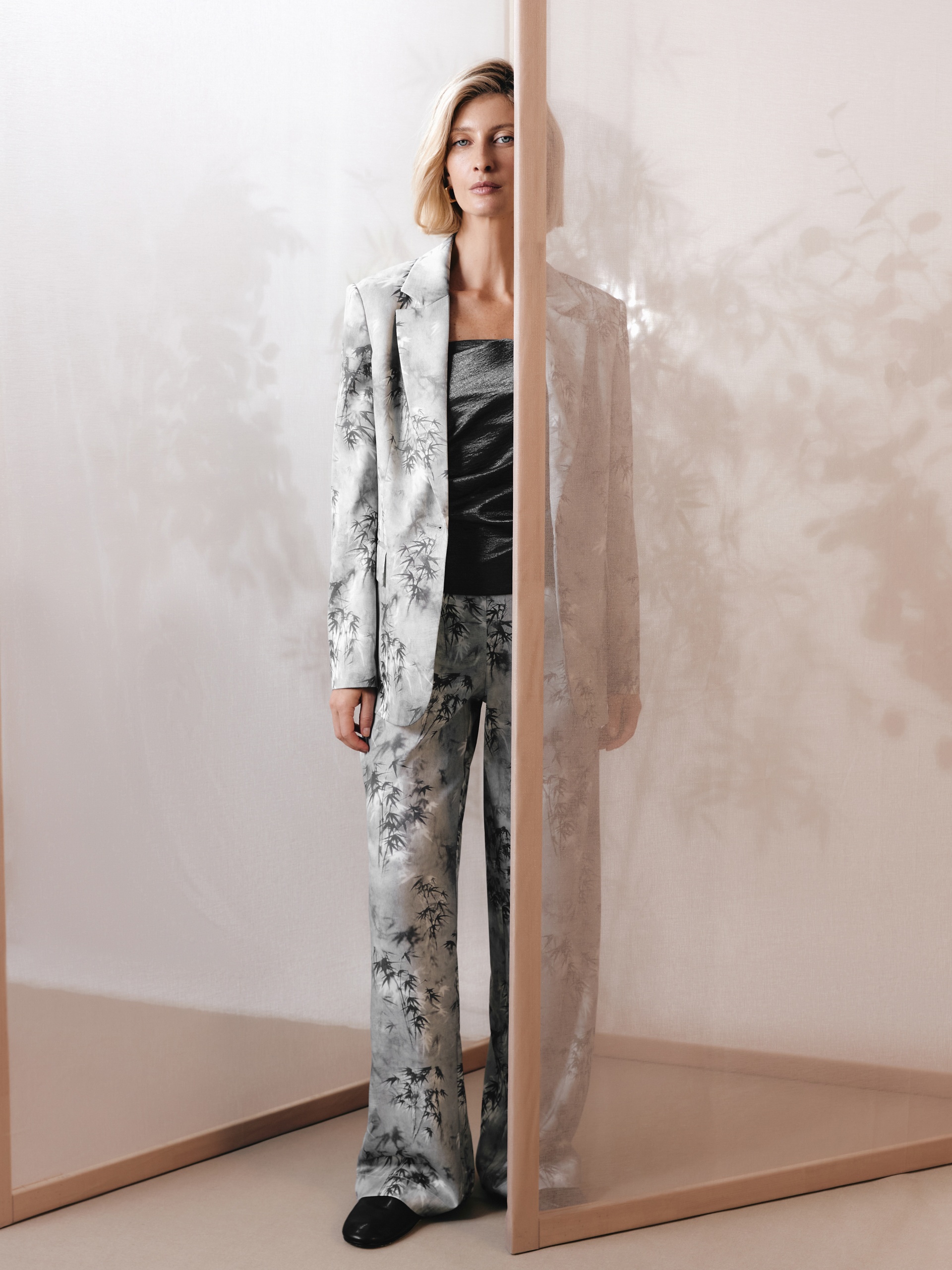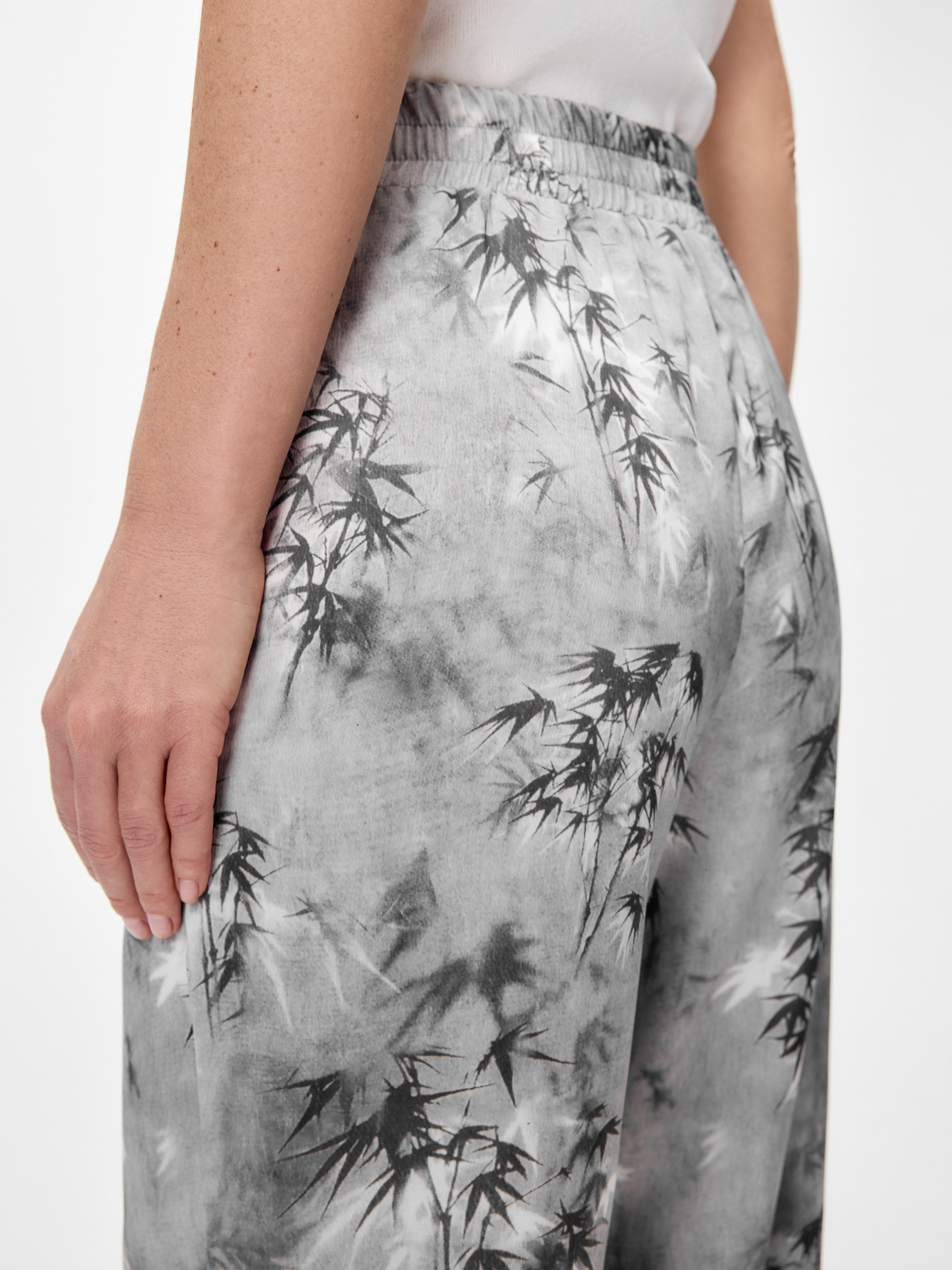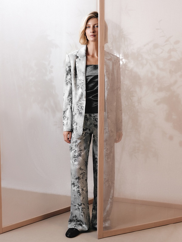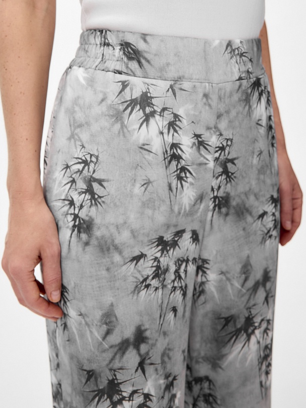 Прямые брюки из атласной ткани в благородном растительном притне на резинке. Карманы в боковых швах. В сочетании с жакетом из той же ткани составит идеальный пижамный комплект.