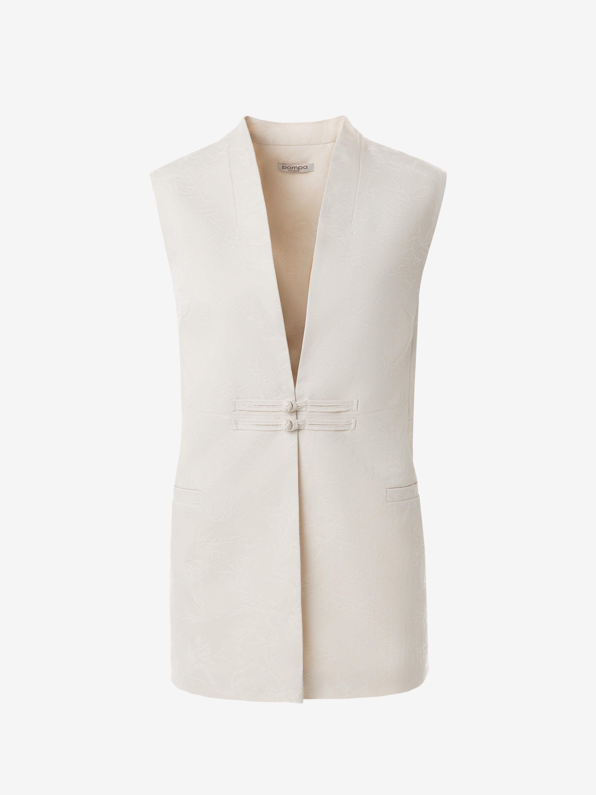 Прямой удлиненный жилет из атласной жаккардовой ткани с глубоким V-образным вырезом, прорезными карманами и фантазийной спинкой с планкой, на полочке рабочие "китайские пуговицы" из основной ткани.