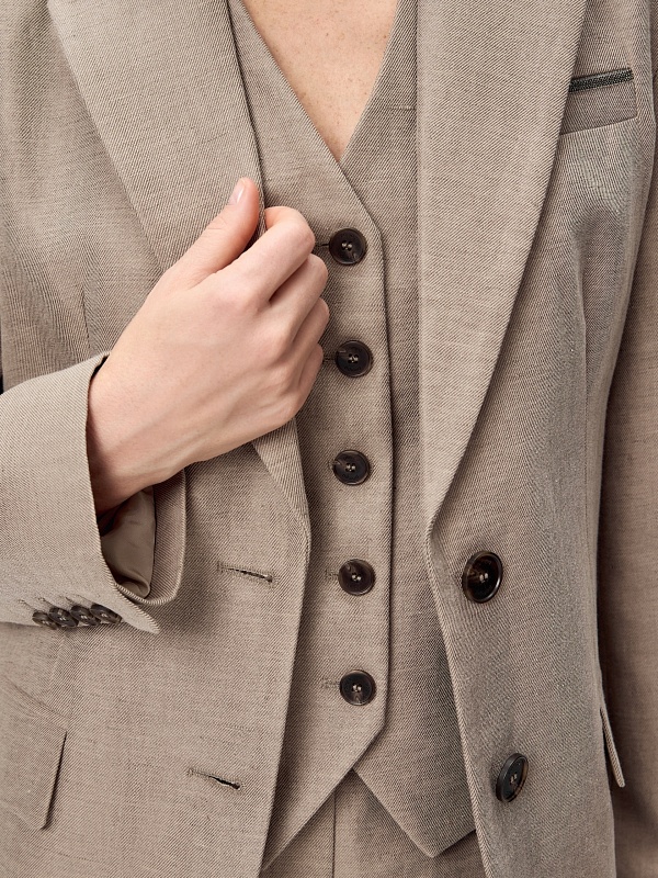 Полуприлегающий жакет из смесовой льняной ткани благородного оливково-бежевого цвета на двух пуговицах. Классический английский воротник, спущенная линия плеча. На полочке имитация нагрудного кармана с декоративной тесьмой «мониль», классические прорезные карманы с клапанами и рабочий внутренний карман. Составит идеальный комплект с жилетом и брюками из той же ткани.