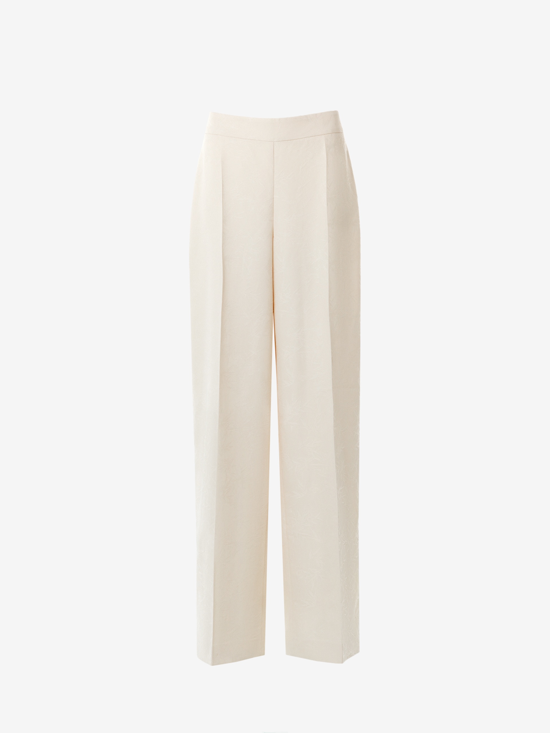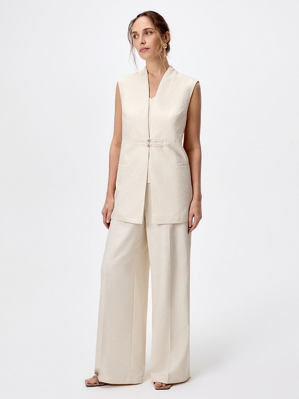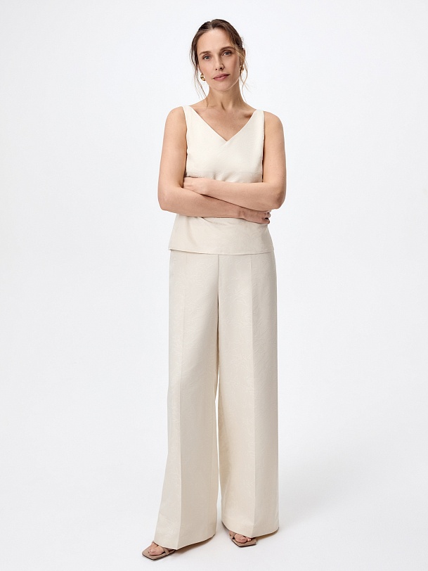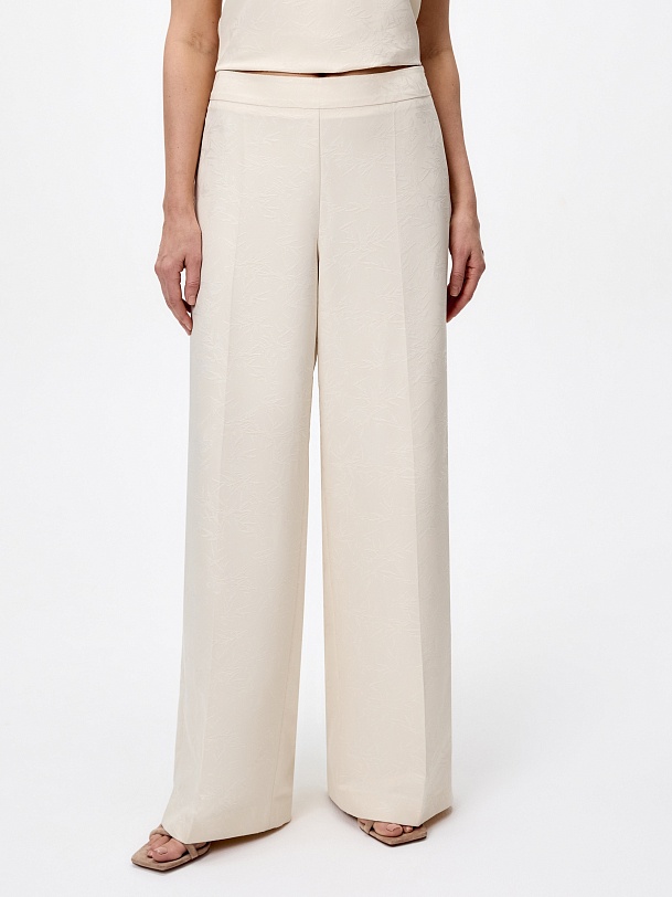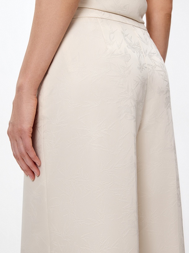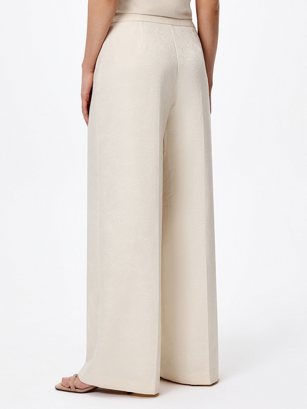 Расклешенные от бедра брюки на высокой посадке со стрелками из атласного жаккарда молочного цвета на притачном поясе. Потайная застежка молния в боковом шве.