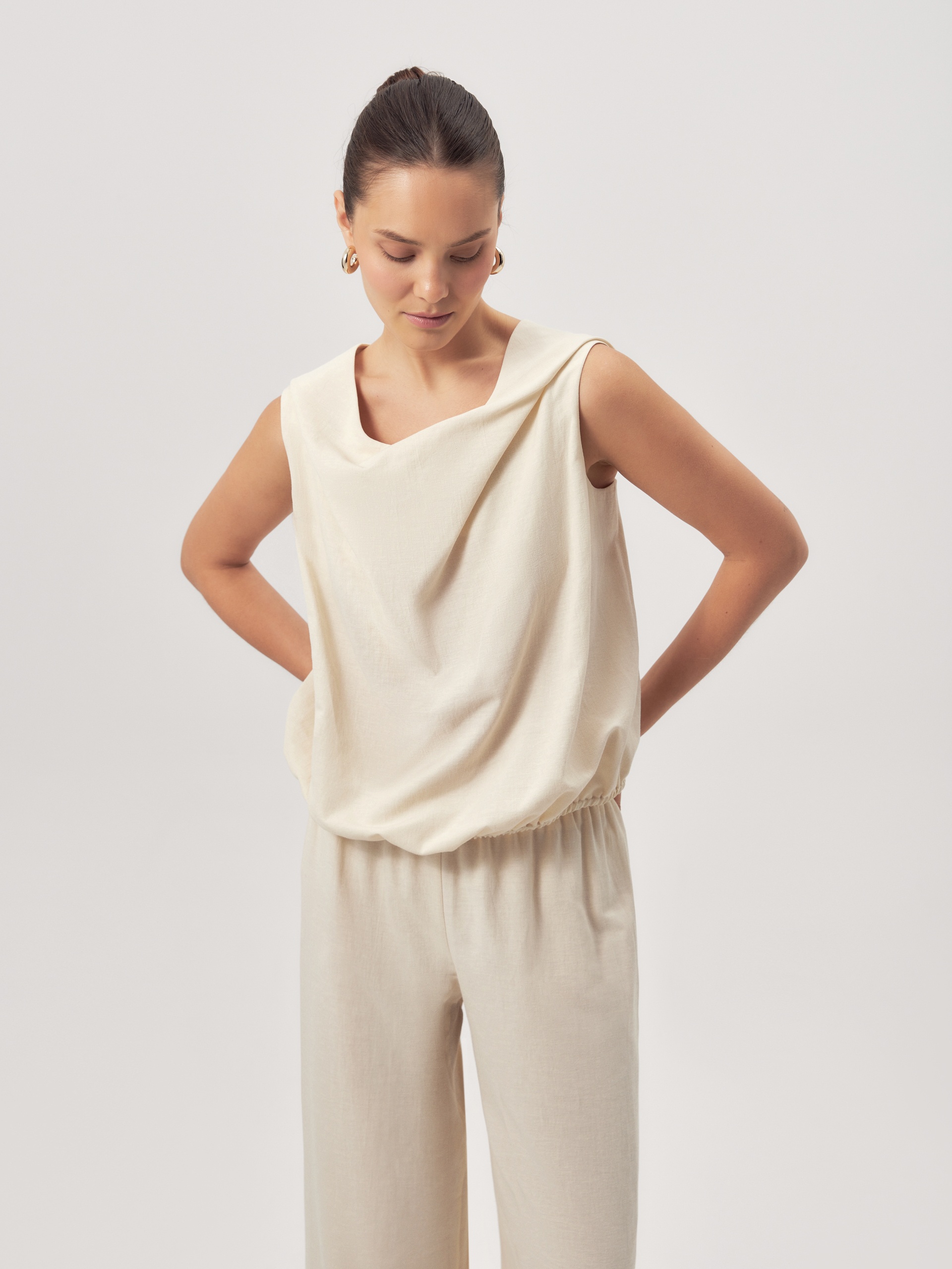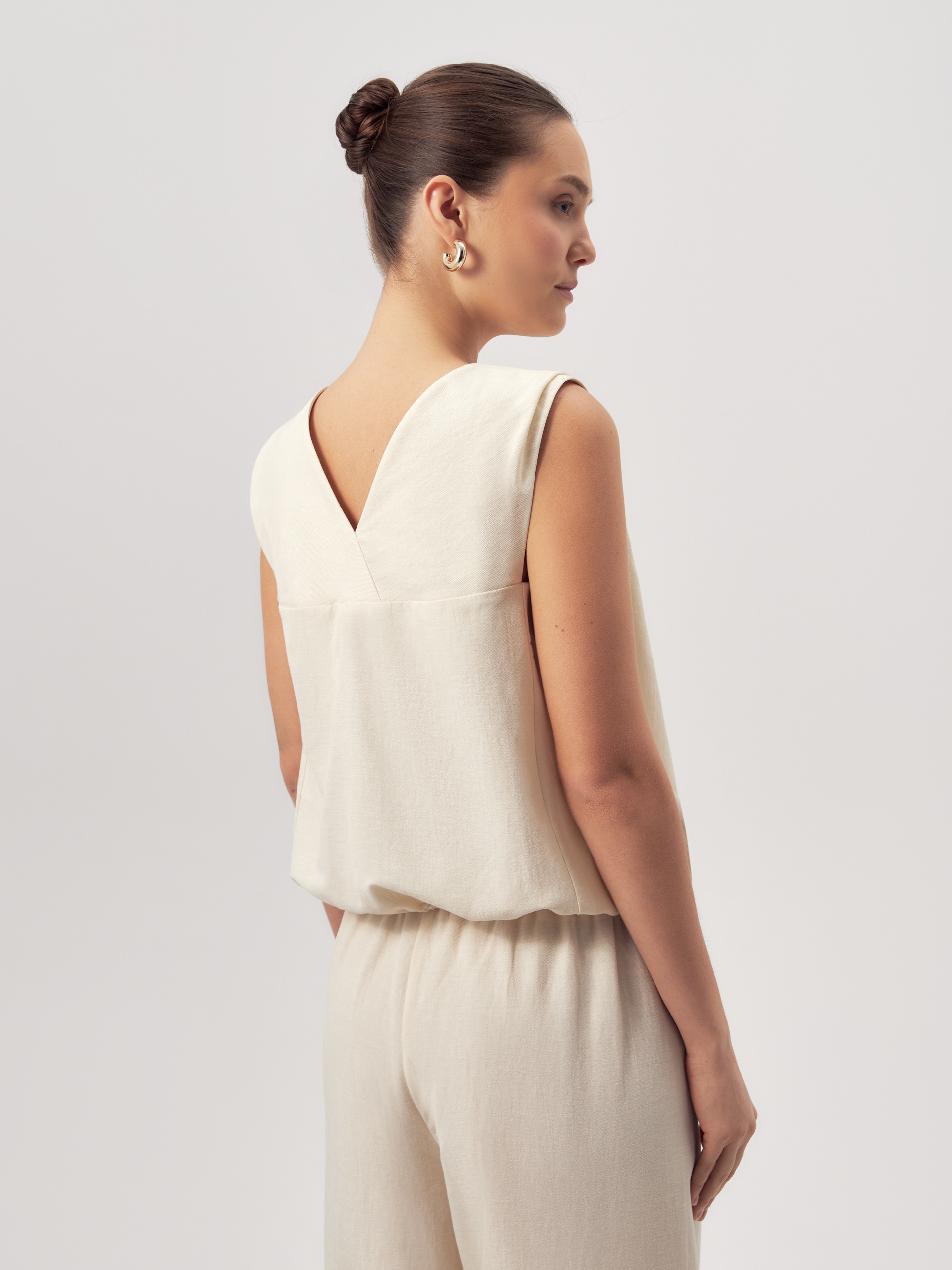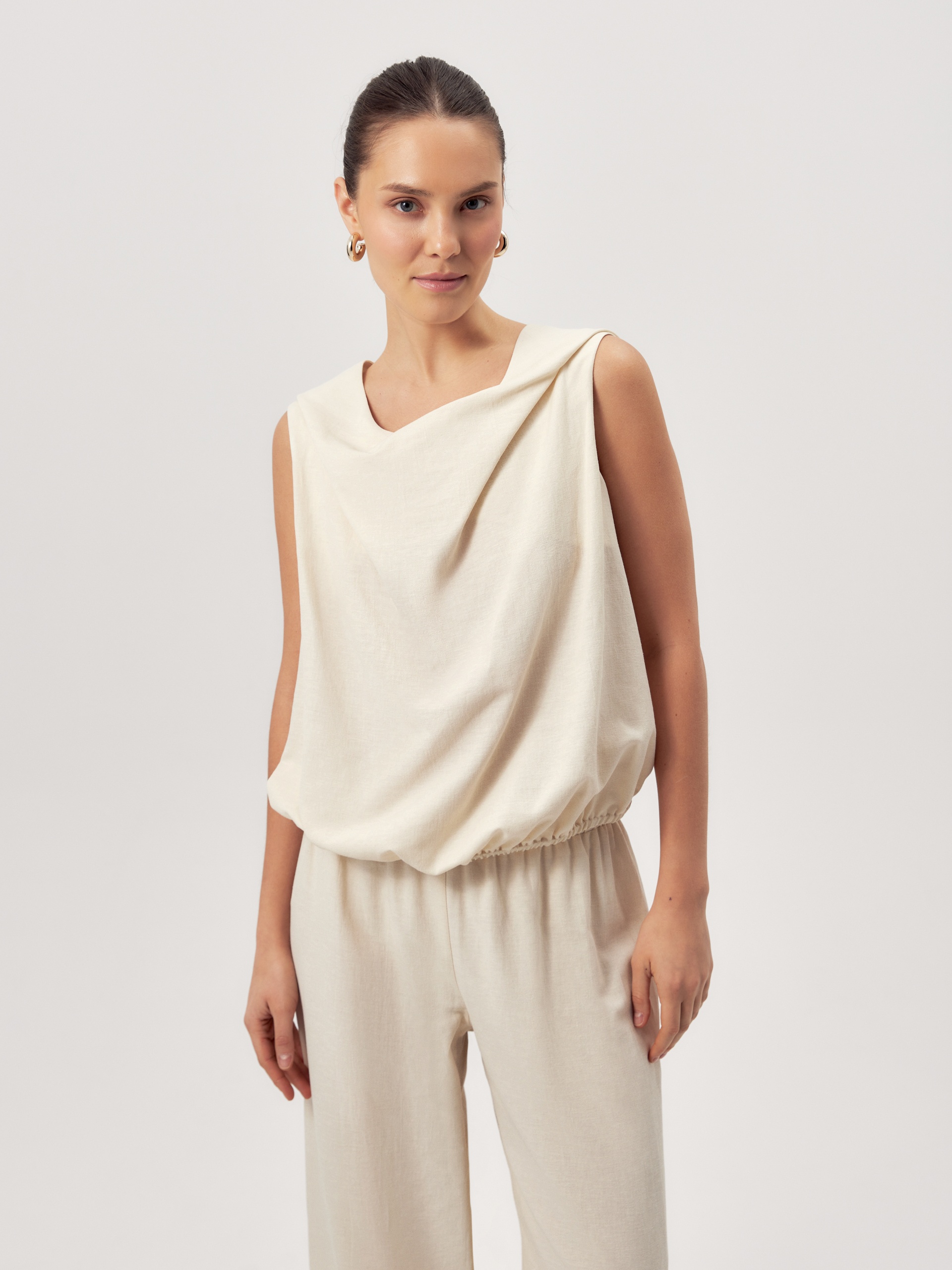 Свободная блуза из смесовой хлопковой ткани сливочного цвета с круглым вырезом на полочке и V-образным на спинке. По низу идет резинка.