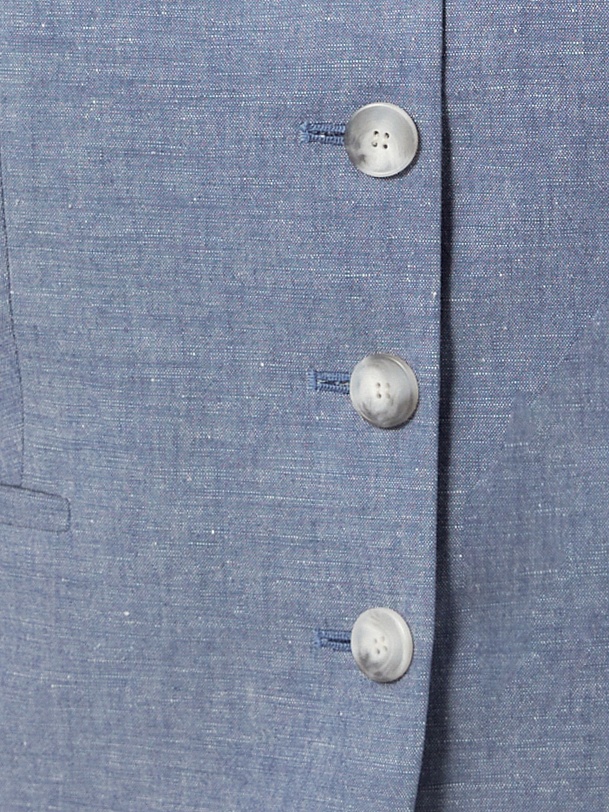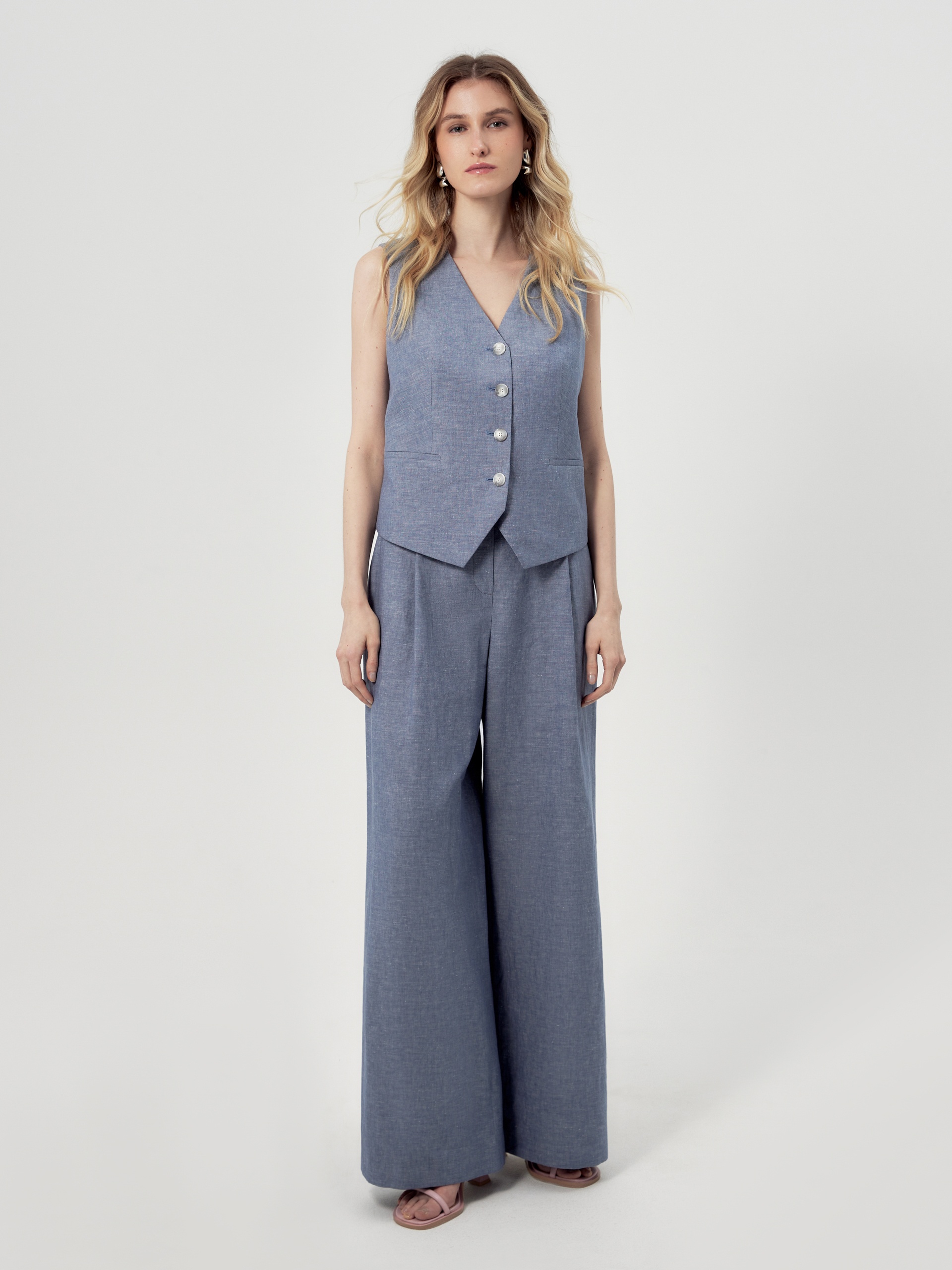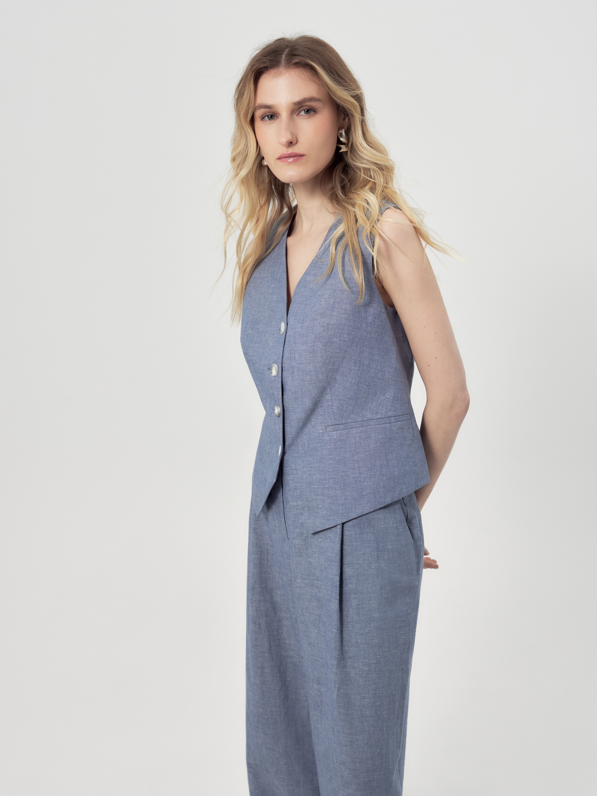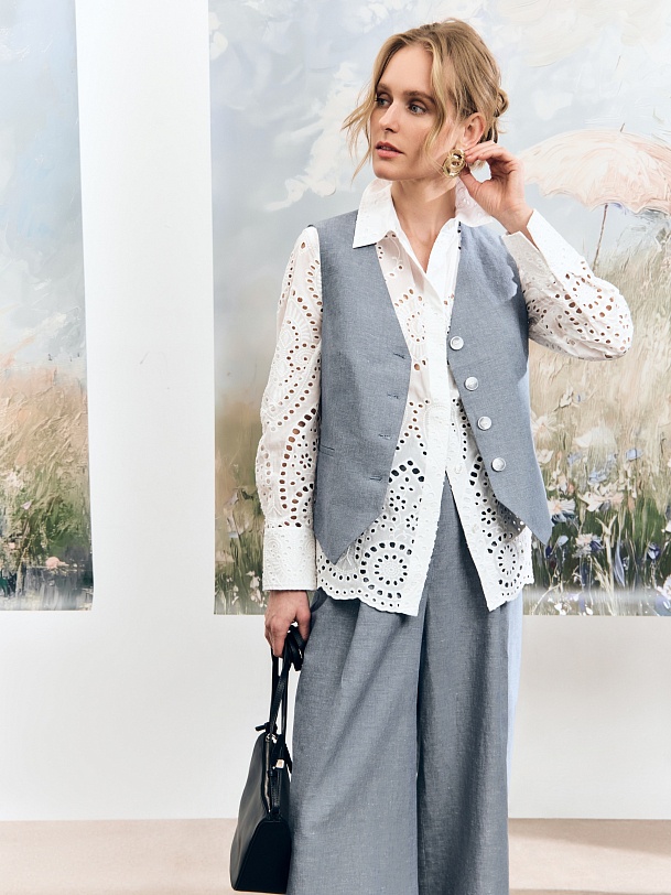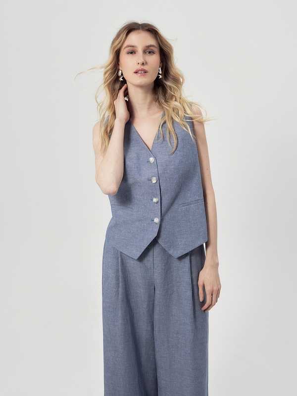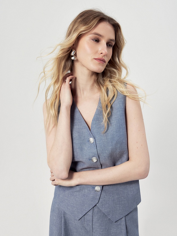 Прямой жилет с V-образным вырезом и листочками. Жилет выполнен из натуральной костюмной ткани в цвете голубой туман.