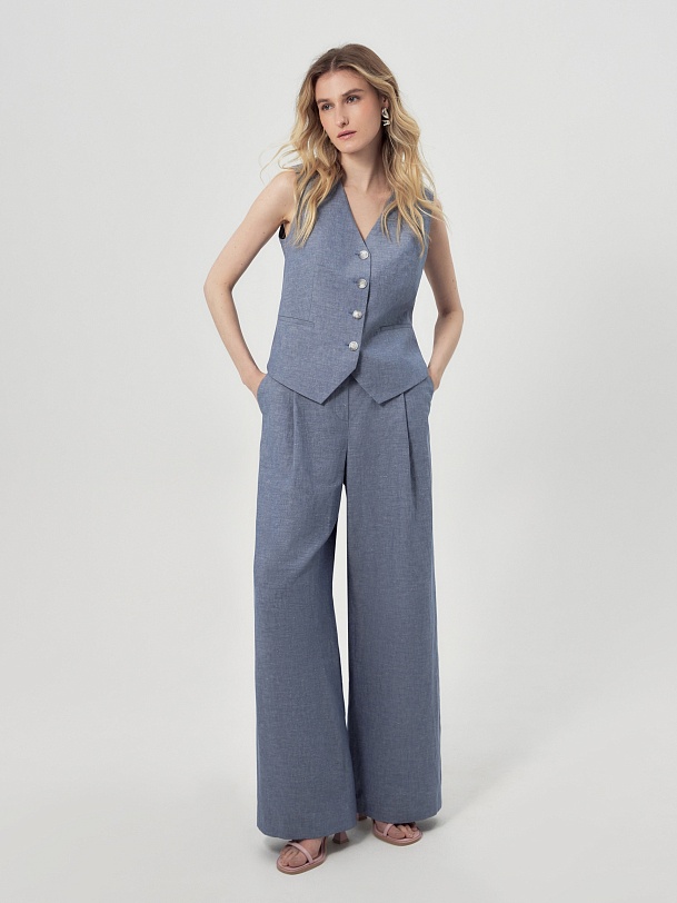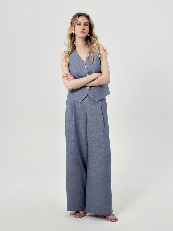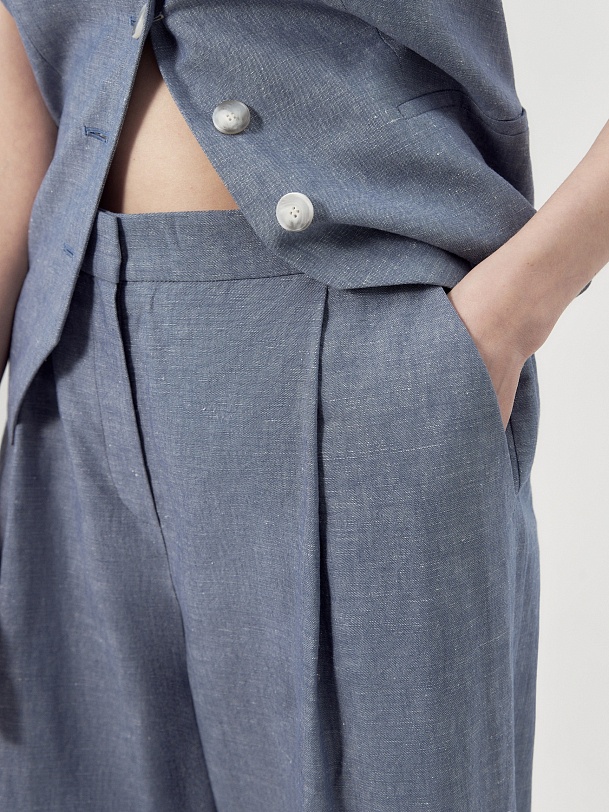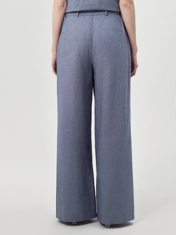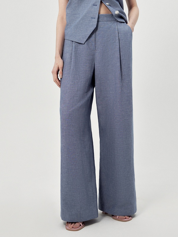Широкие брюки со складками на притачном поясе со шлевками из натуральной костюмной ткани в цвете голубой туман. Брюки с классическими боковыми карманами и листочками на спинке.