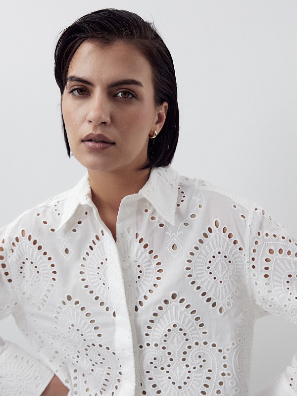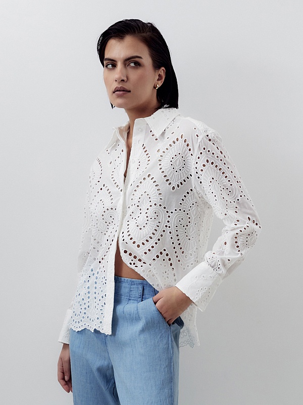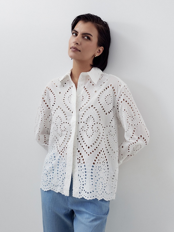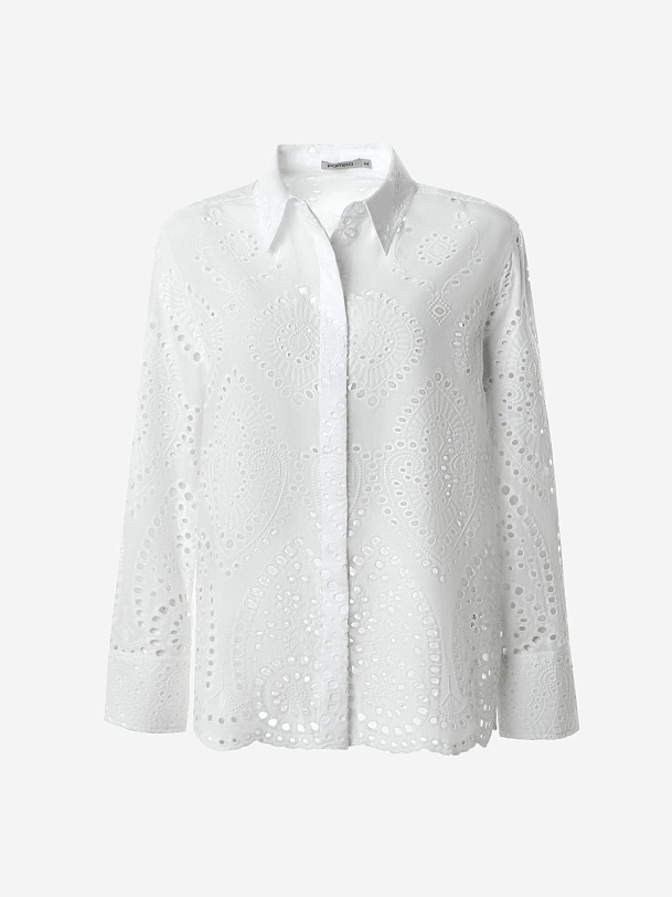 Женственная прямая блуза выполнена из 100% хлопка в техники "шитье", классический отложной воротник с потайной планкой на спинки кокетка с бантовой складкой. Рукав втачной со спущенной линией плеча на широком манжете. Низ блузы с фестонами.