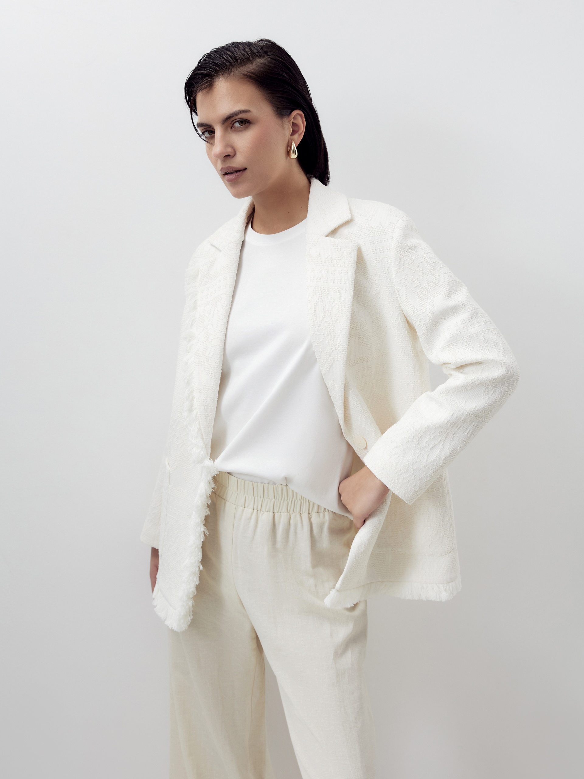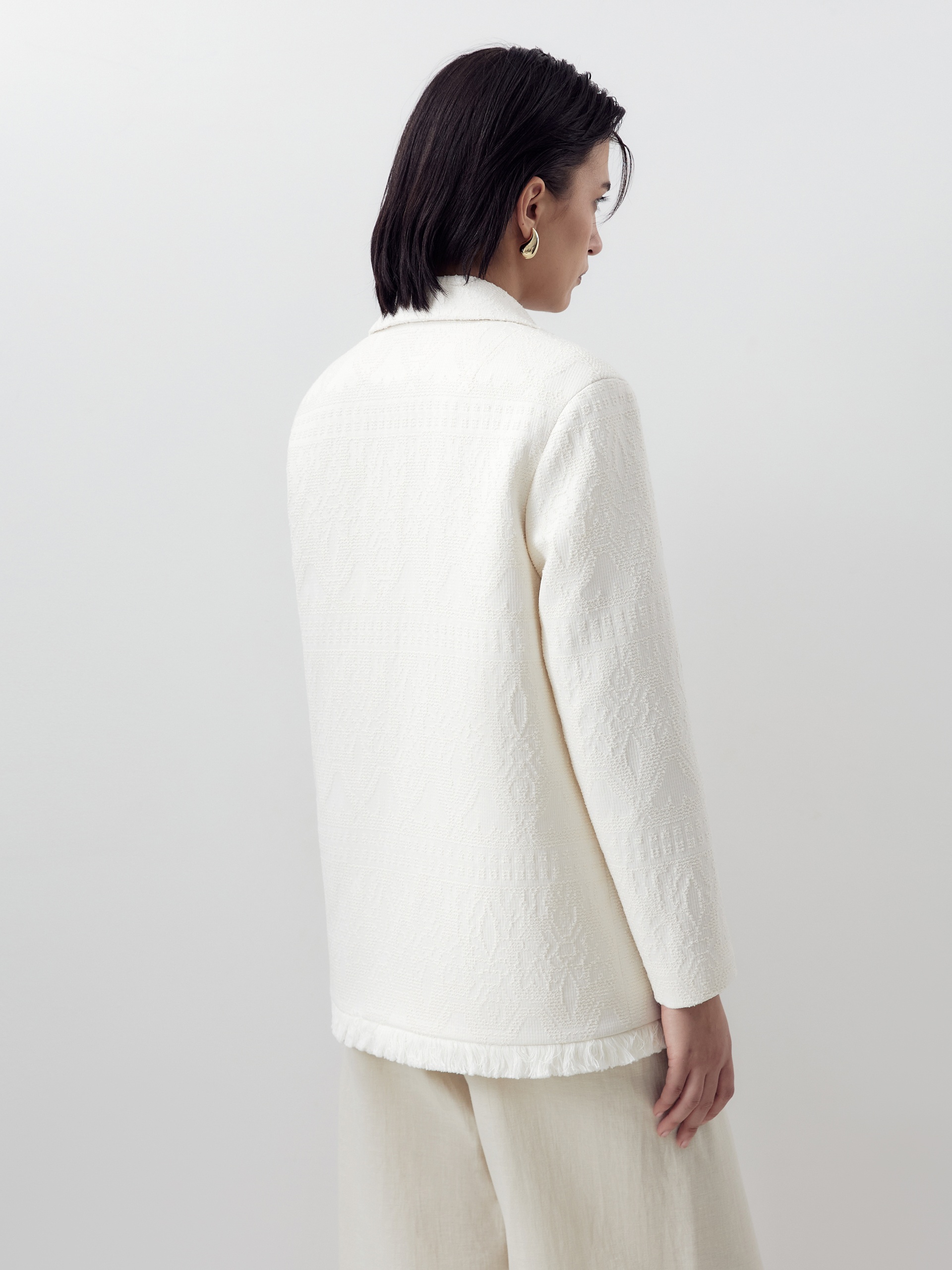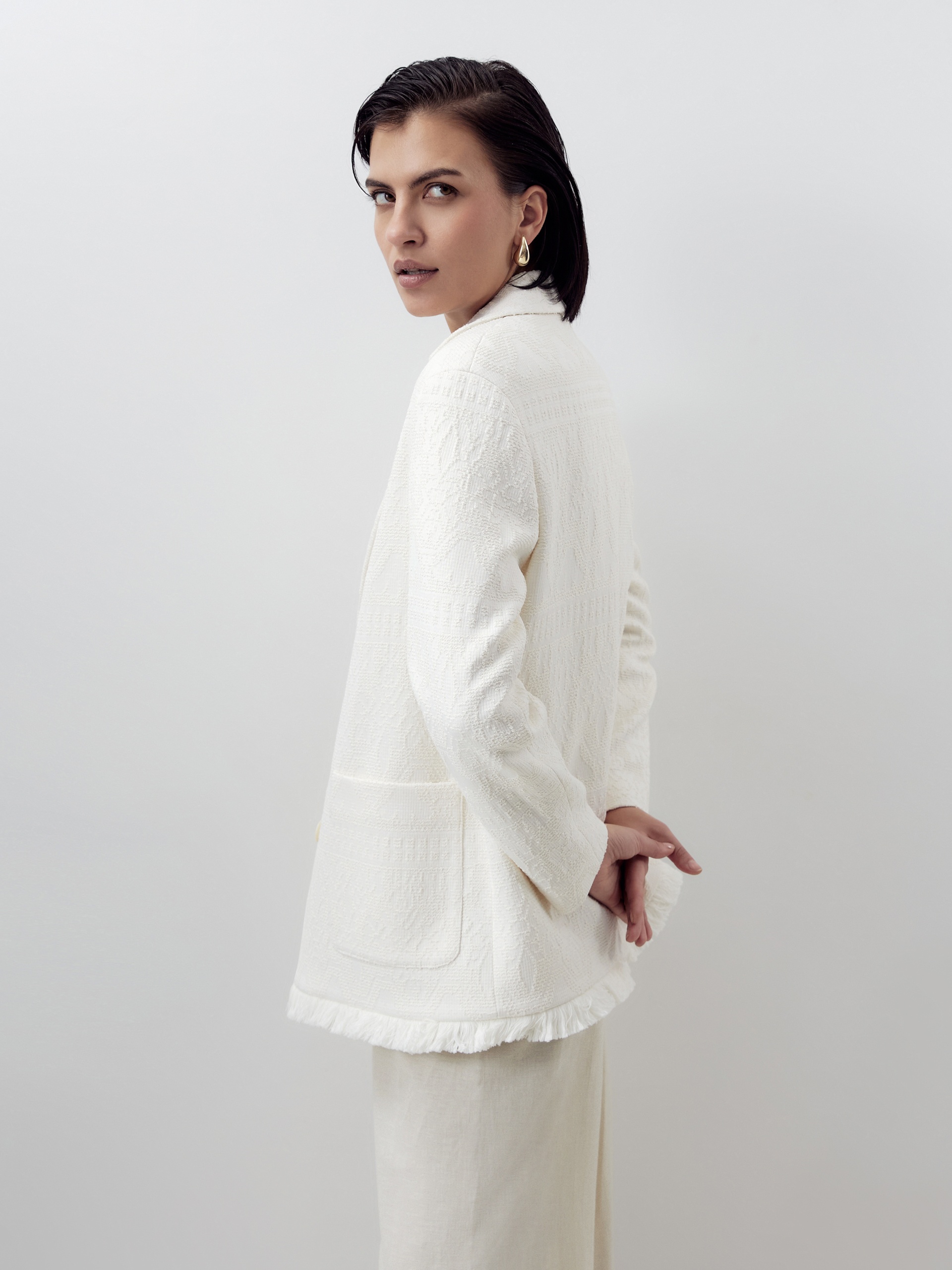 Женственный прямой однобортный жакет выполненный из буклированого хлопкового жаккарда. Плечо у жакета мягкое немного спущенное, вырез горловины V-образный с английским воротником. На лацкан, борт и низ жакета была добавлена бахрома, что придает большей расслабленности и мягкости вашему образу. На полочке есть два накладных кармана.