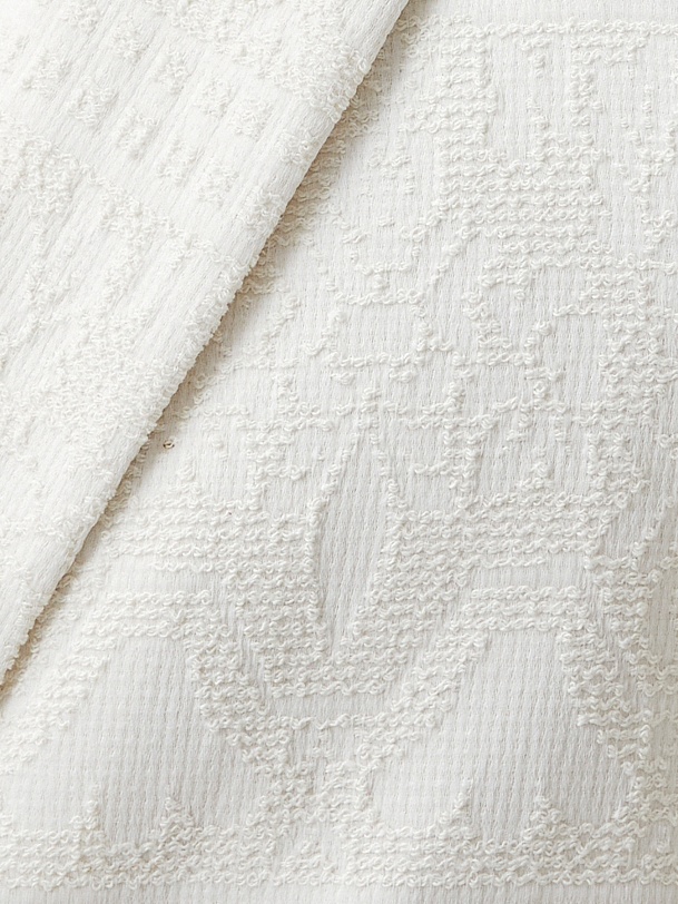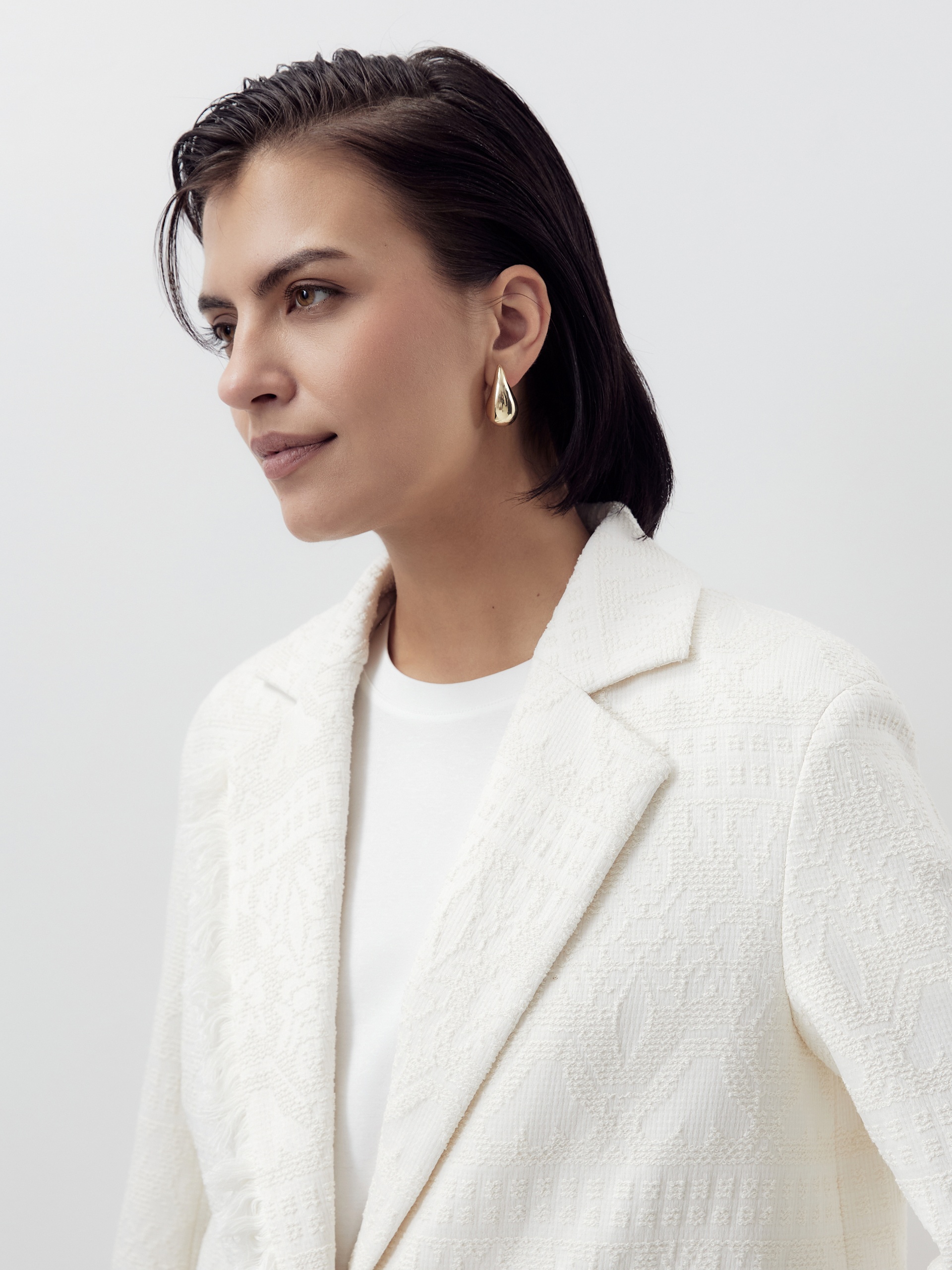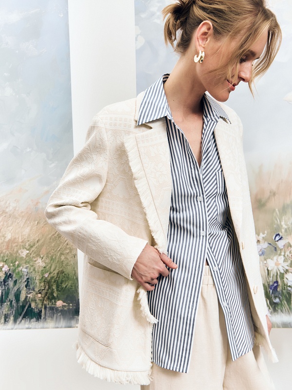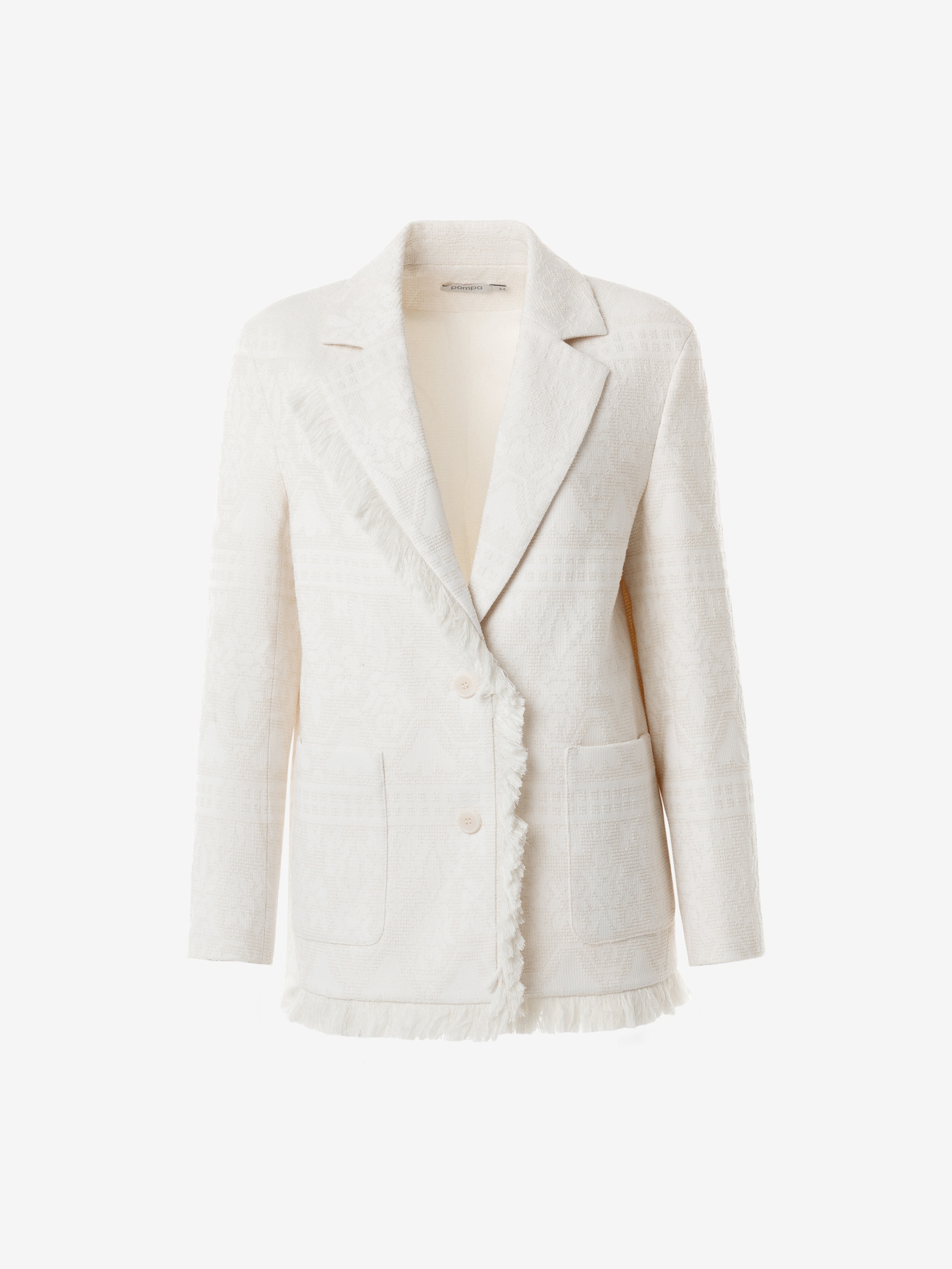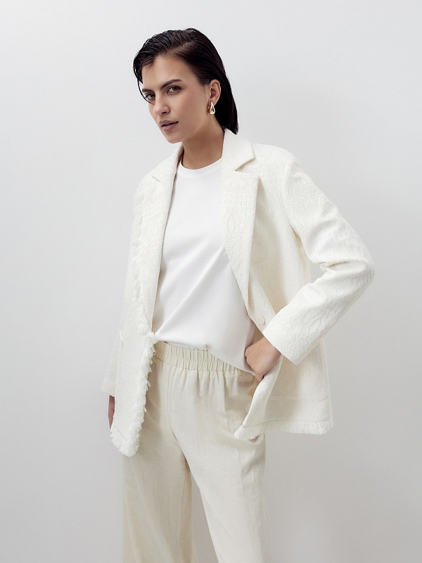 Женственный прямой однобортный жакет выполненный из буклированого хлопкового жаккарда. Плечо у жакета мягкое немного спущенное, вырез горловины V-образный с английским воротником. На лацкан, борт и низ жакета была добавлена бахрома, что придает большей расслабленности и мягкости вашему образу. На полочке есть два накладных кармана.
