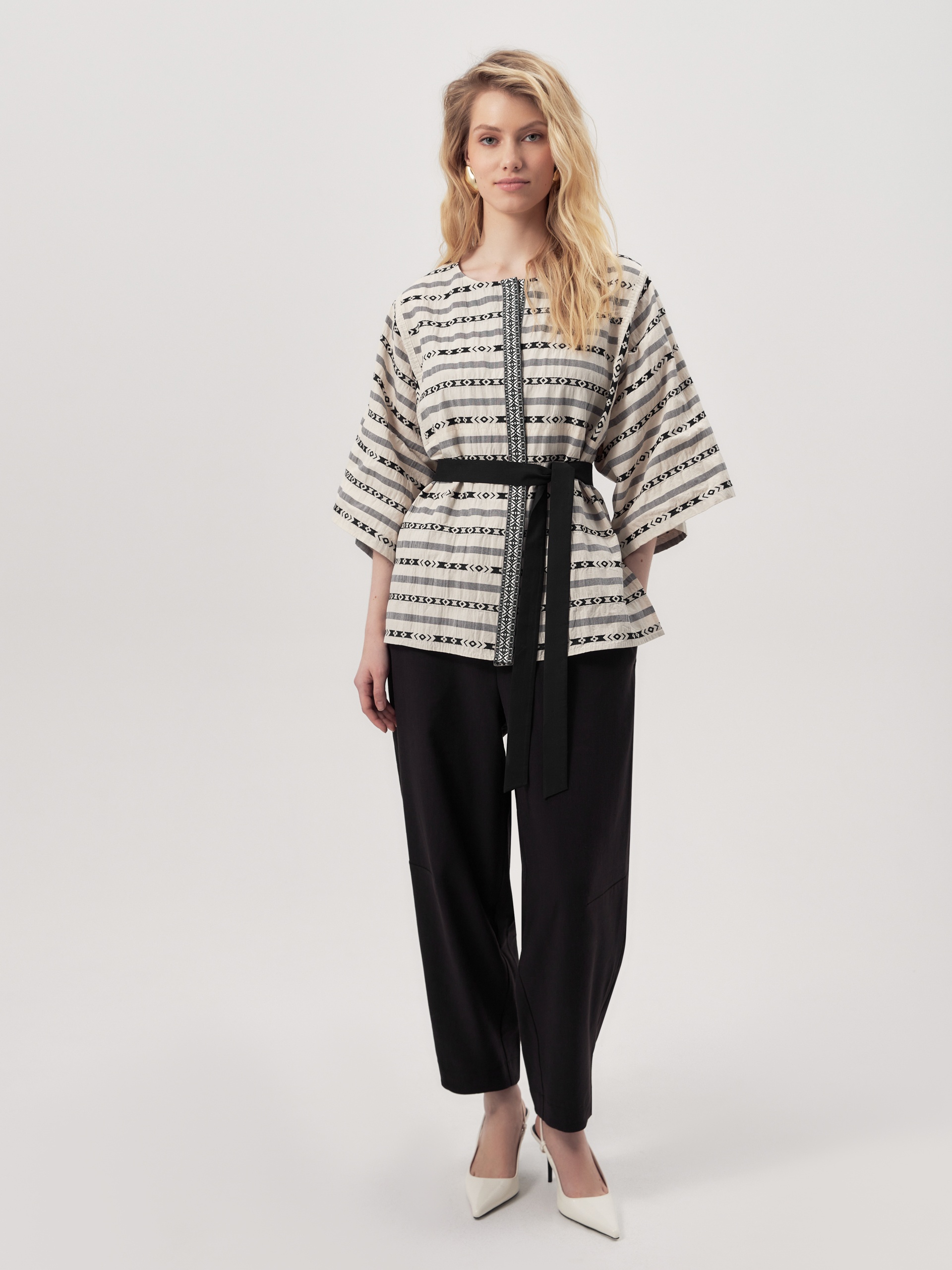 Прямой жакет с застежкой на пришивные пуговицы с круглой горловиной и широким укороченным рукавом кимоно. В комплект входит пояс из отделочной ткани. По бокам есть разрезы. В комплекте с черными летними брюками станет изысканным повседневным решением.