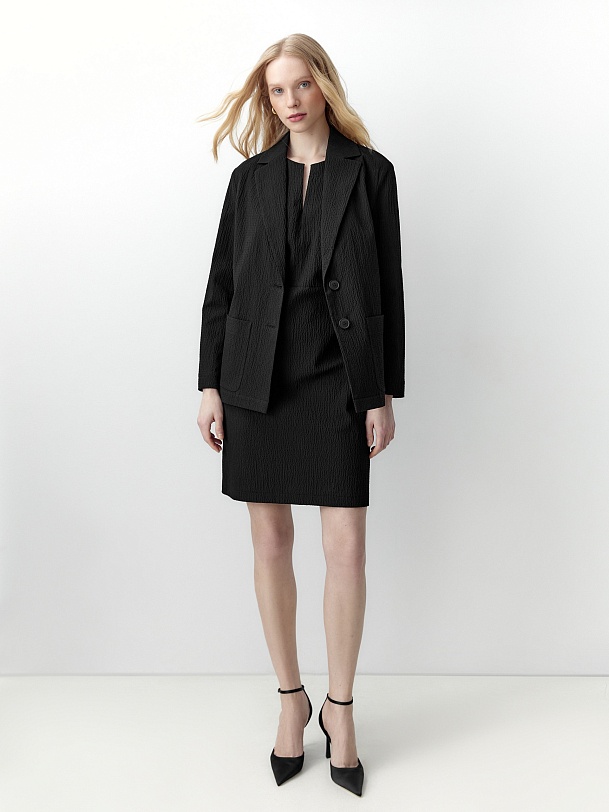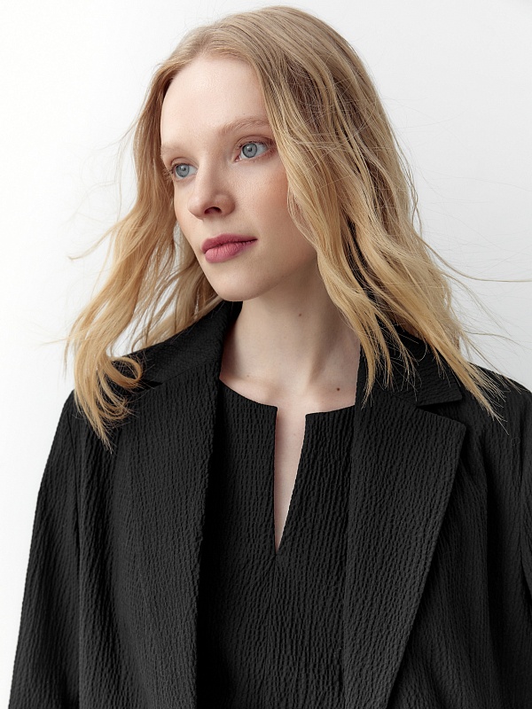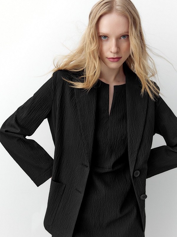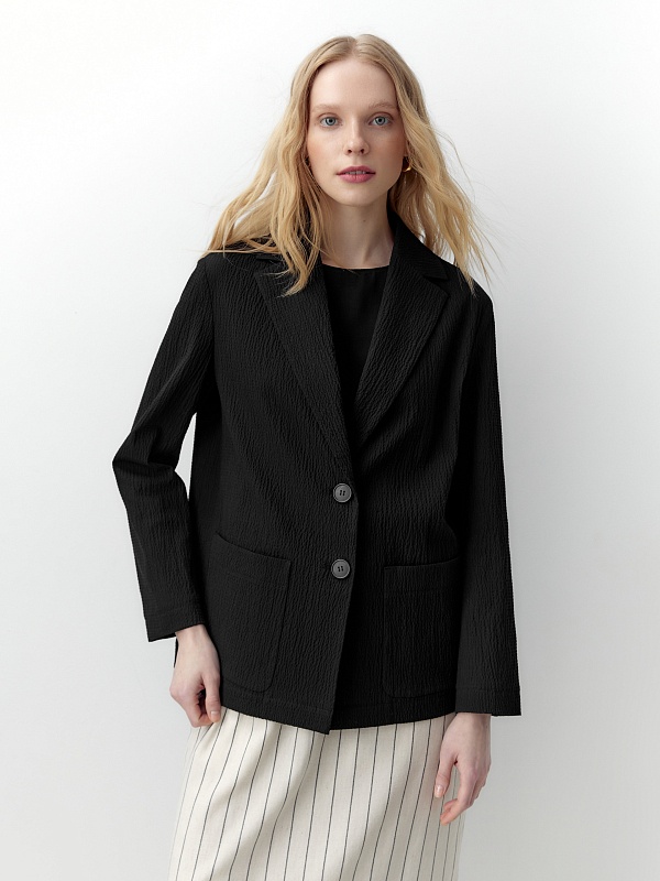 Жакет имеет втачные рукава и накладные карманы. Английский воротник и V-образный вырез визуально вытягивают линию шеи, формируя собранный и утончённый образ. Насыщенный чёрный цвет подчеркивает строгость силуэта и создаёт неограниченные возможности для формирования образов разной стилистики.