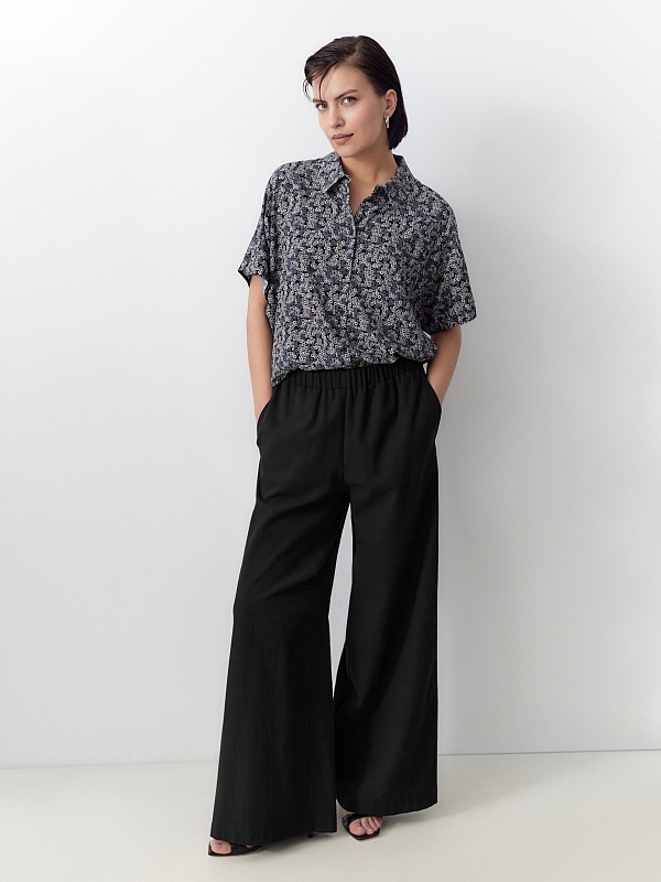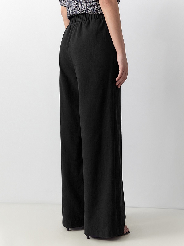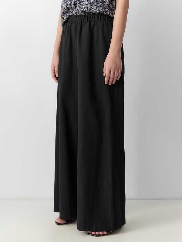 Брюки из хлопковой ткани черного цвета с добавлением льна, свободного силуэта расклешенные к низу на поясе с резинкой, в боковых швах потайные карманы. Брюки полной длины.