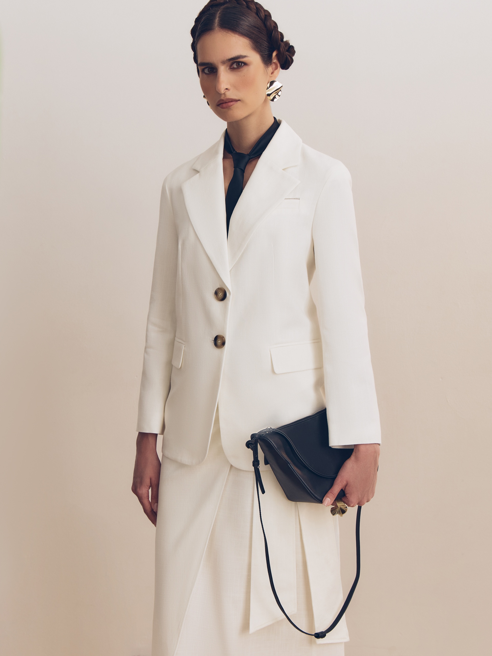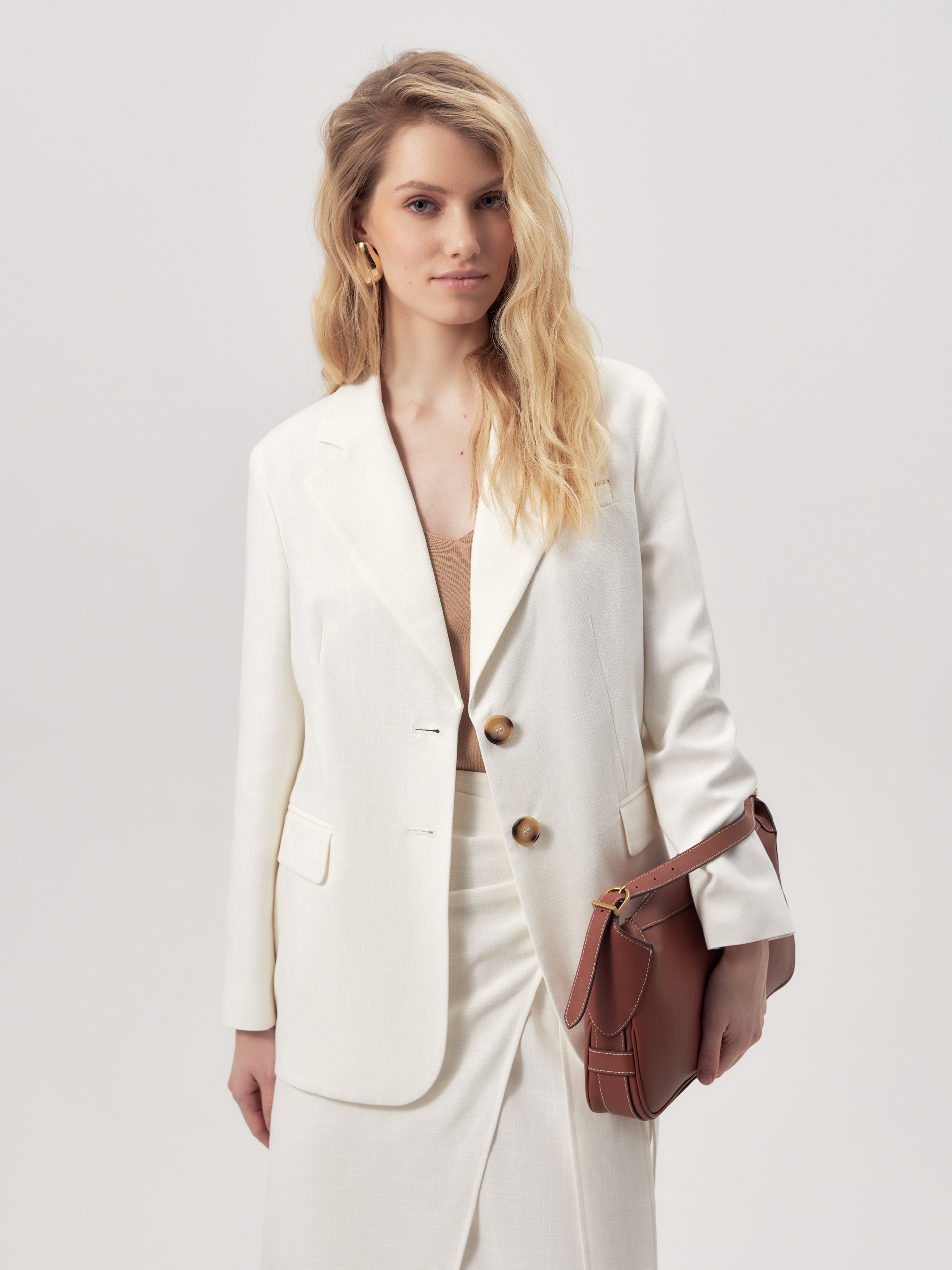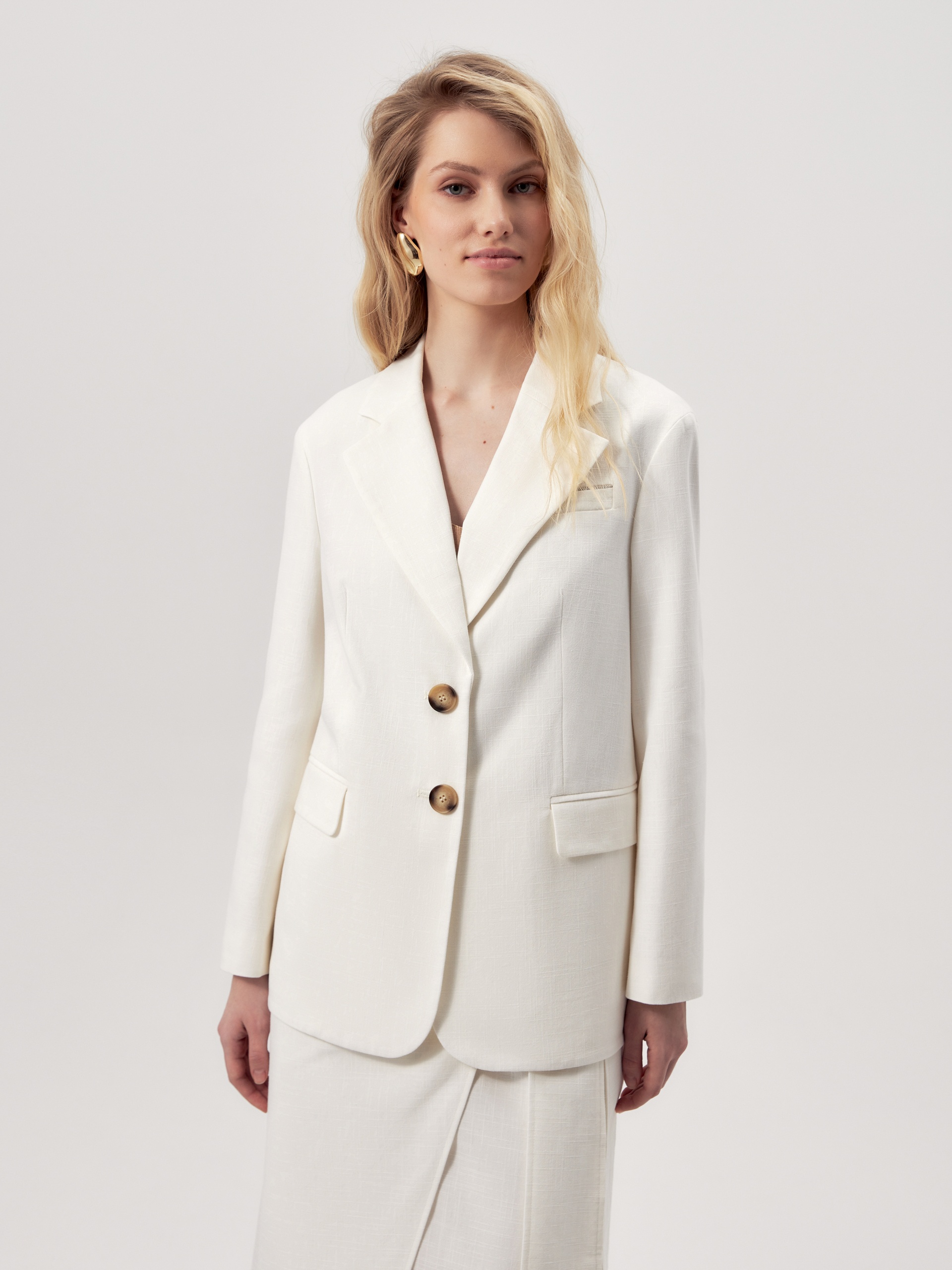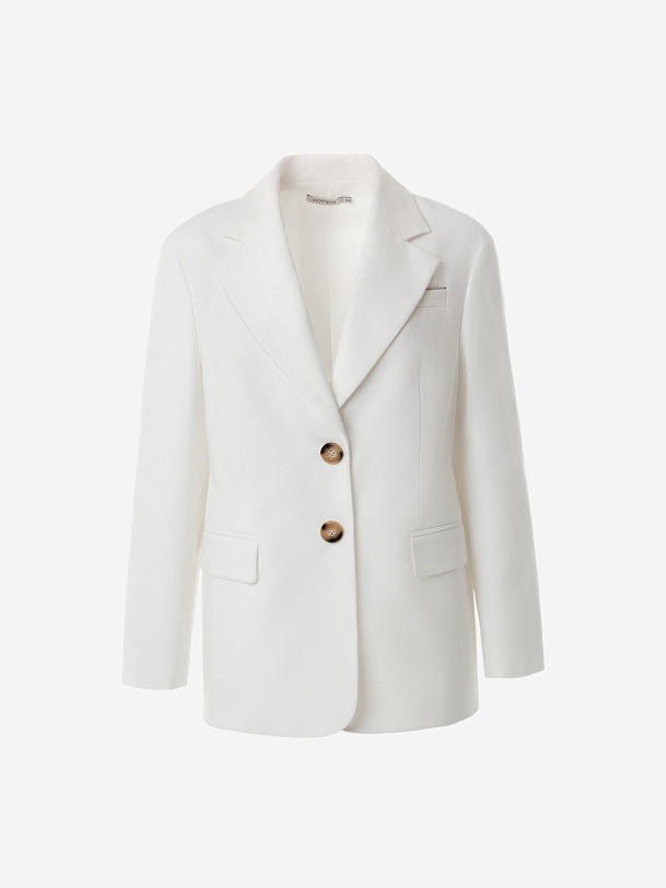 Прямой однобортный жакет из фактурной хлопковой костюмной ткани белого цвета c прорезными карманами с клапанами, на груди листочка и декоративным элементом "мониль". Рукав втачной со спущенной линией плеча. Жакет полностью на подкладке.