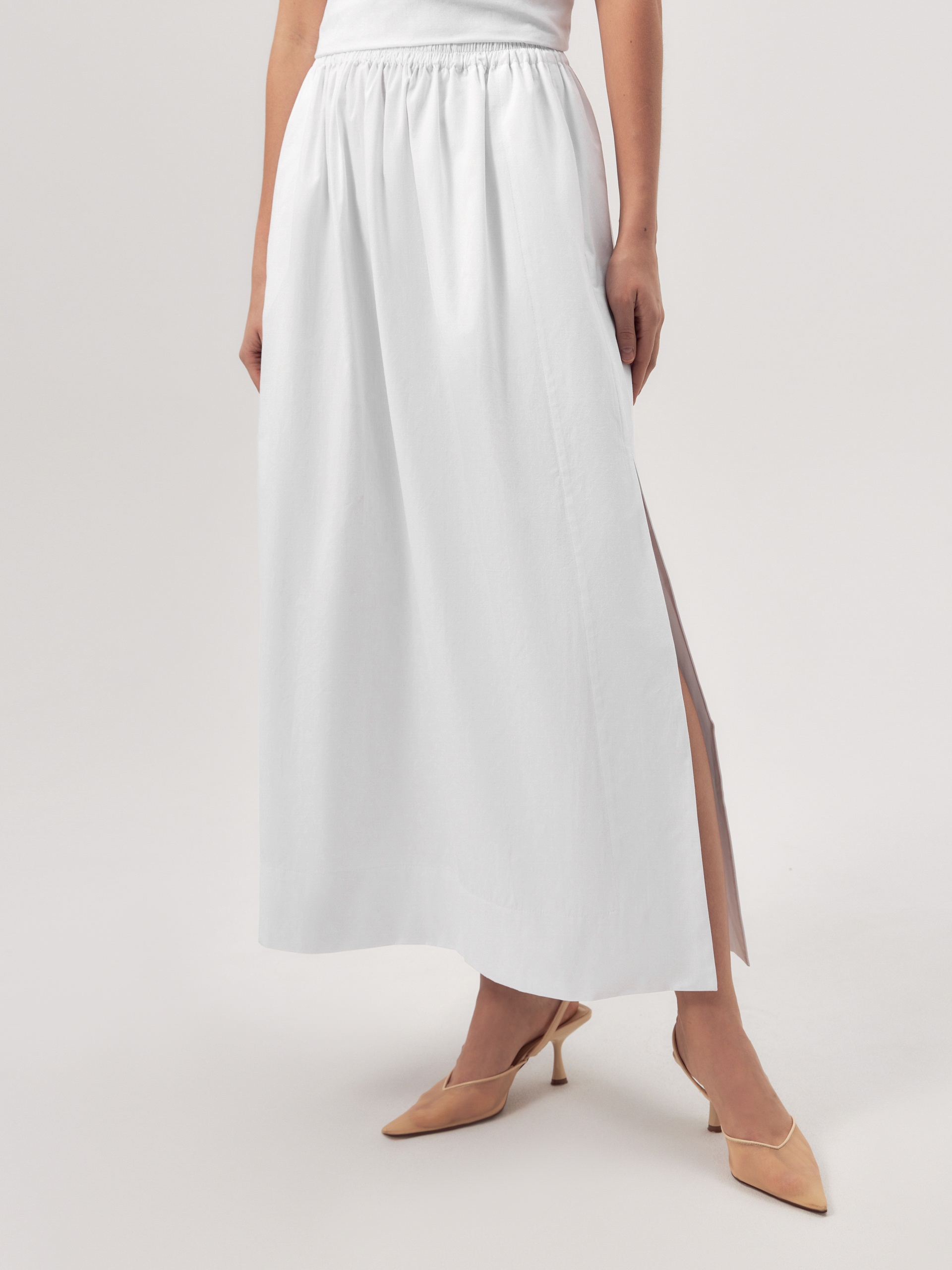 Трендовая юбка трапеция макси на резинке выполнена из 100% хлопка белого цвета. По бокам высокие разрезы, есть карманы во швах. Низ с широкой подгибкой. Эта юбка станет идеальным выбором для летнего образа, сочетая в себе комфорт и стиль.