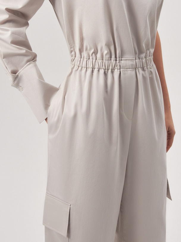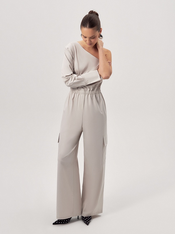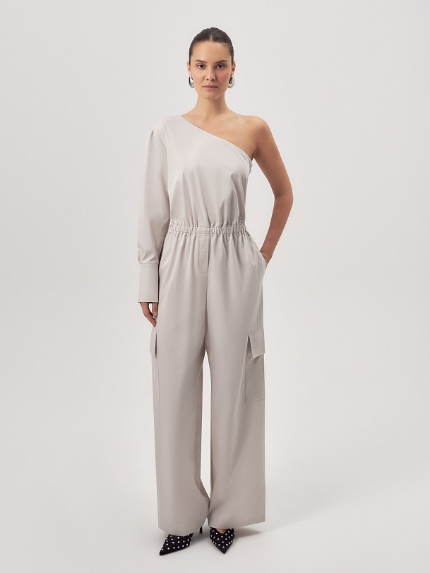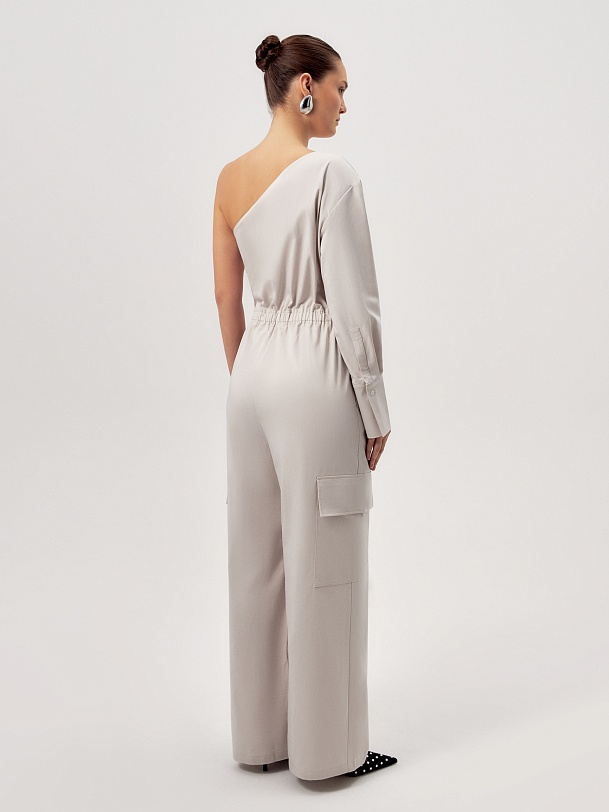 Комбинезон в стиле smart casual привлекает внимание асимметричным кроем с акцентом на одно плечо, создавая элегантный и современный силуэт. Эластичная резинка по линии талии мягко фиксирует посадку, обеспечивая комфорт в течение дня, а потайная молния в боковом шве сохраняет лаконичность образа.