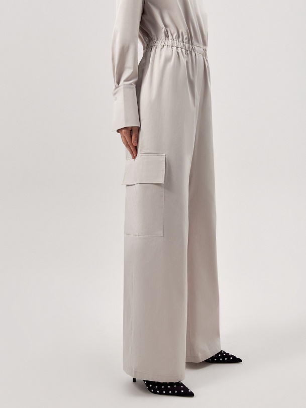 Широкие брюки с имитацией гульфика дополнены крупными накладными карманами, которые придают модели легкий утилитарный акцент. Потайные карманы в боковых швах добавляют практичности. Универсальный бежевый оттенок изделия создаёт неограниченные возможности для формирования образов разной стилистики.