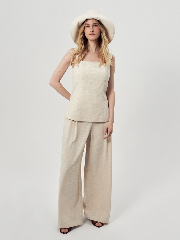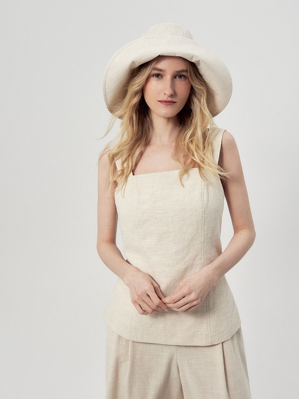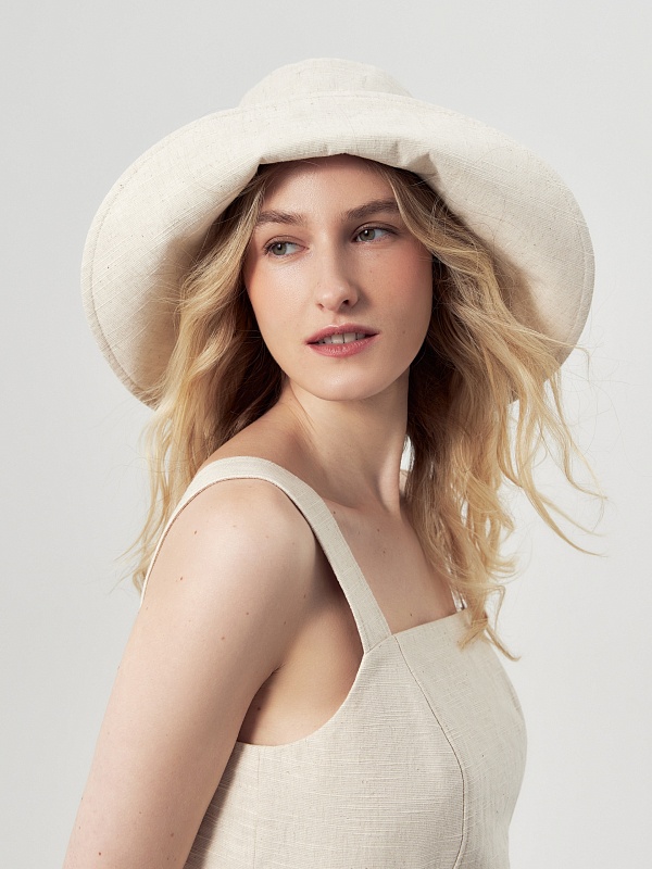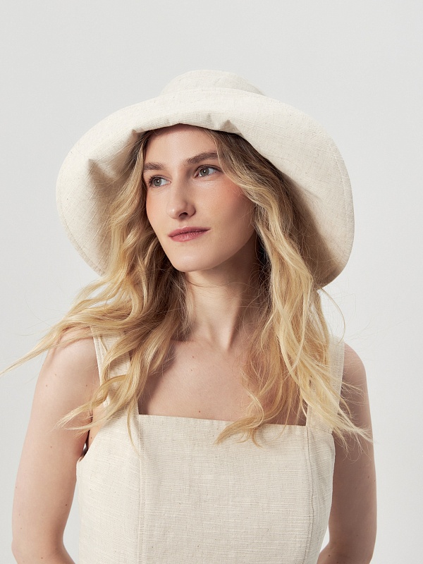 Панама из хлопковой ткани с добавлением льна бежевого цвета, есть потайная кнопка для создания разных образов.