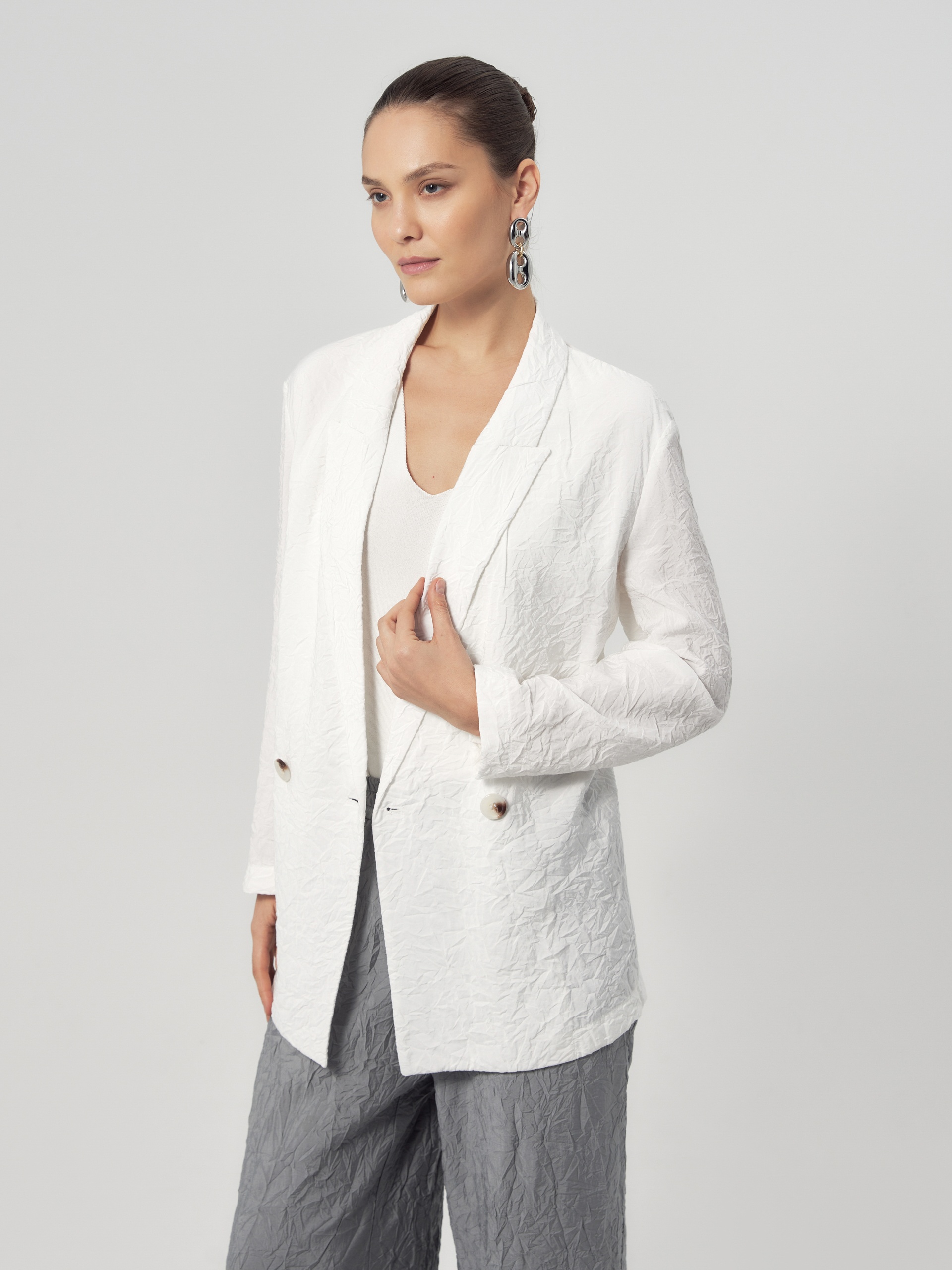 Летний двубортный жакет из жатой вискозной ткани с блеском белого цвета без подкладки, с классическим лацканом. Составил элегантный городской образ с брюками из одной ткани.