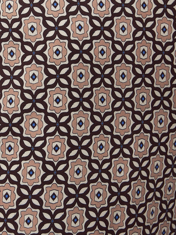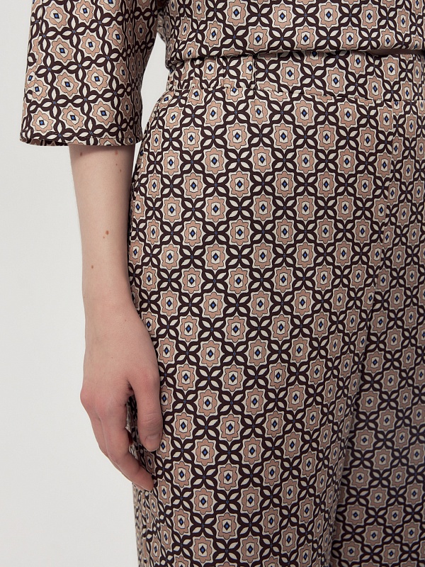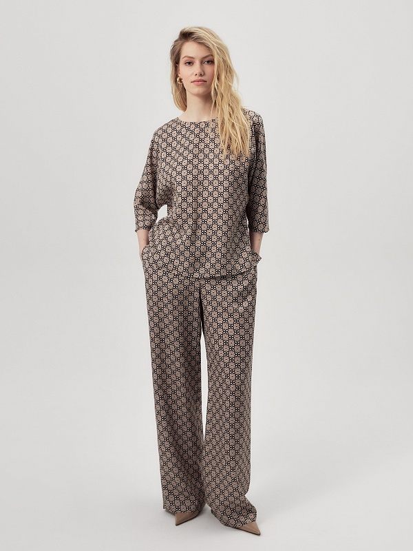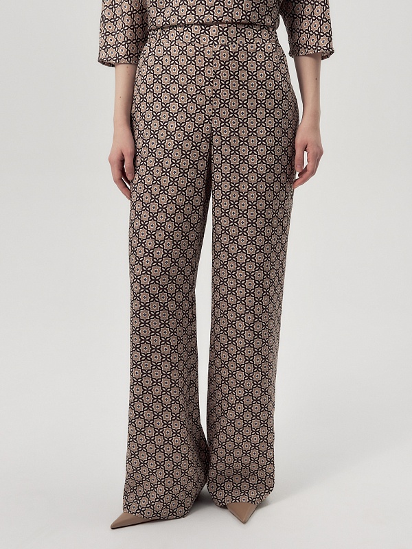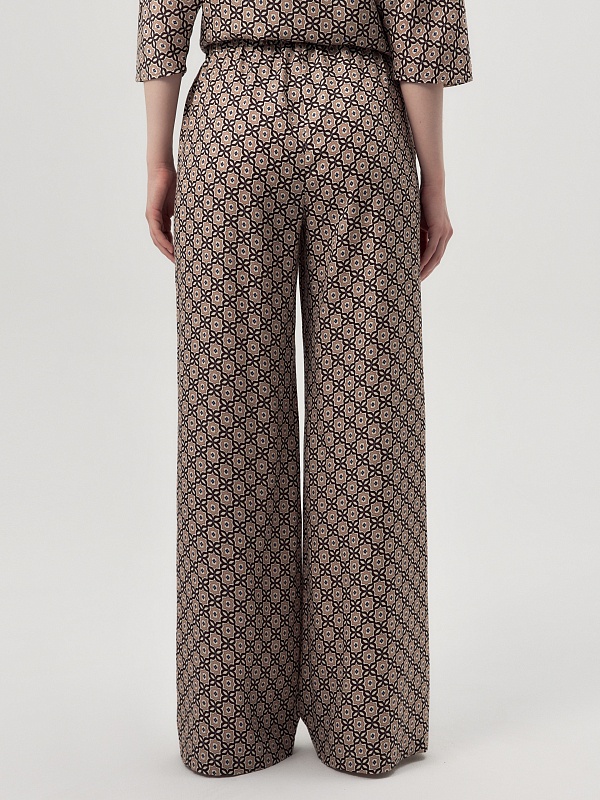 Прямые брюки из вискозной ткани в крупном галстучном принте на резинке. Карманы в боковых швах. В комплекте с блузой составит идеальный пижамный комплект.